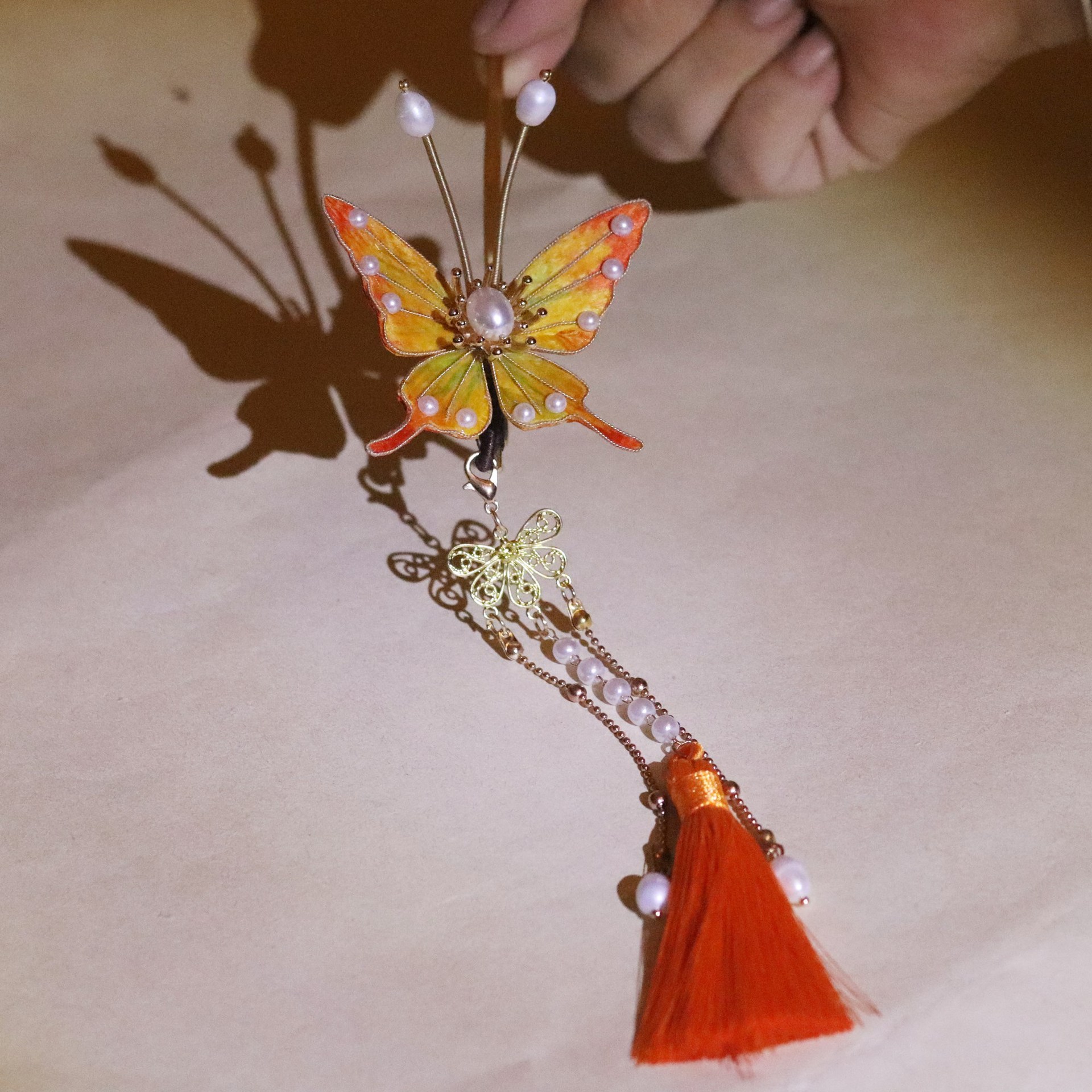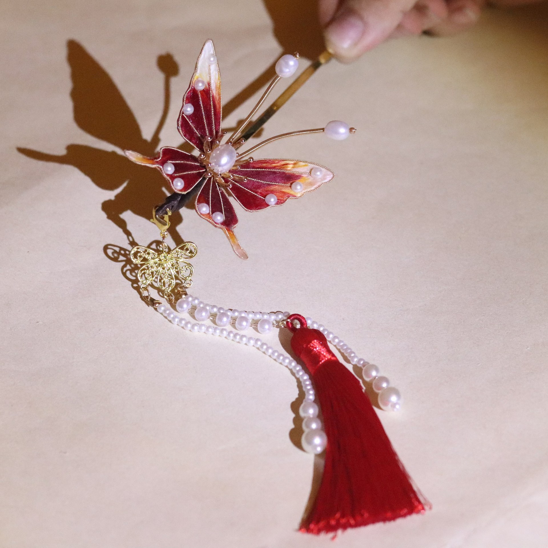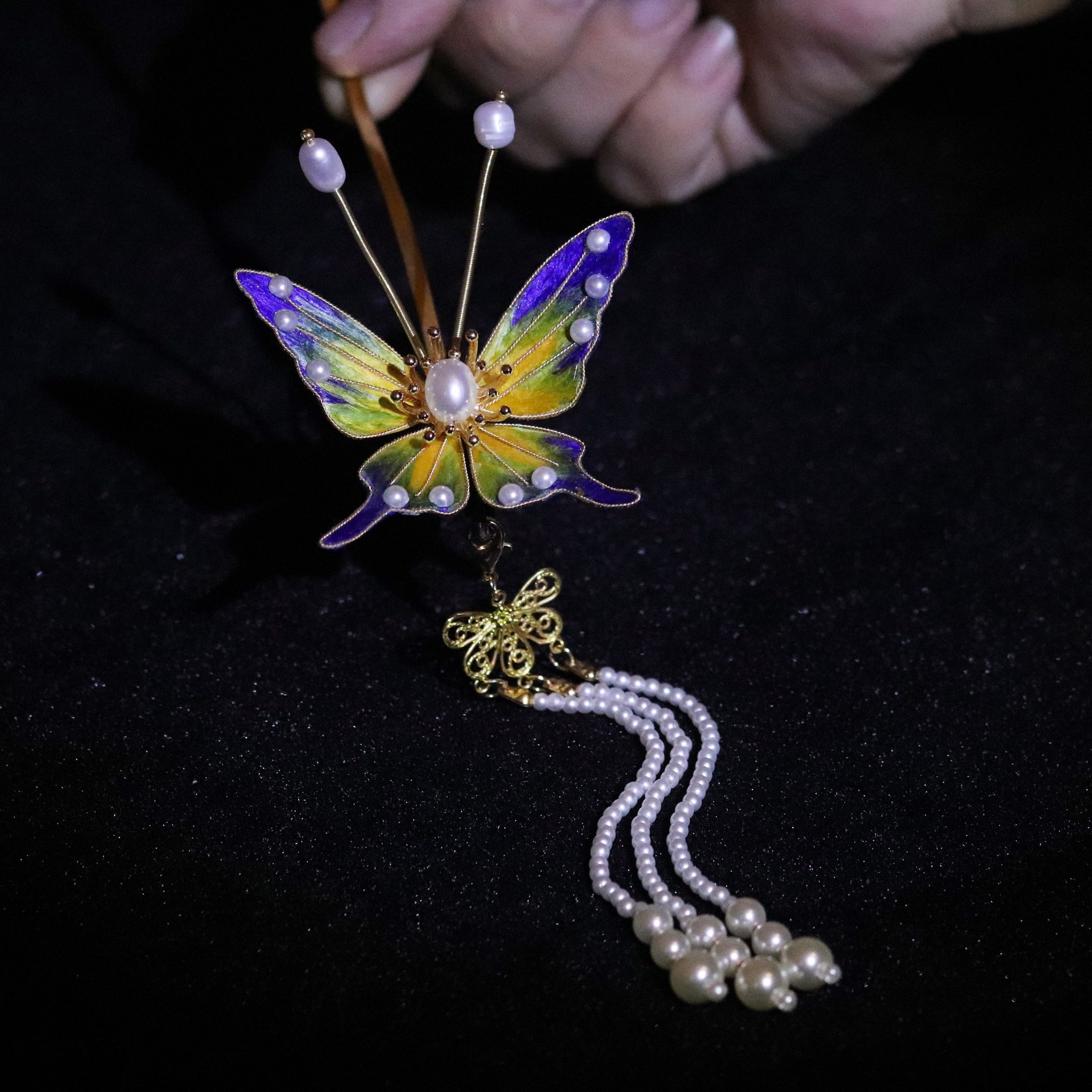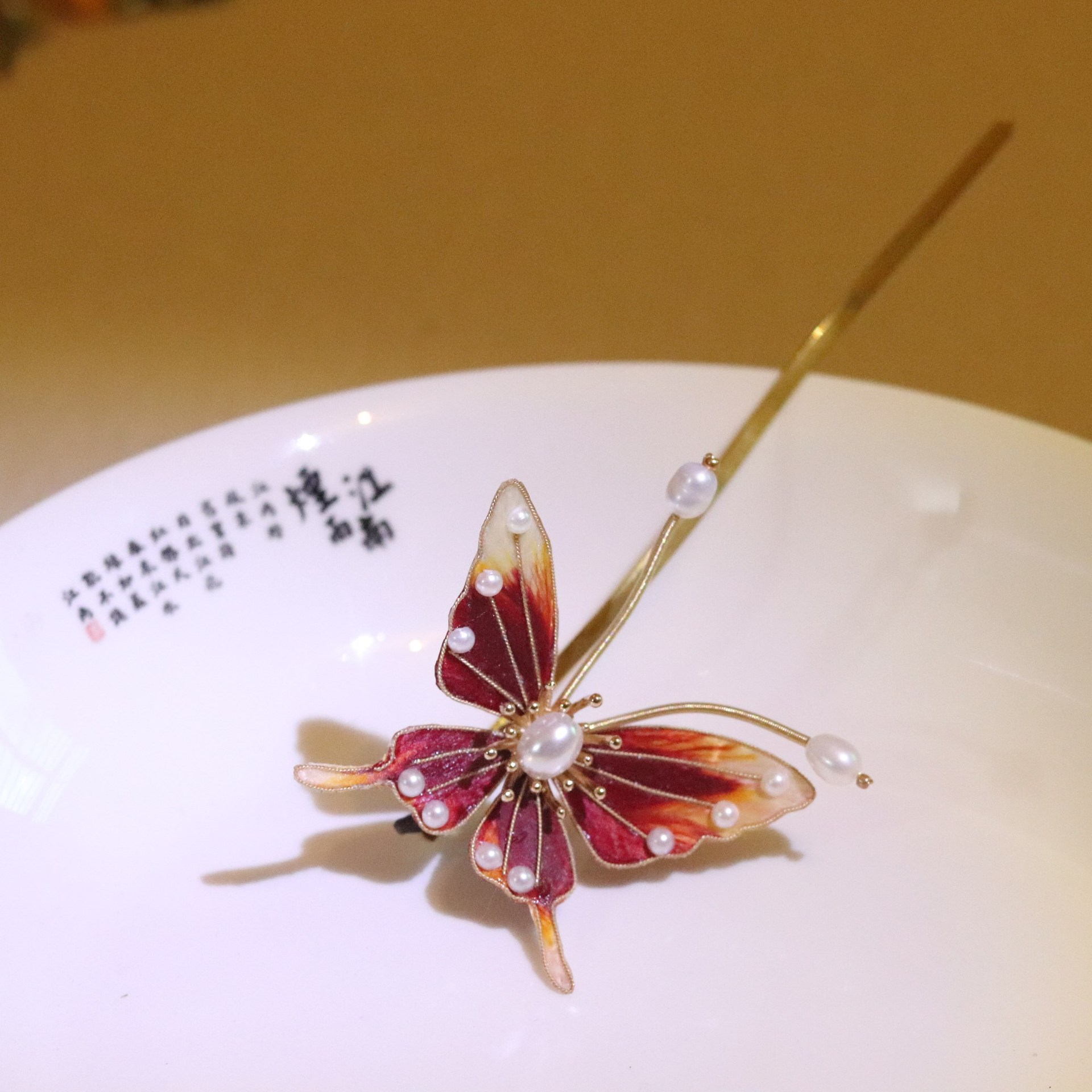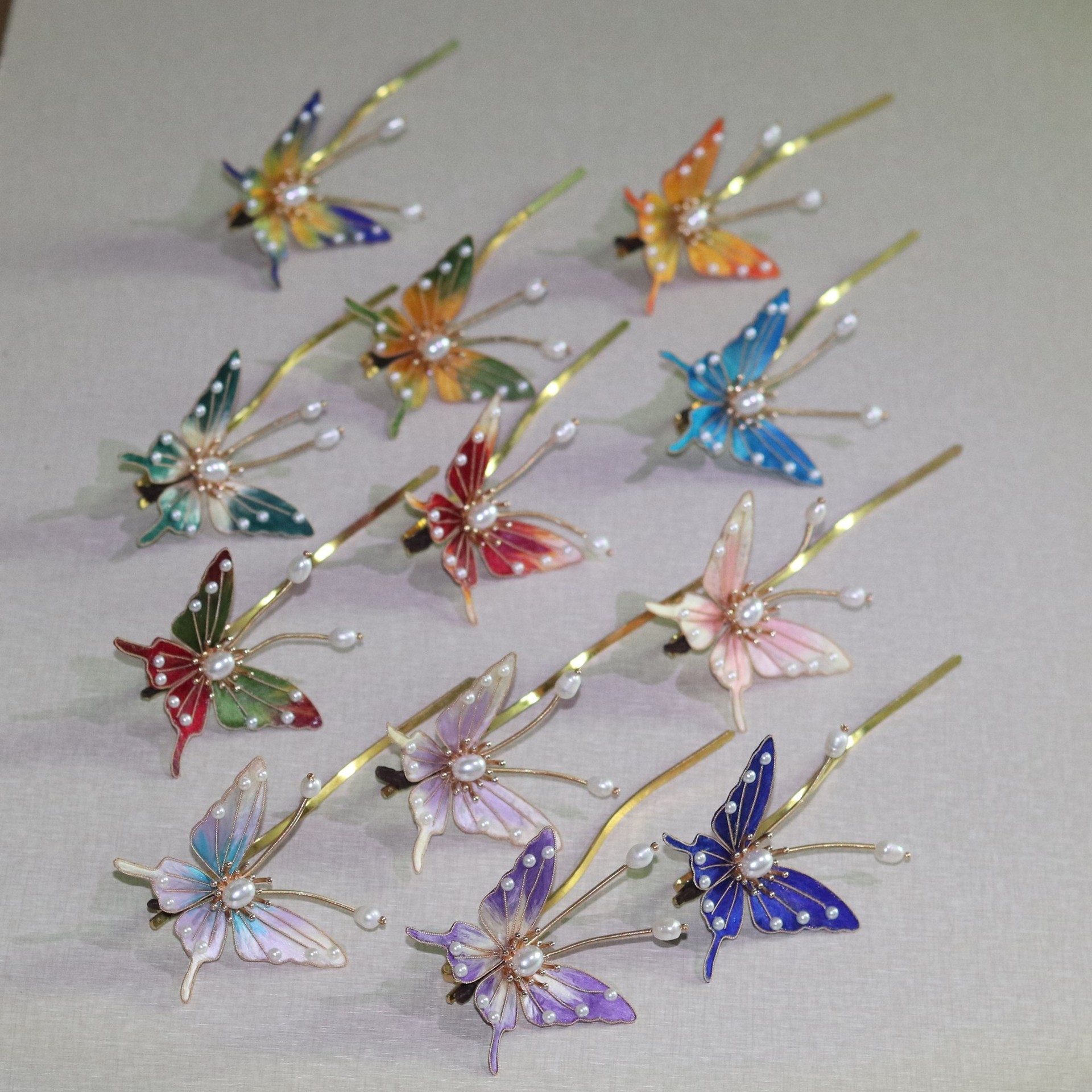 绒花掐丝蝴蝶蚕丝流苏发钗古风汉服配饰步摇简约头饰发簪饰品