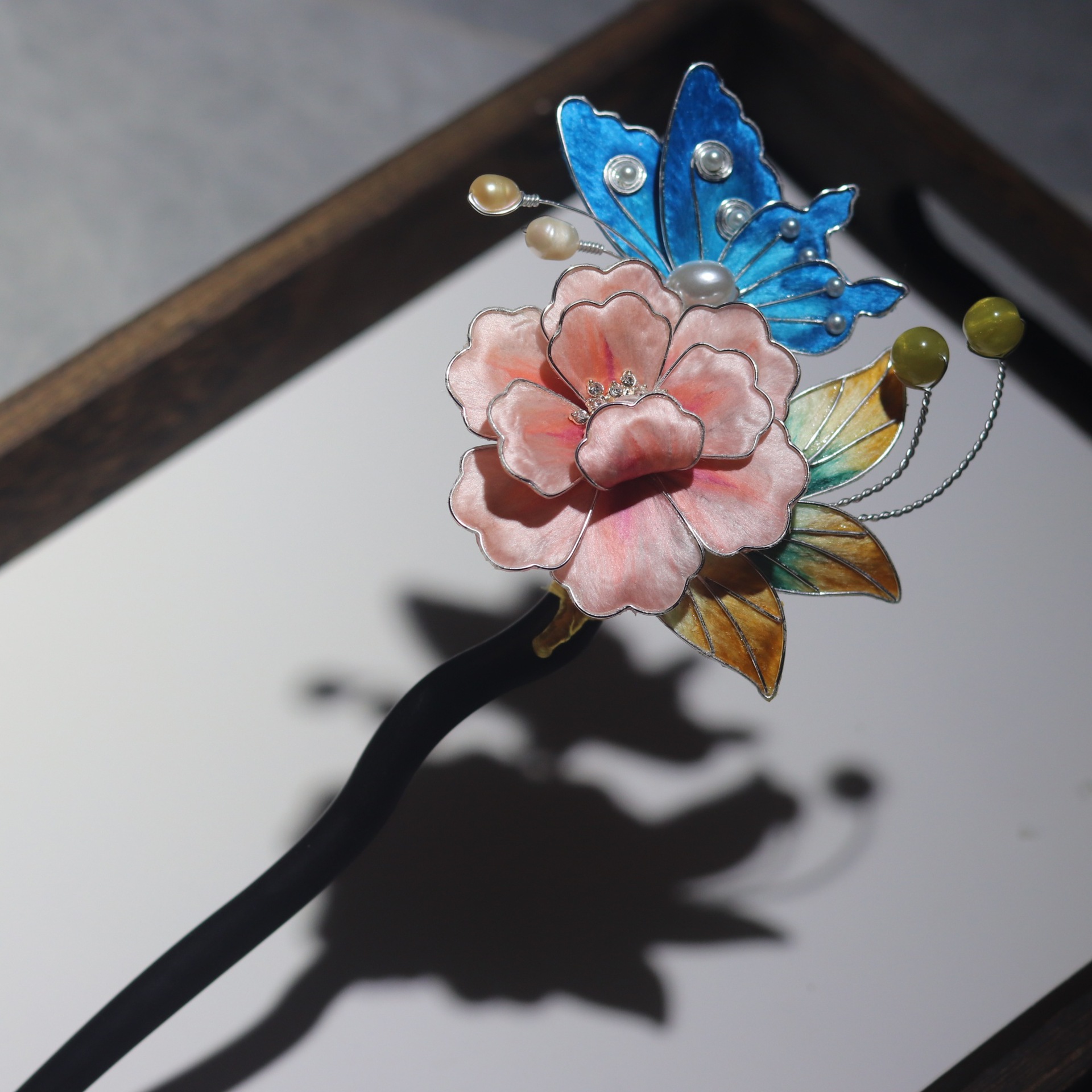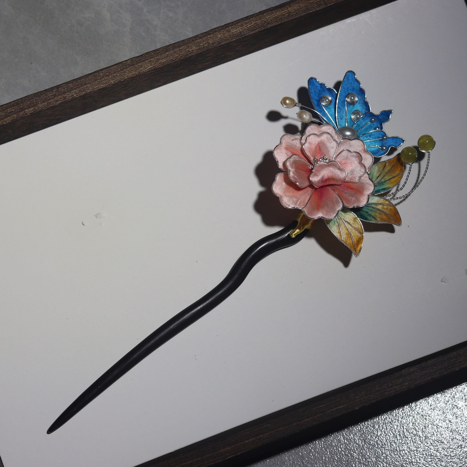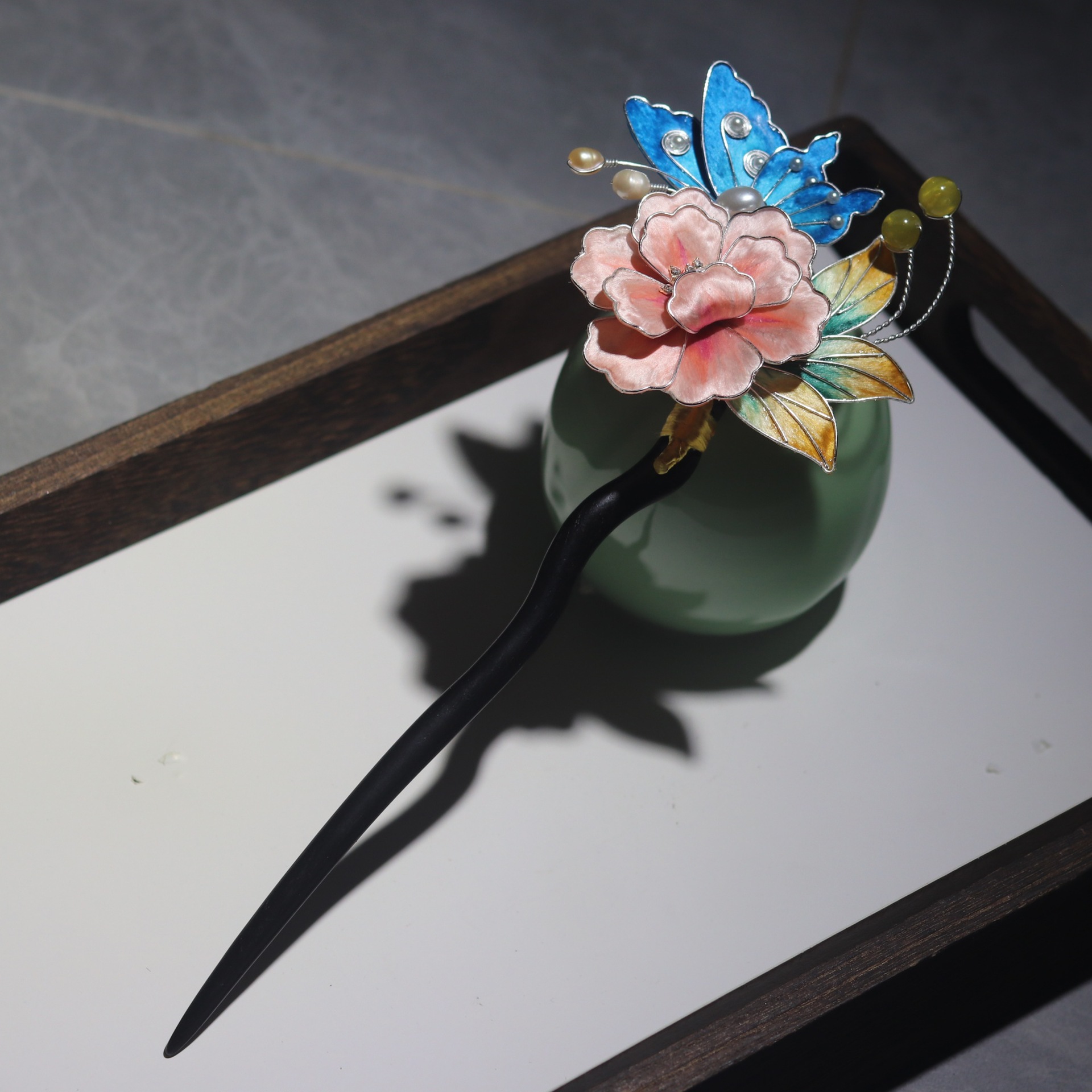 非遗掐丝绒花蚕丝富贵牡丹花古风汉服旗袍黑檀木发簪头饰