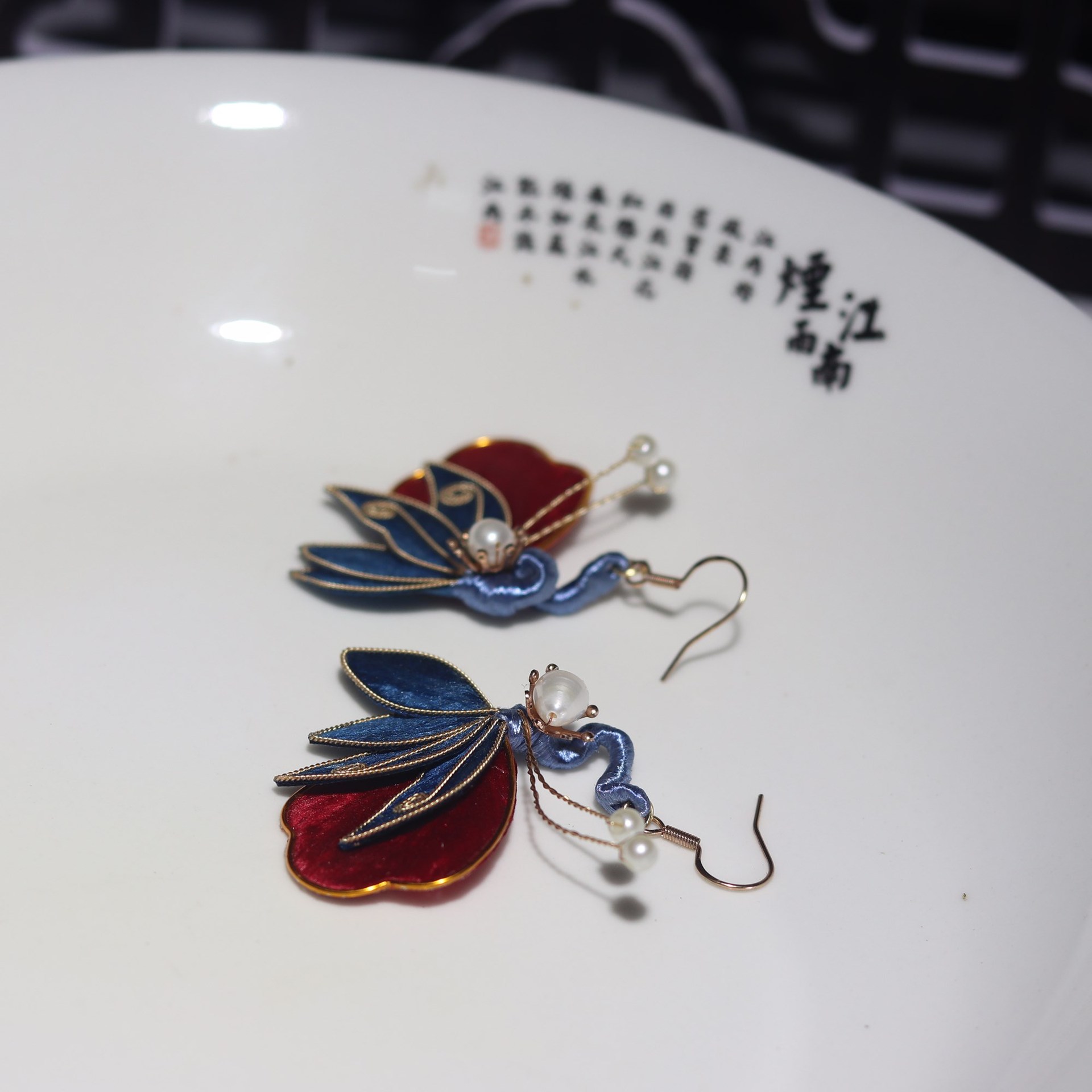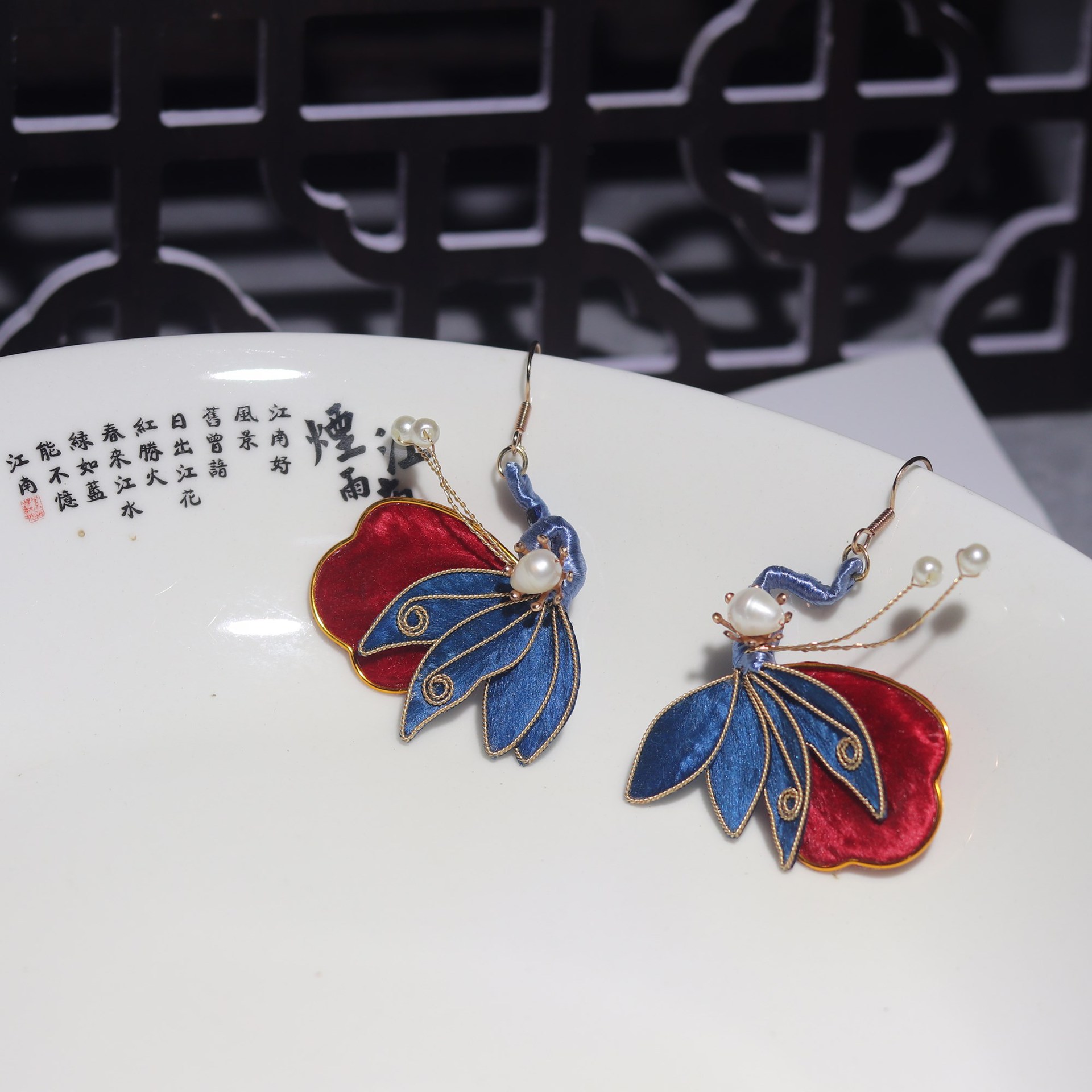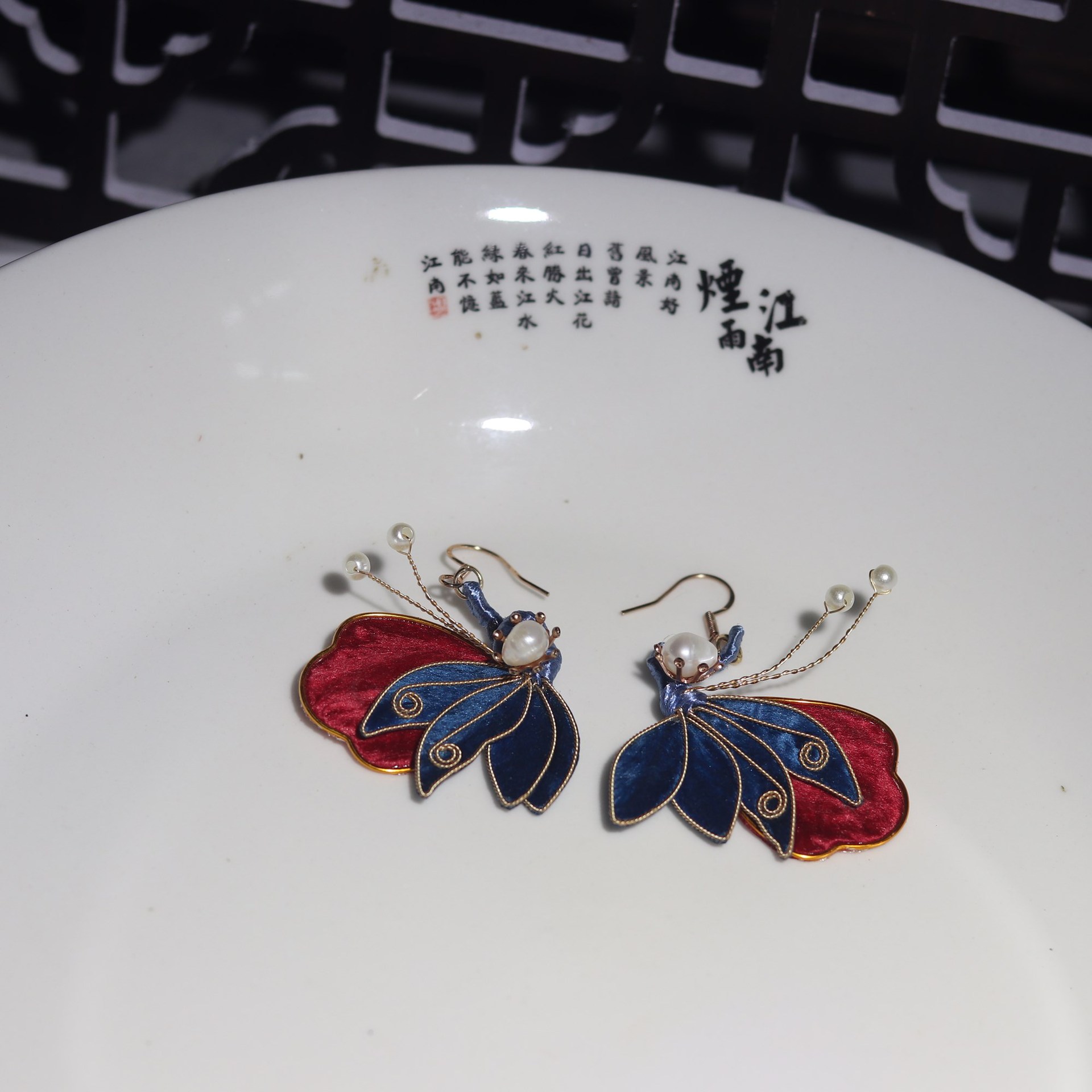 非遗掐丝绒花蚕丝仿点翠蝴蝶珍珠耳环日常旗袍古风汉服耳饰品