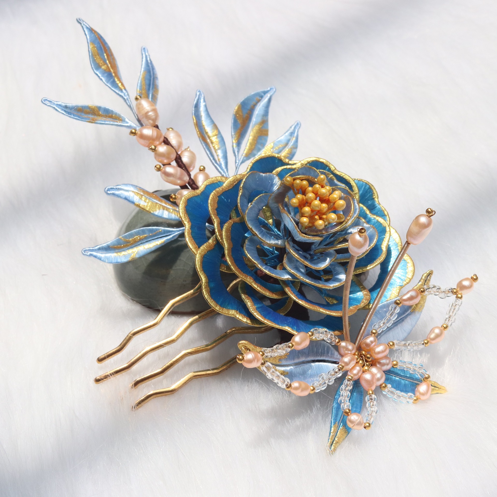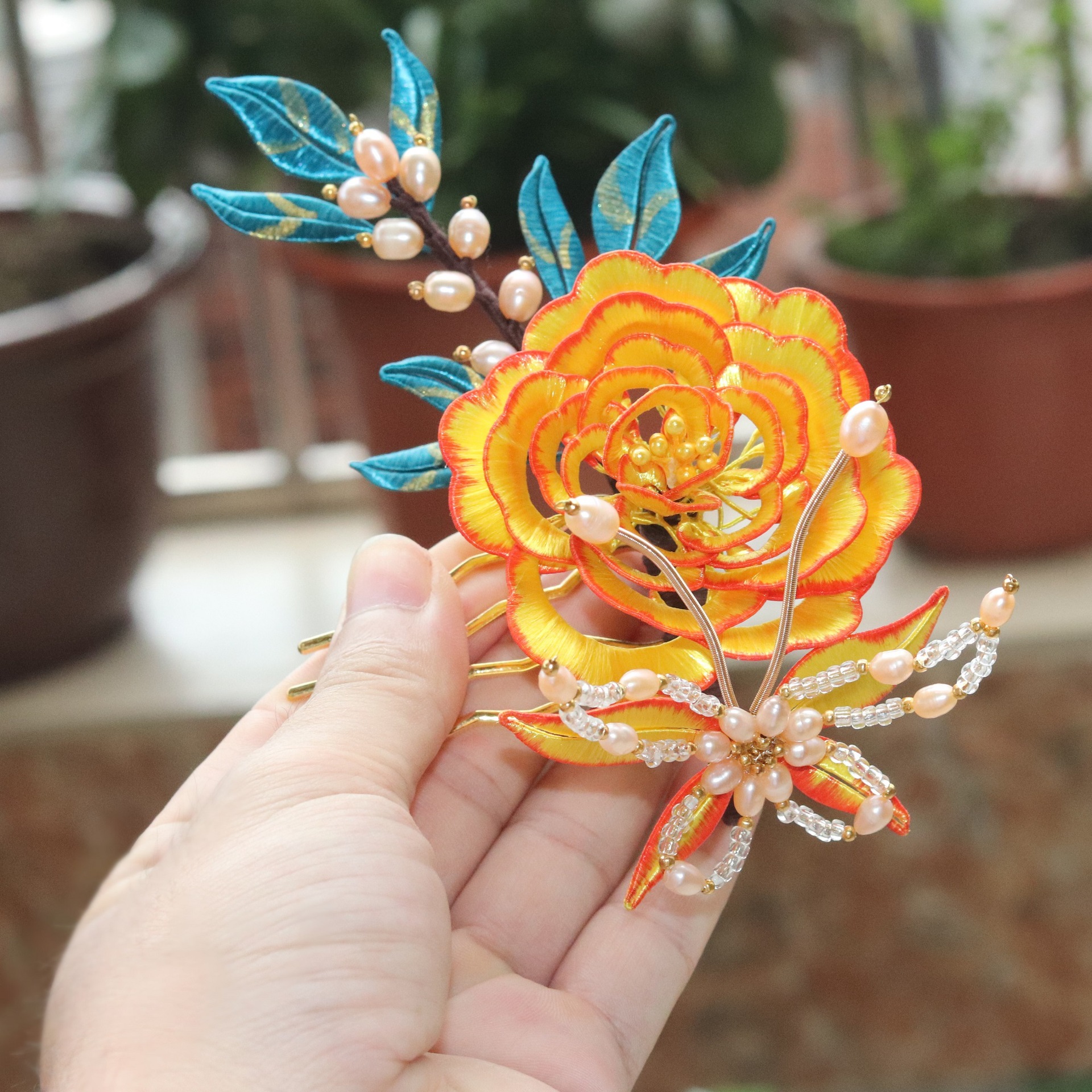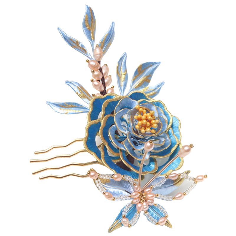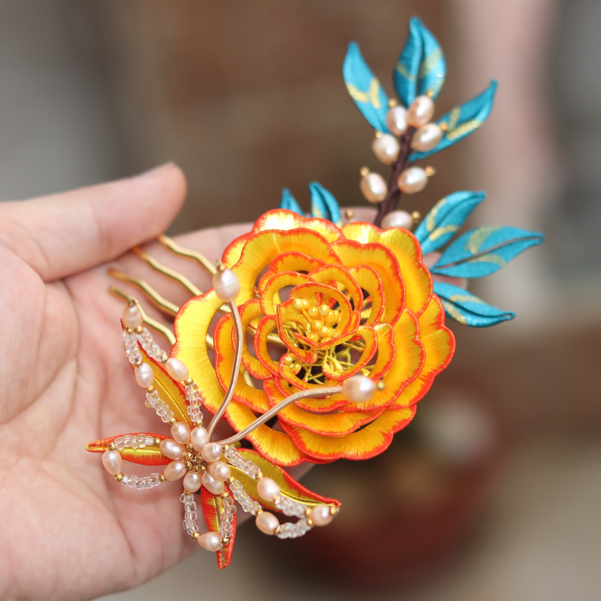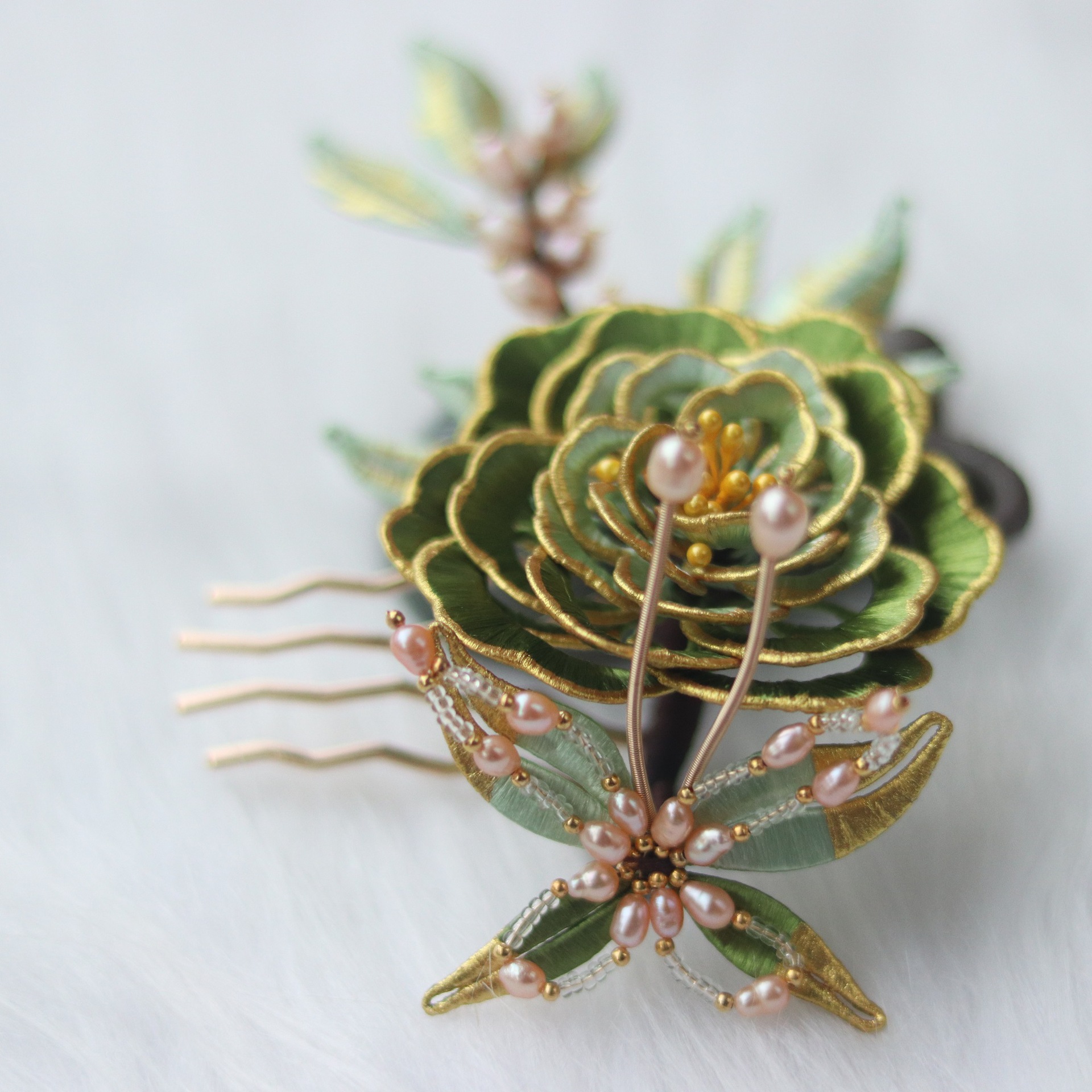 蝶恋花涂金牡丹发梳缠花古风汉服配饰珍珠编珠蝴蝶渐变发饰