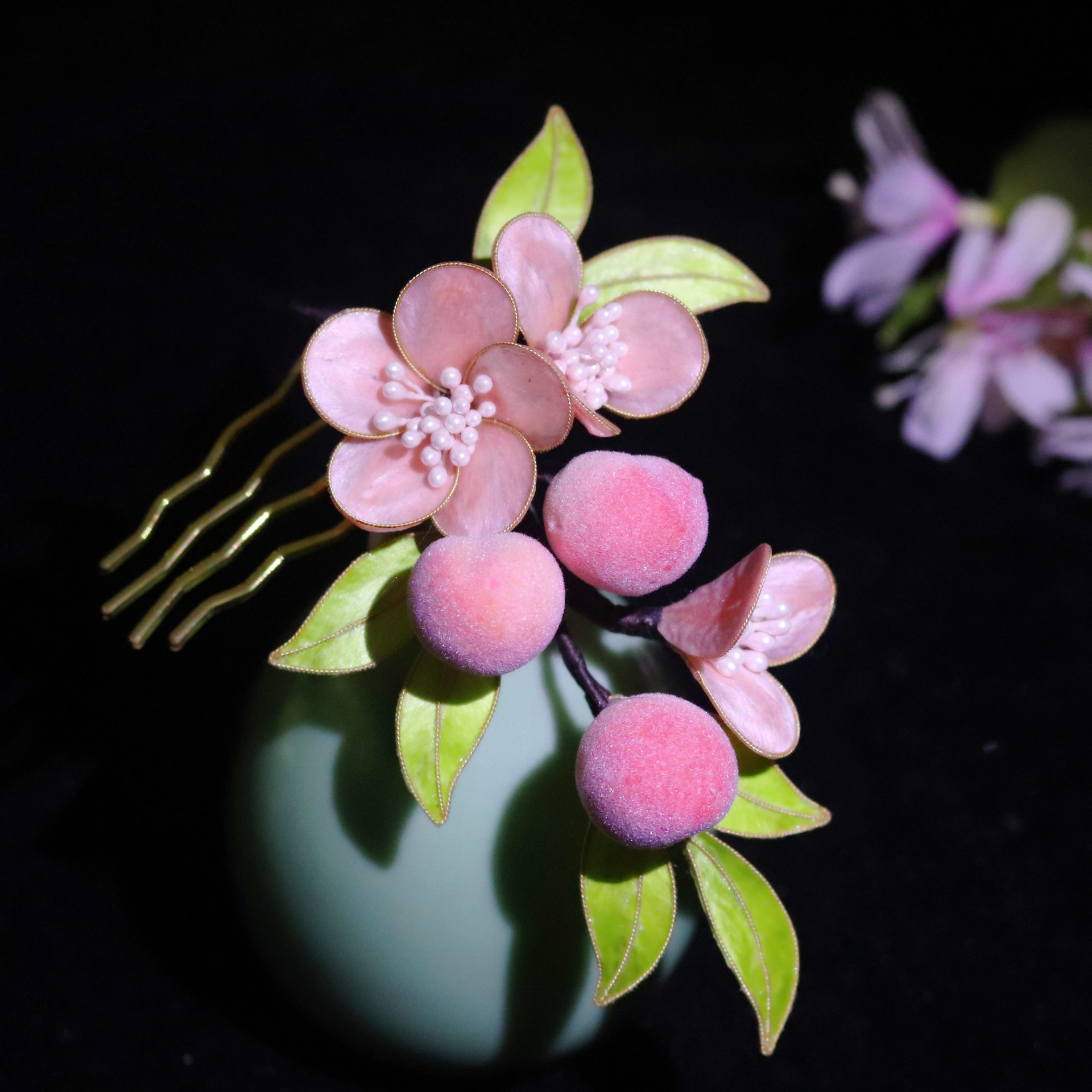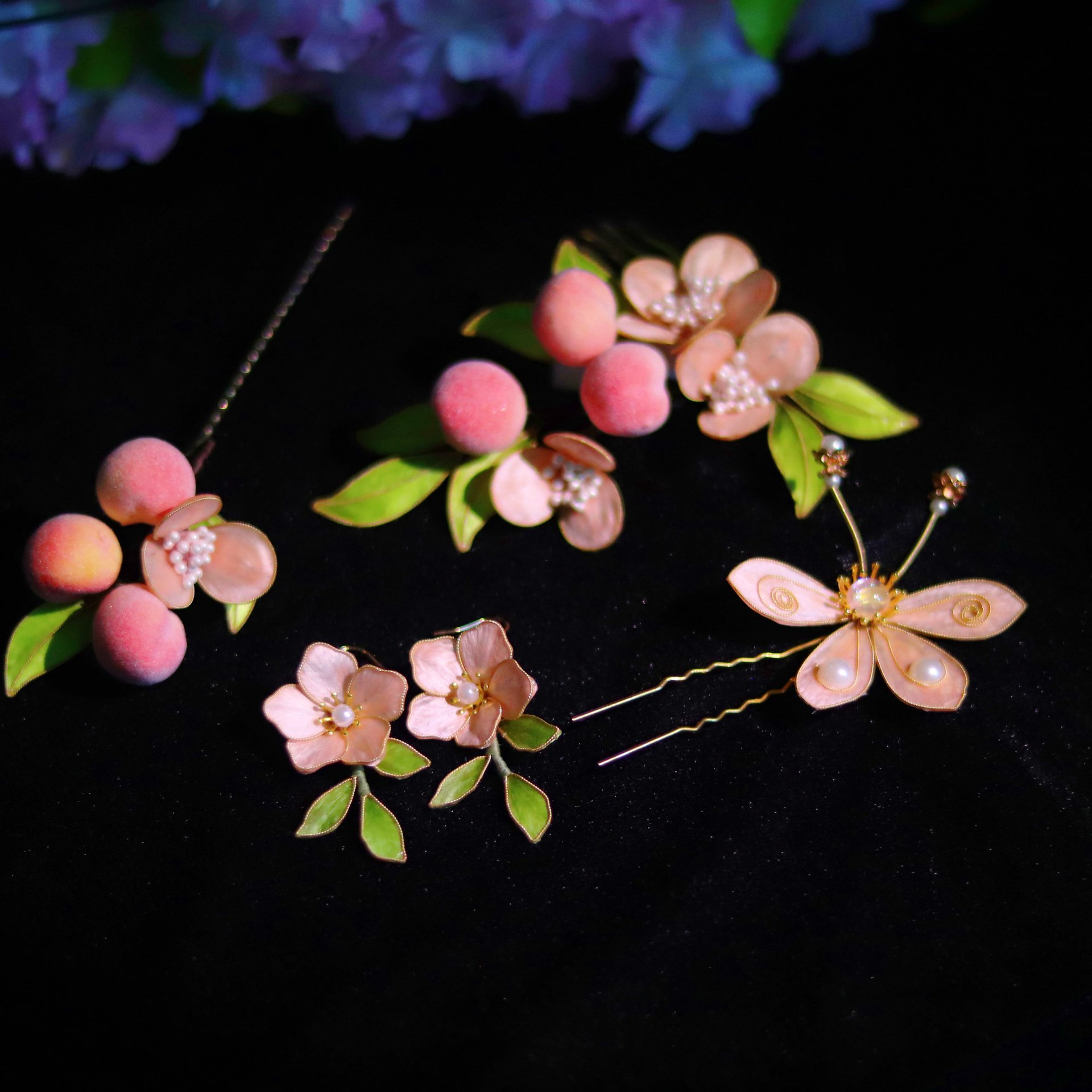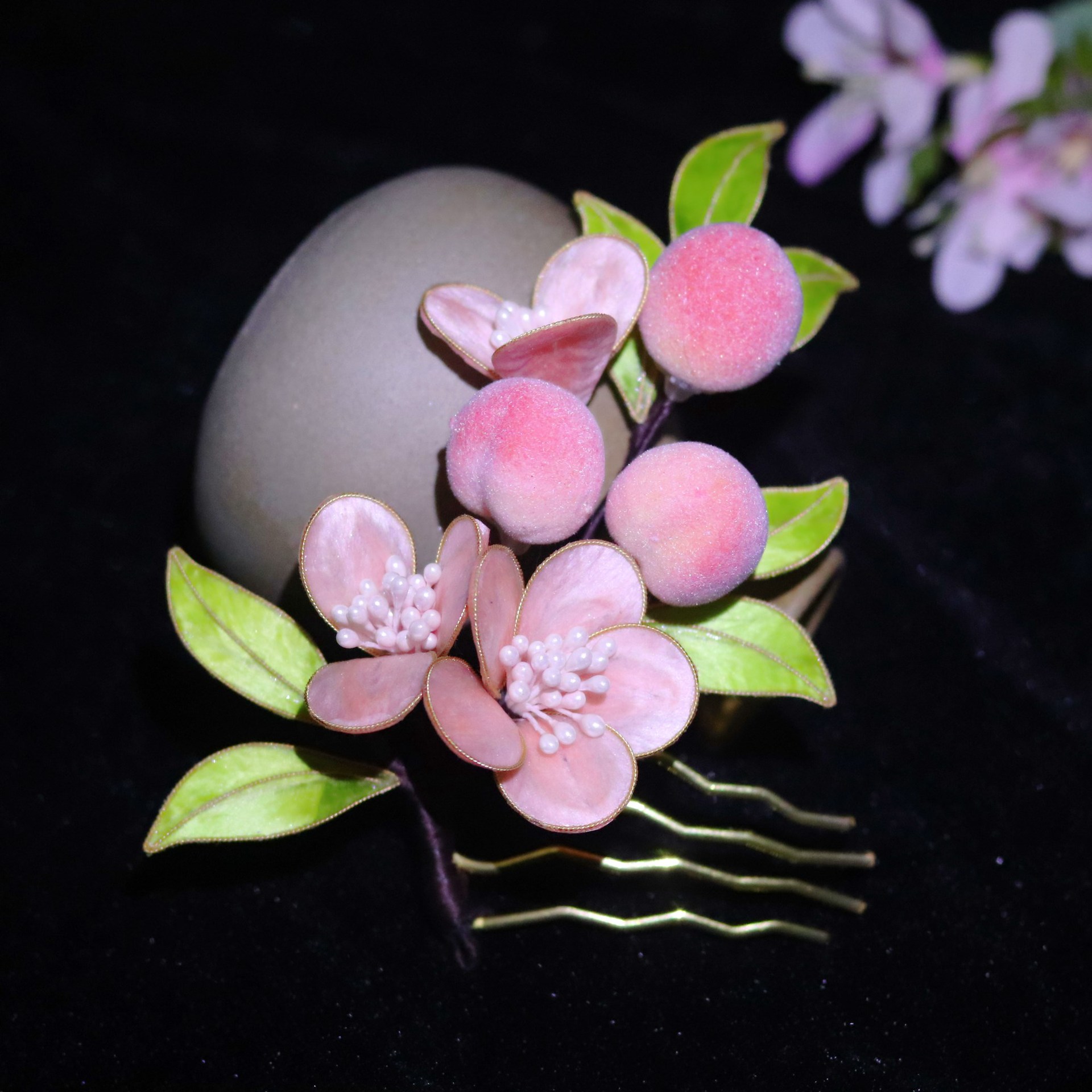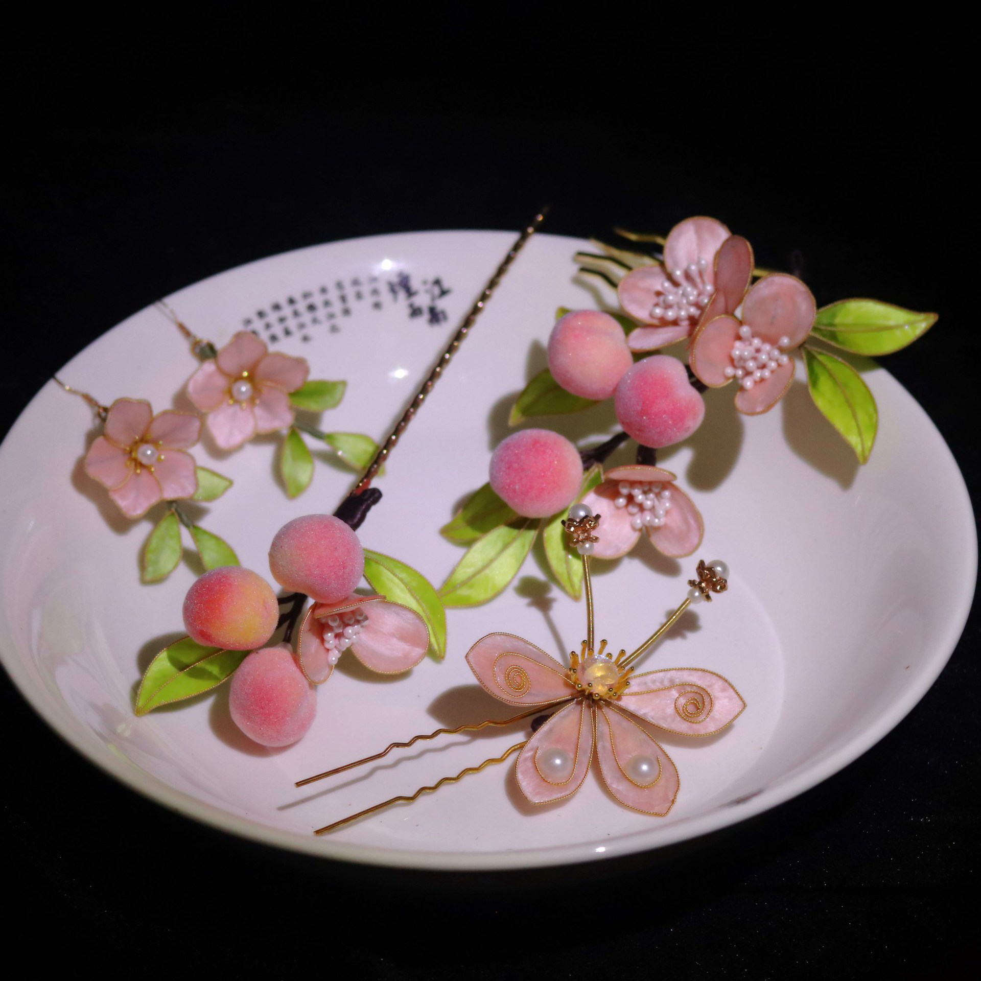非遗绒花蚕丝掐丝绒花小桃子发簪发梳发饰耳饰套装