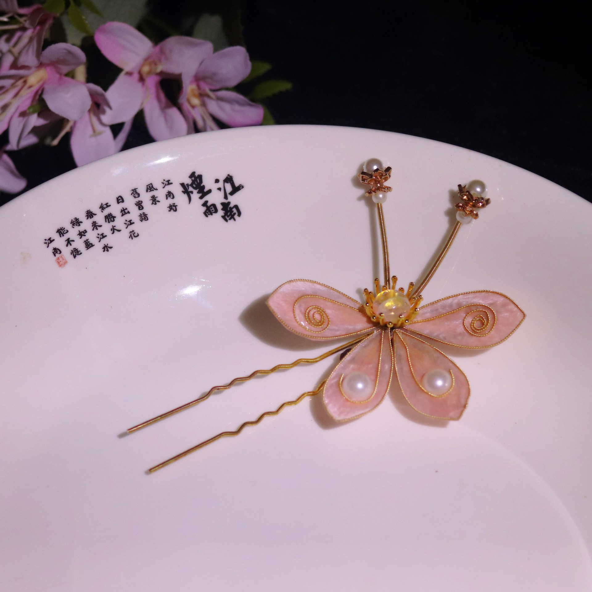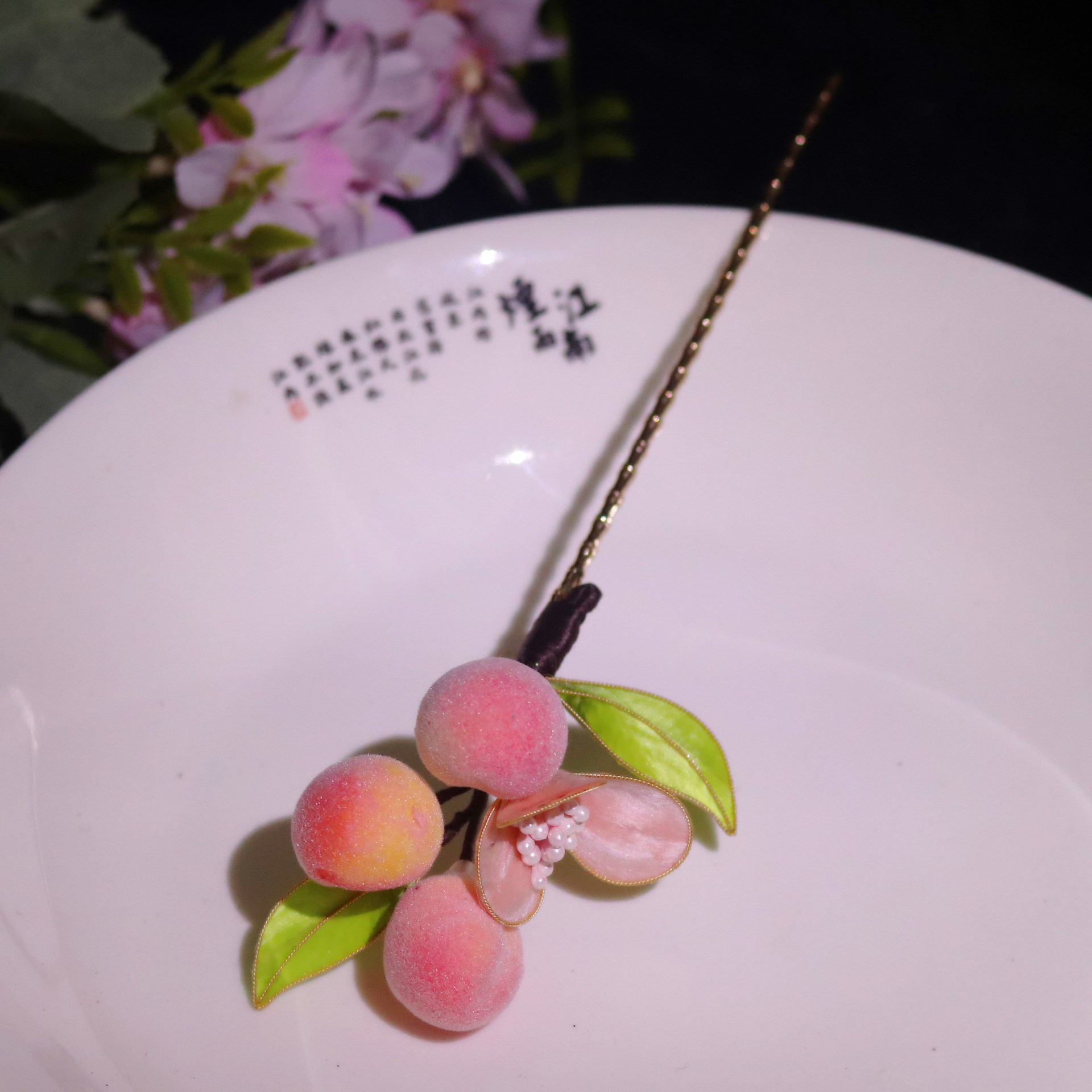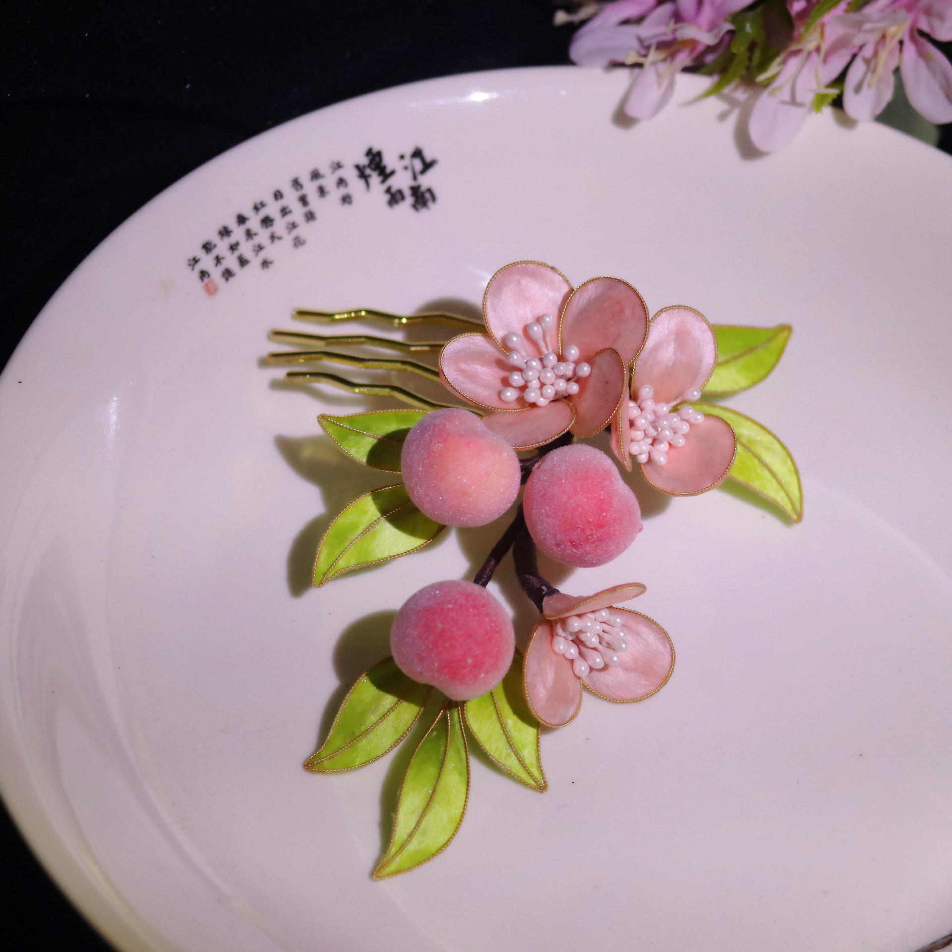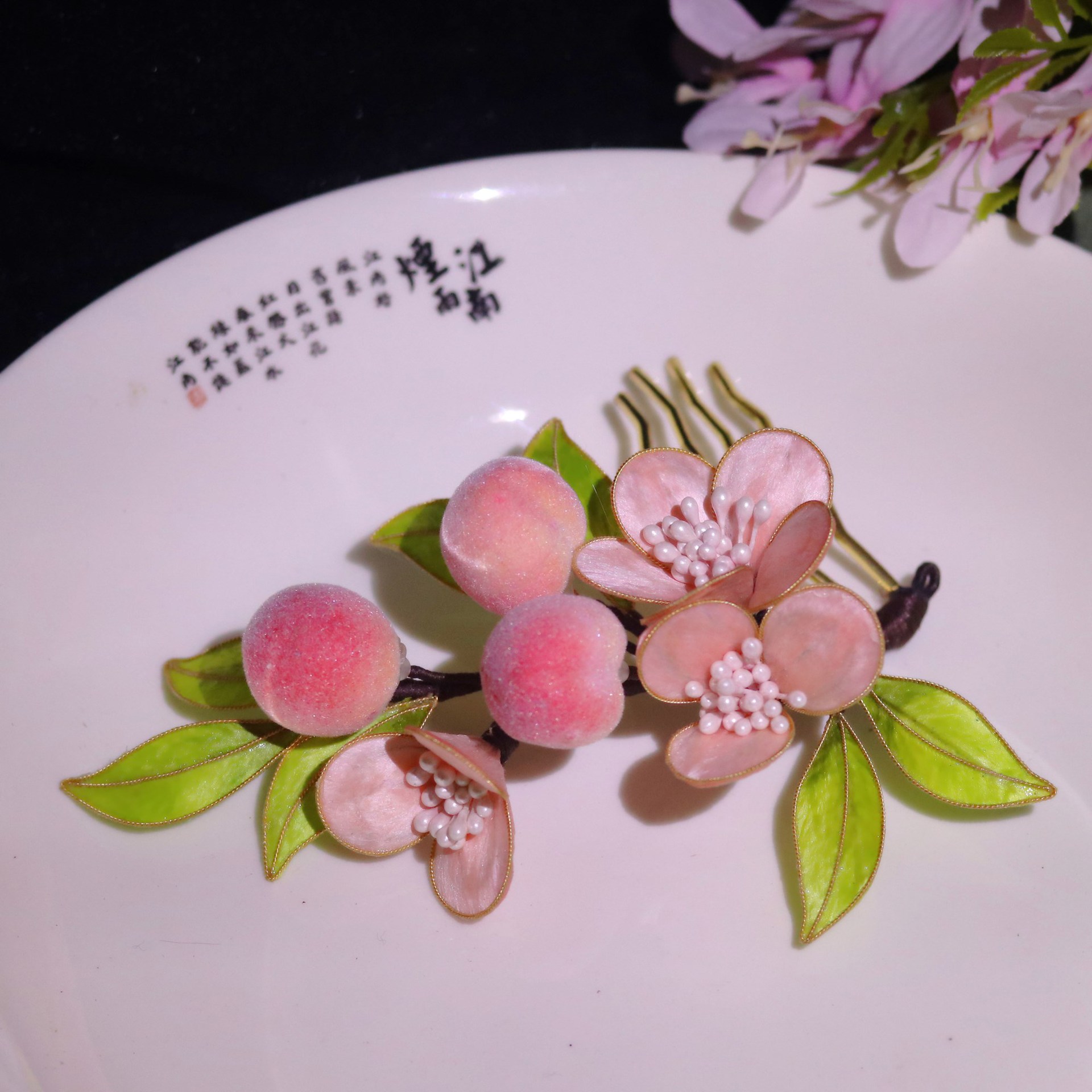 非遗绒花蚕丝掐丝绒花小桃子发簪发梳发饰耳饰套装