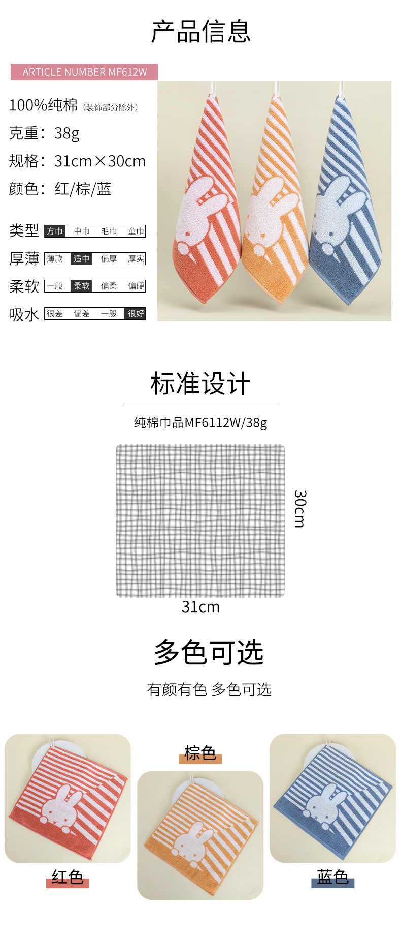30*31金号米菲联名款纯棉吸水带挂绳擦手四方巾MF6112一件代发