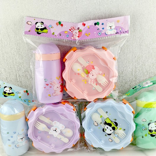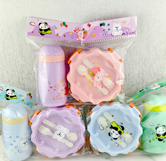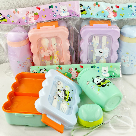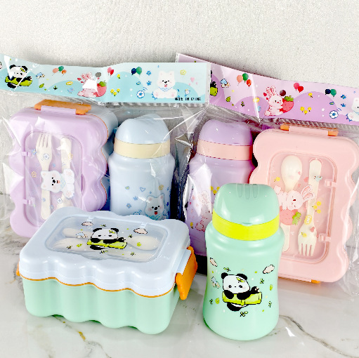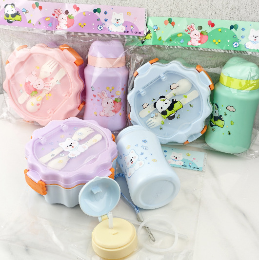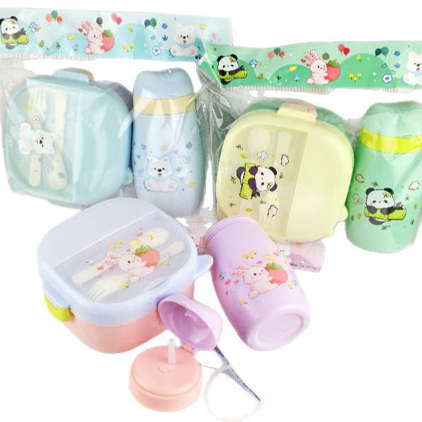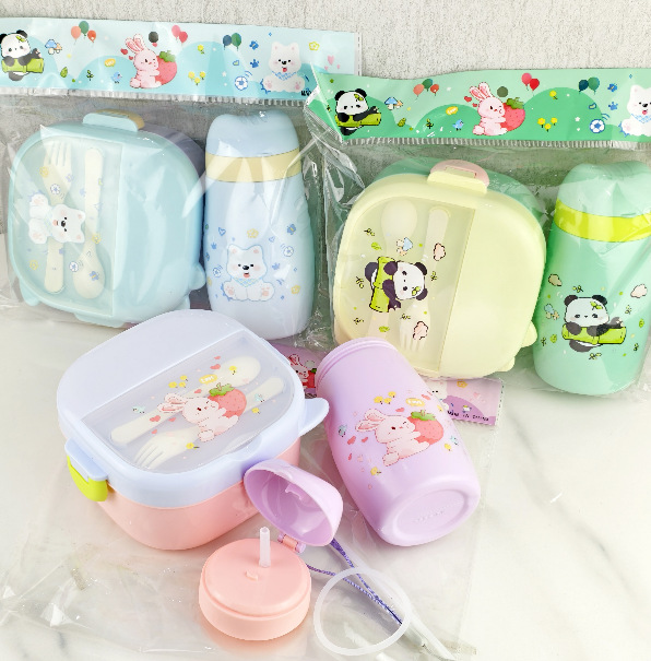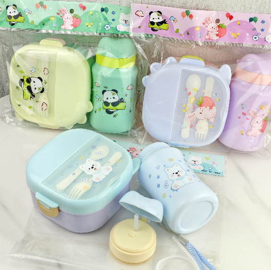 外贸塑料卡通饭盒水杯套装便携可爱儿童便当盒学生食堂分格午餐盒