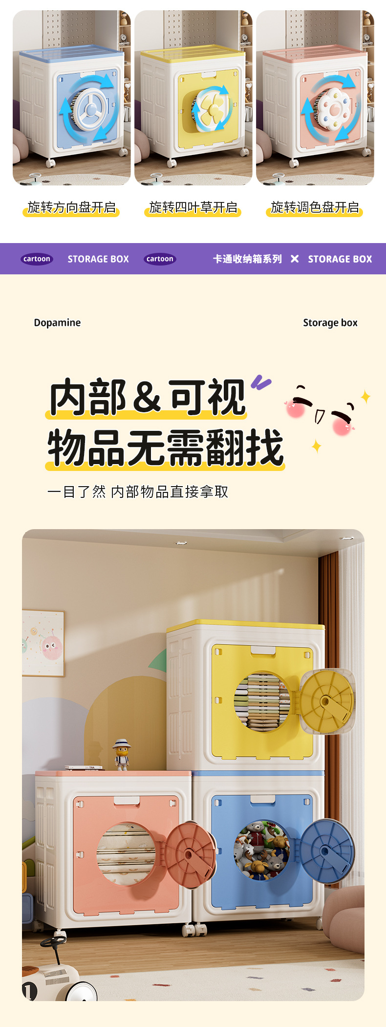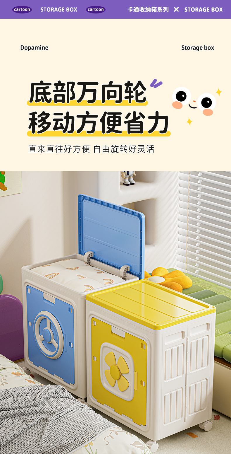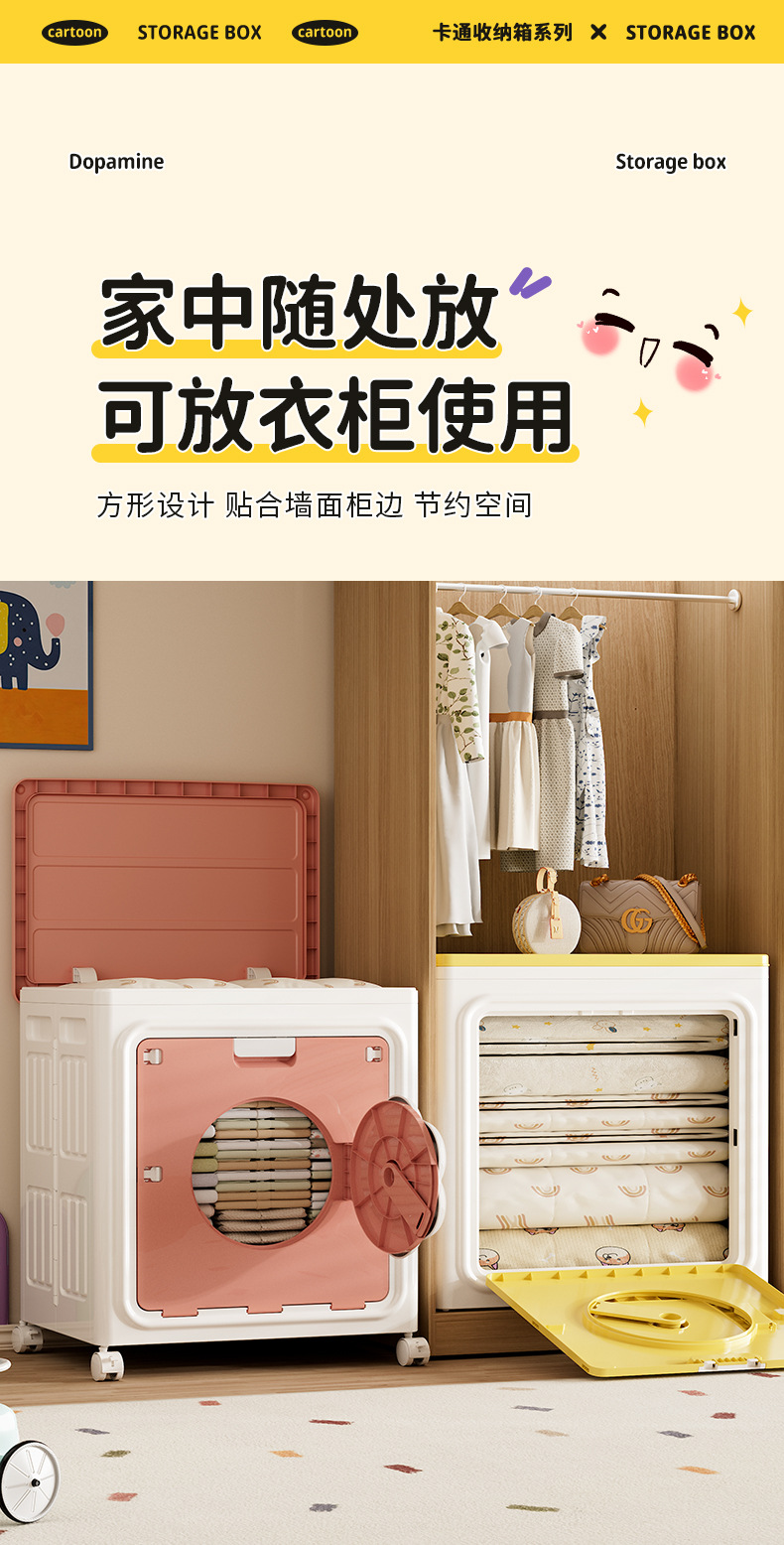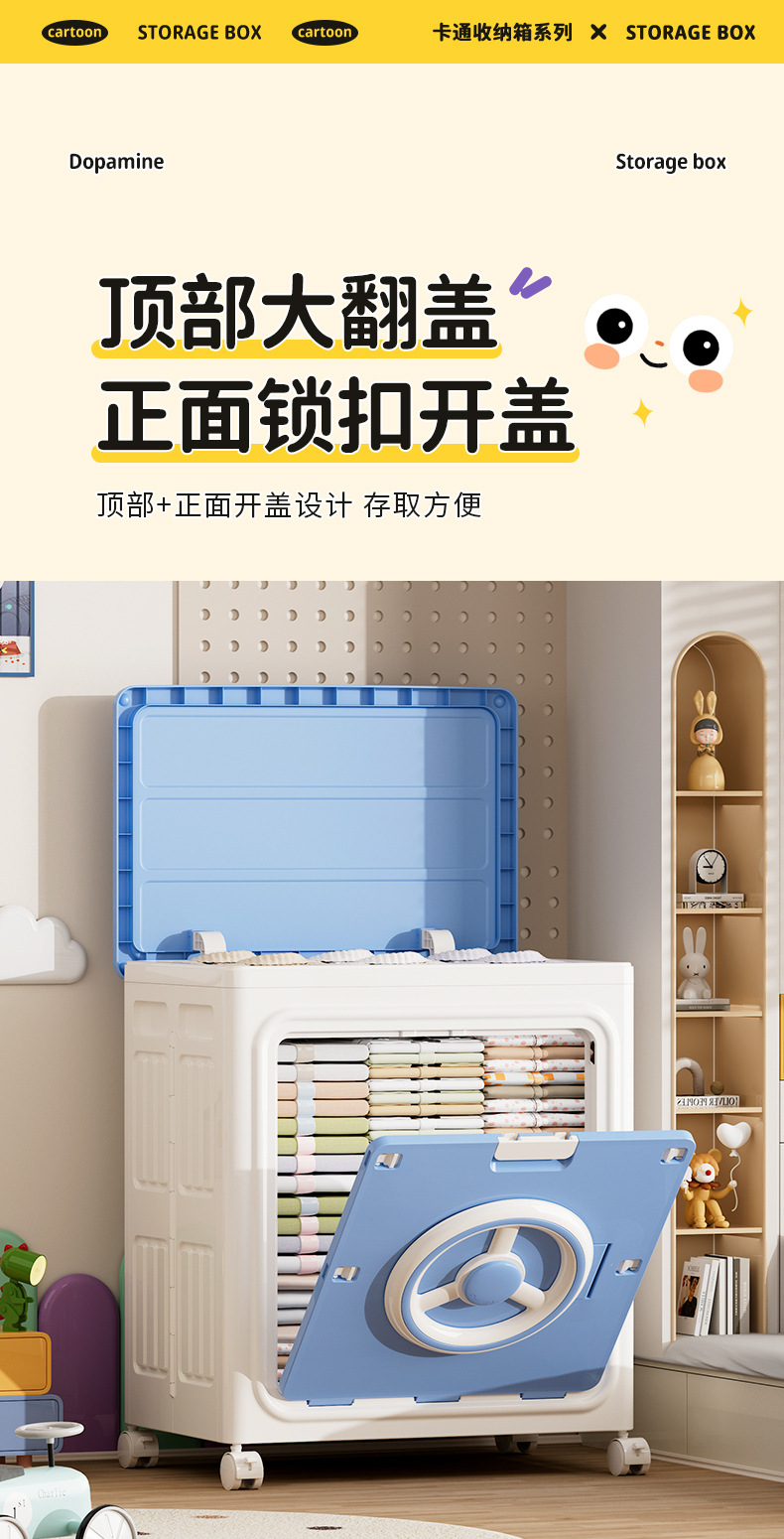 可爱卡通收纳箱正面锁扣开盖可叠加使用底部带轮方便移动超大收纳