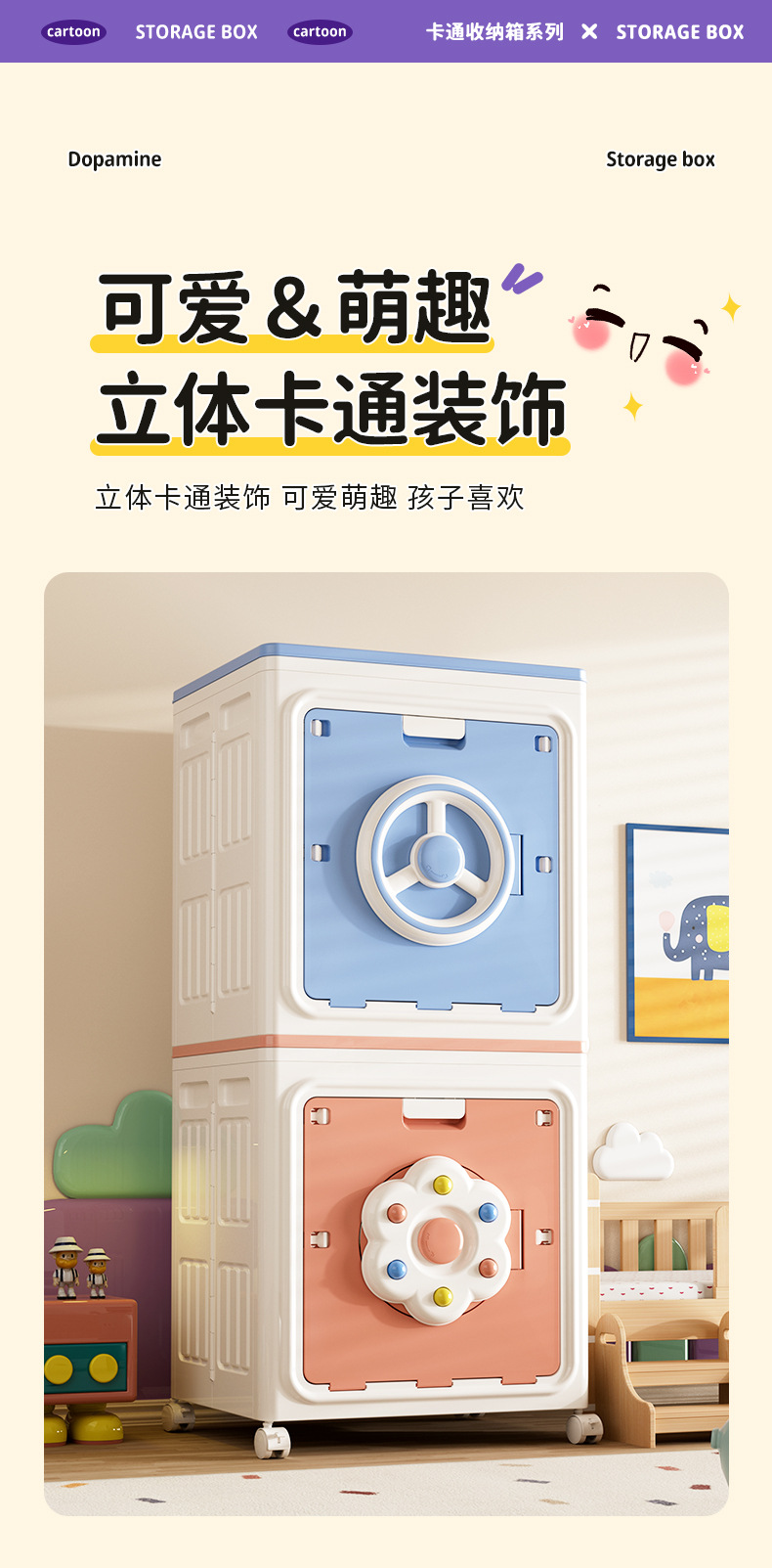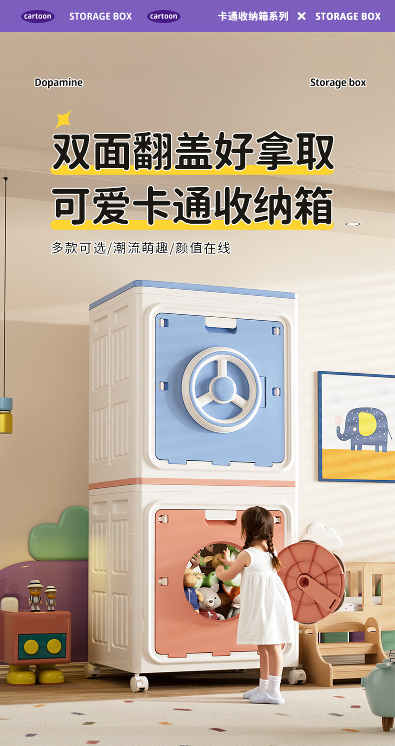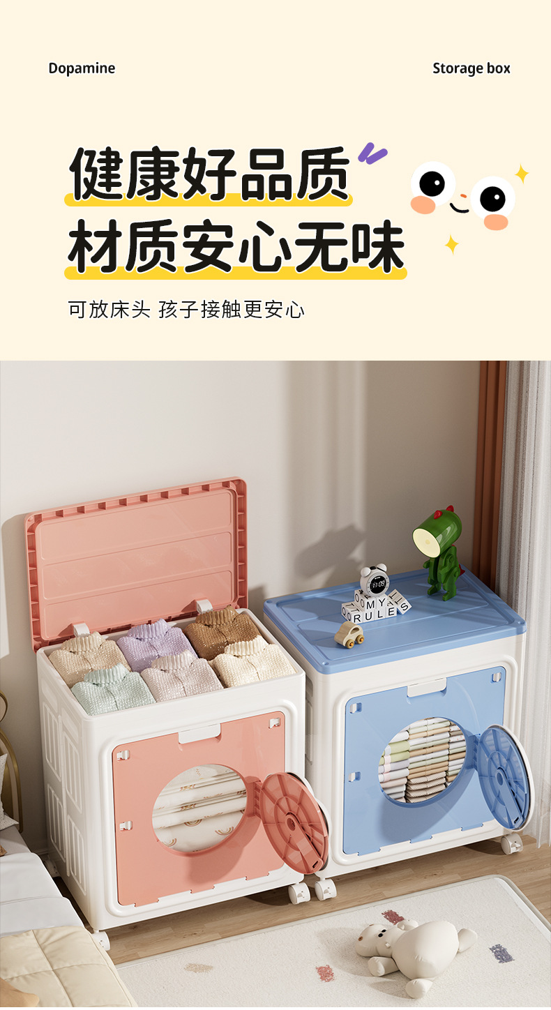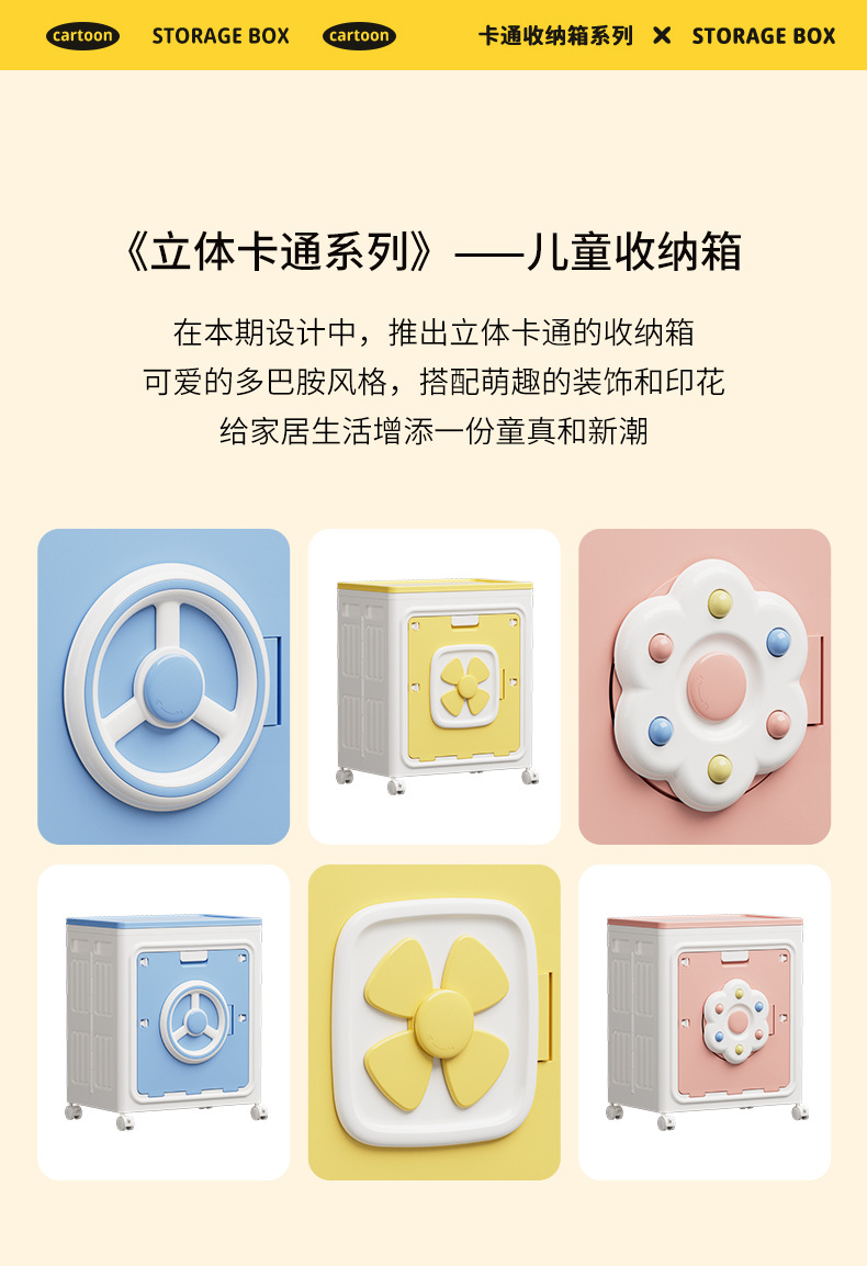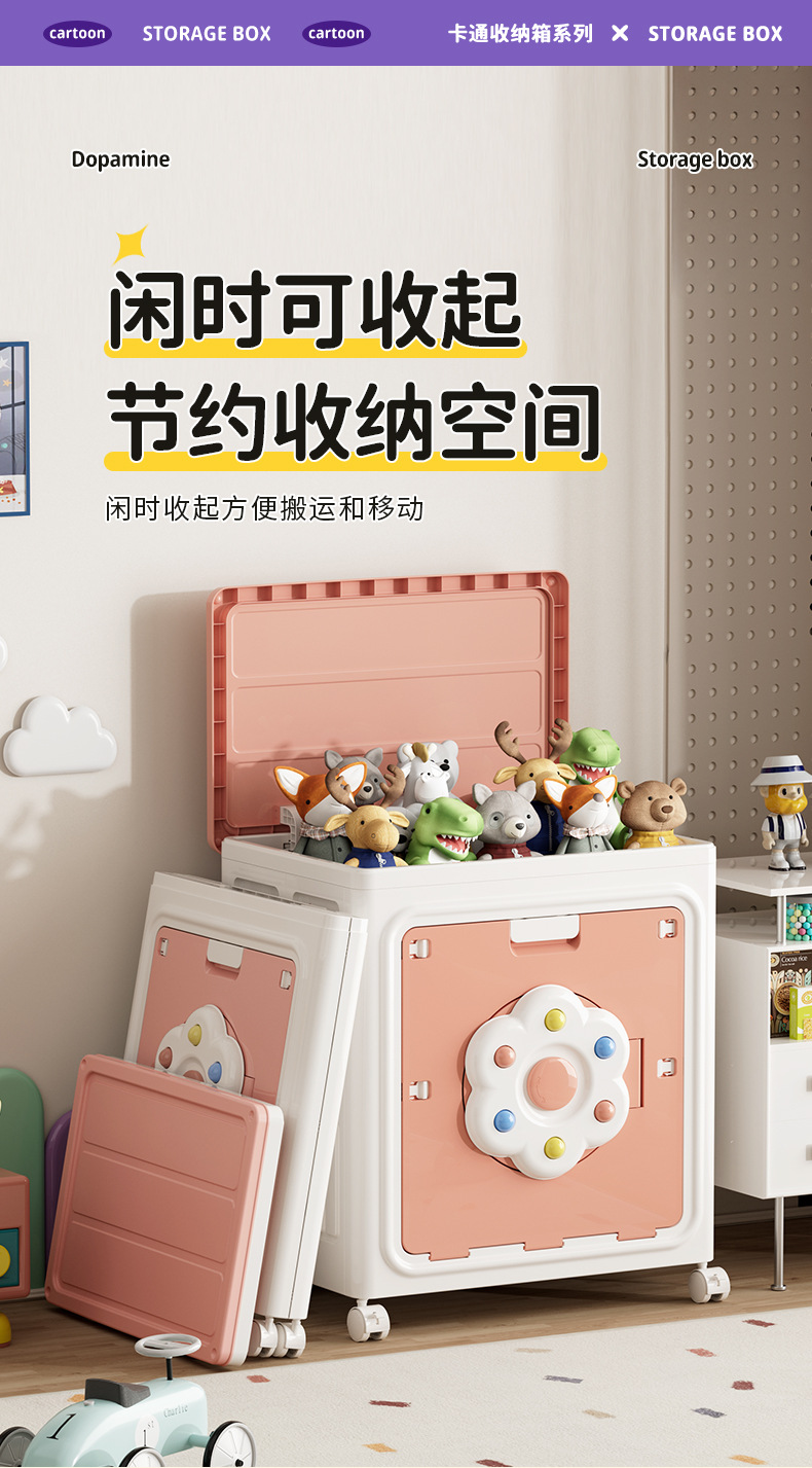 可爱卡通收纳箱正面锁扣开盖可叠加使用底部带轮方便移动超大收纳