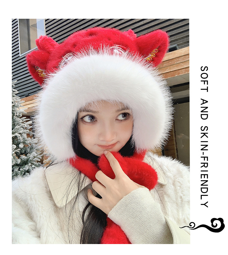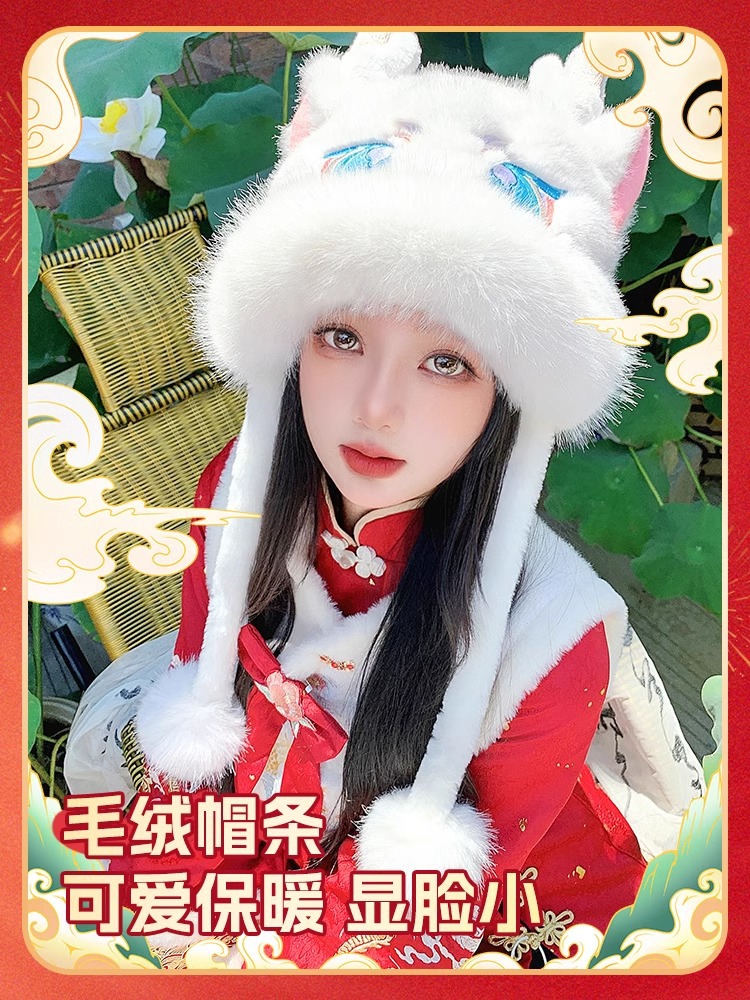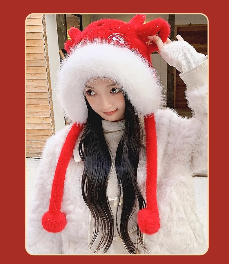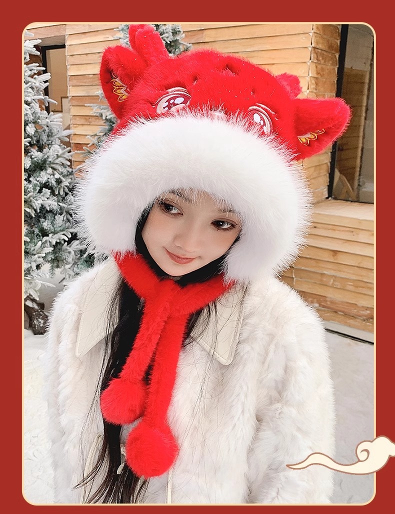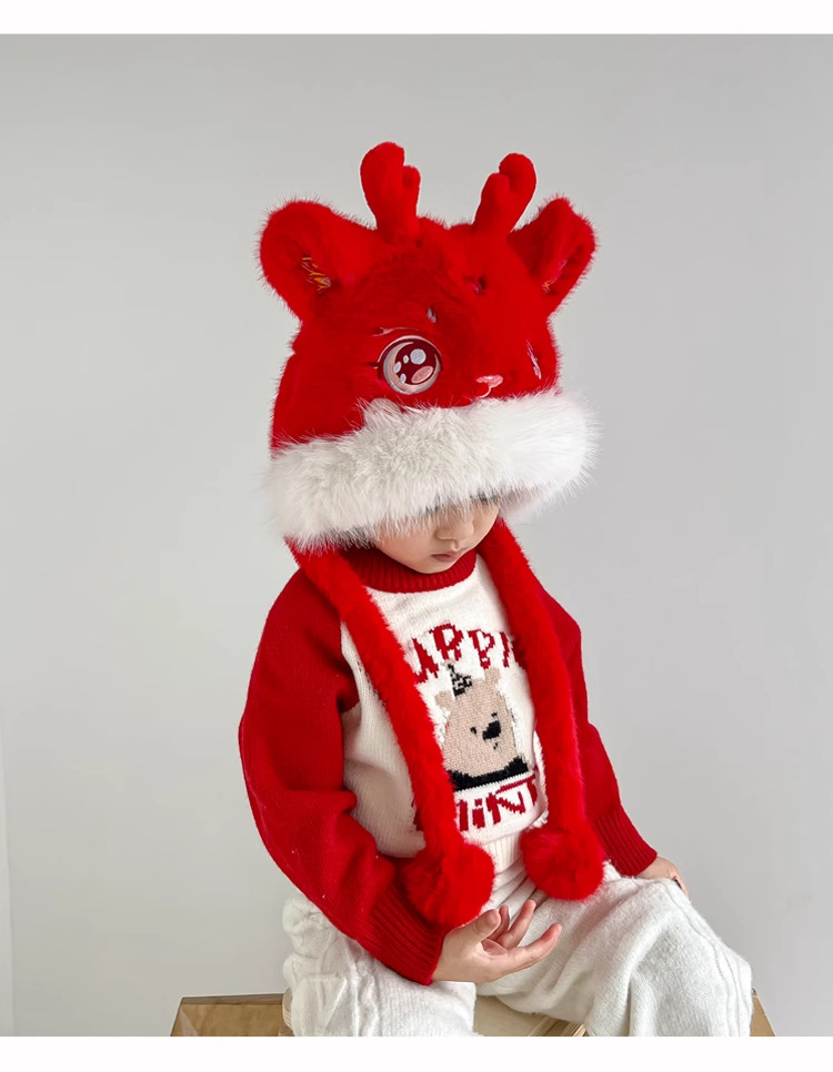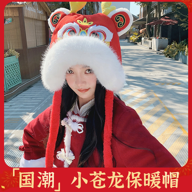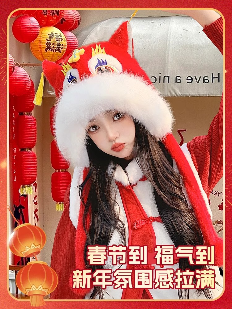 国潮醒狮红色帽子可爱学生儿童过年新年虎头帽女冬天加厚保暖毛绒