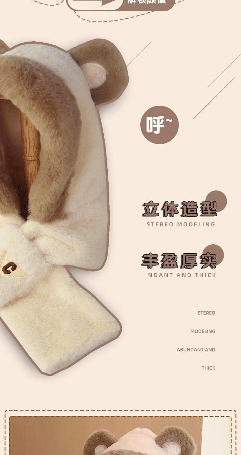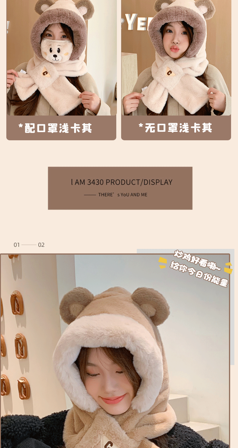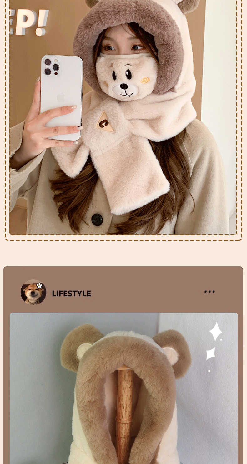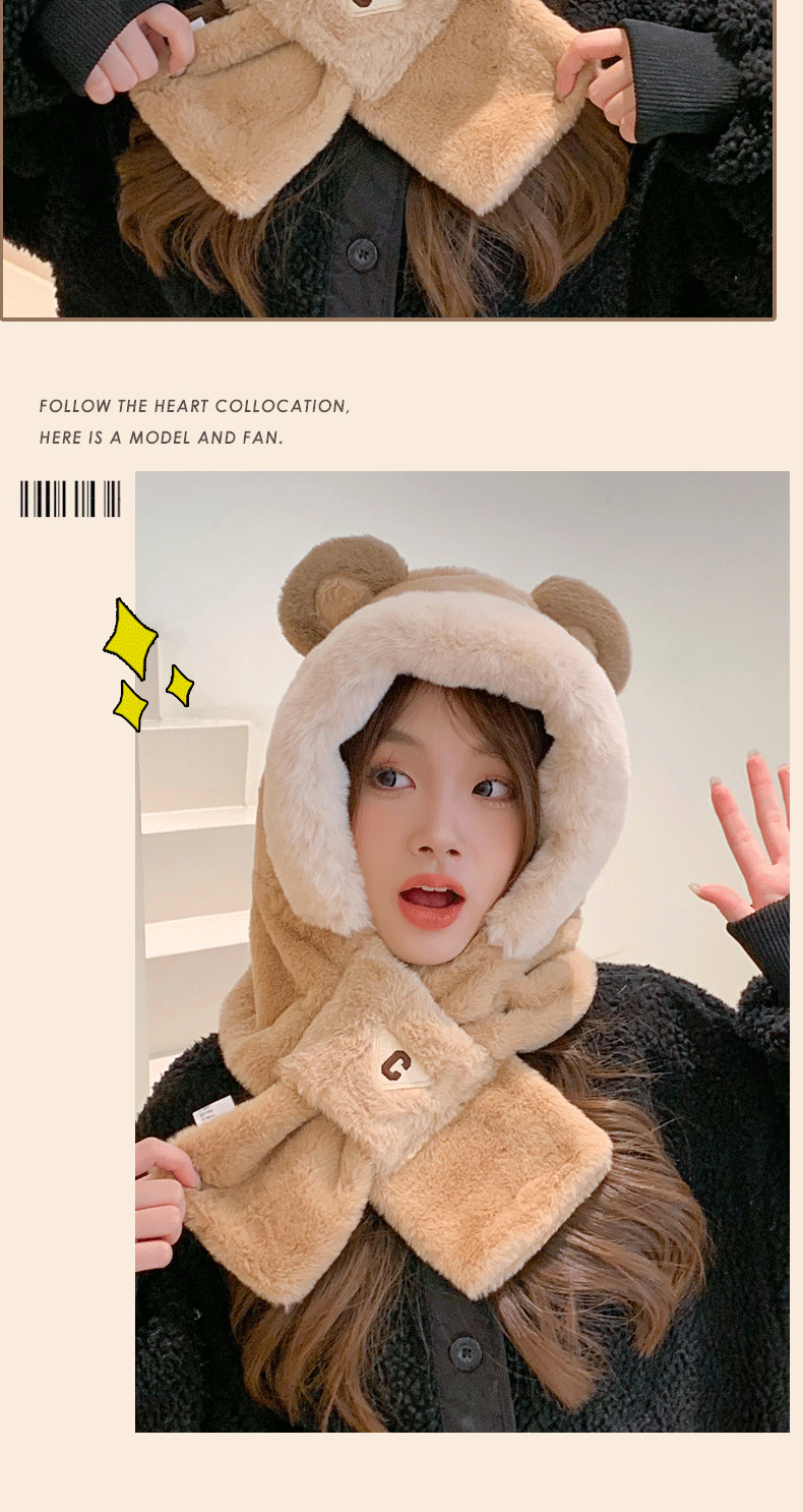 冬季小熊帽女帽子口罩围巾围脖一体保暖护耳骑车防风防寒学生可爱