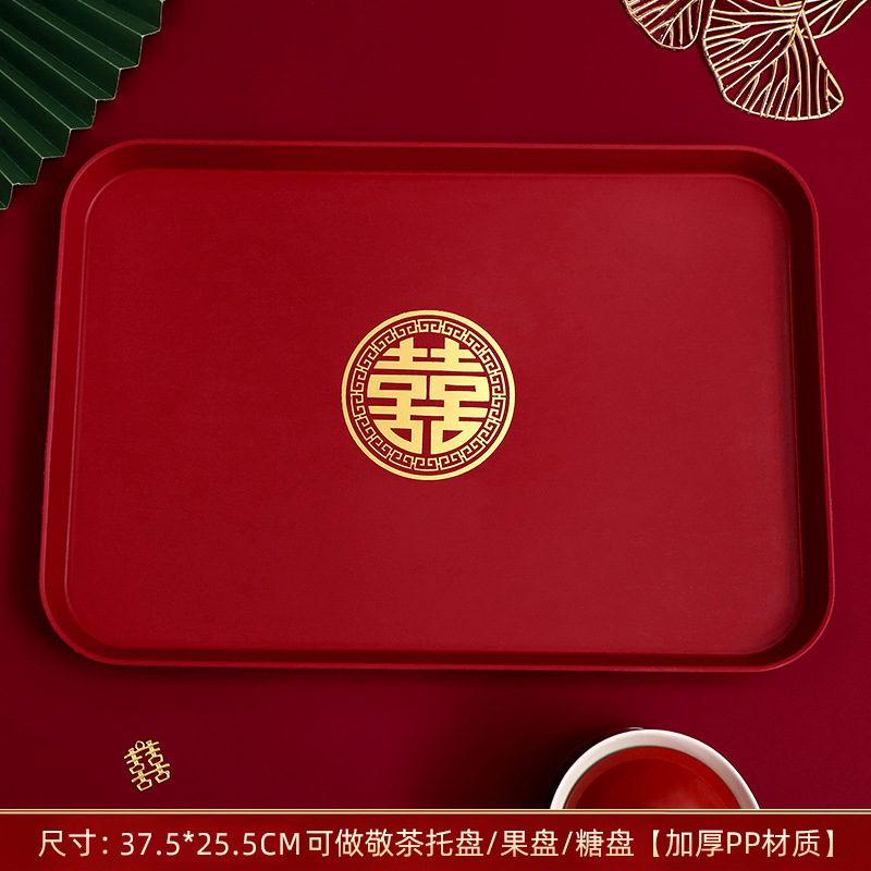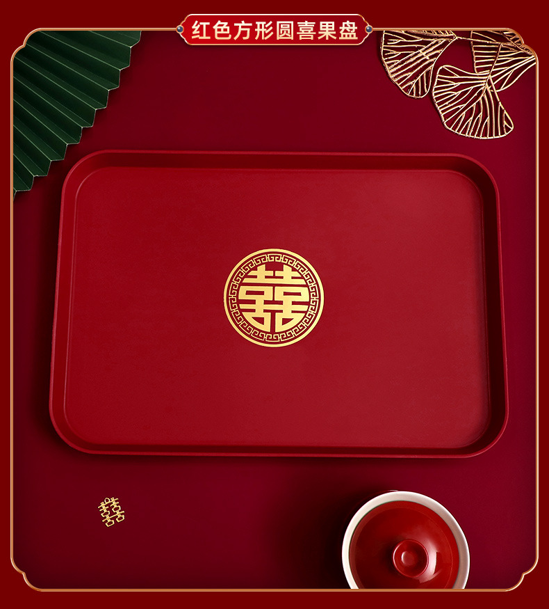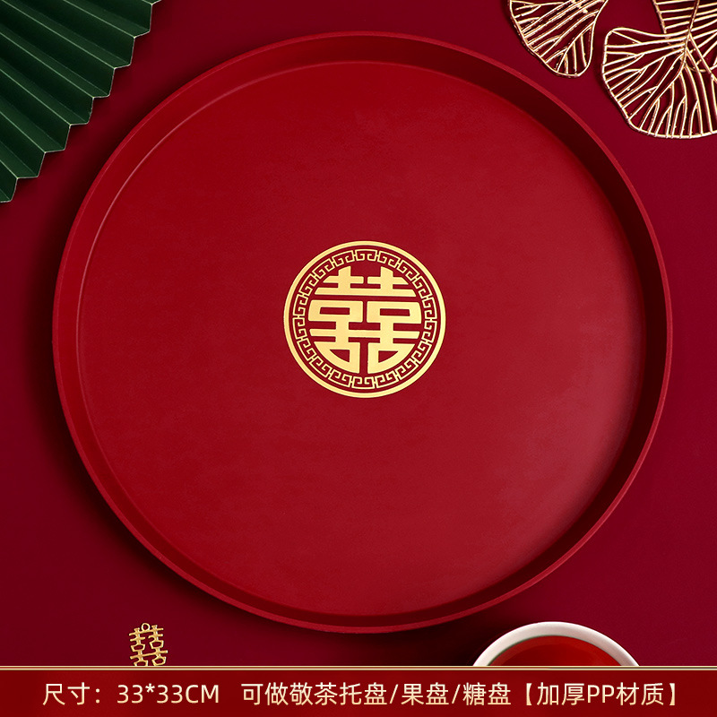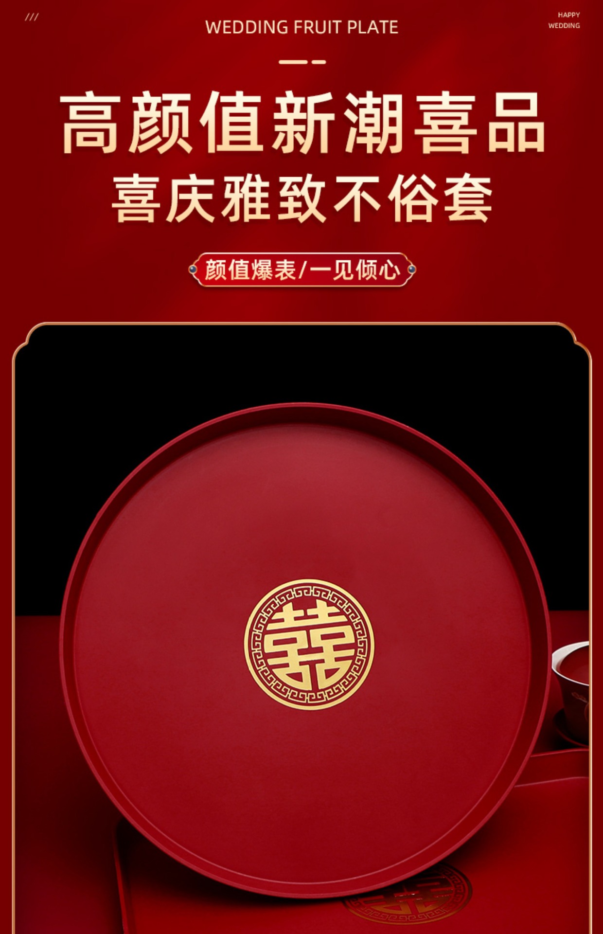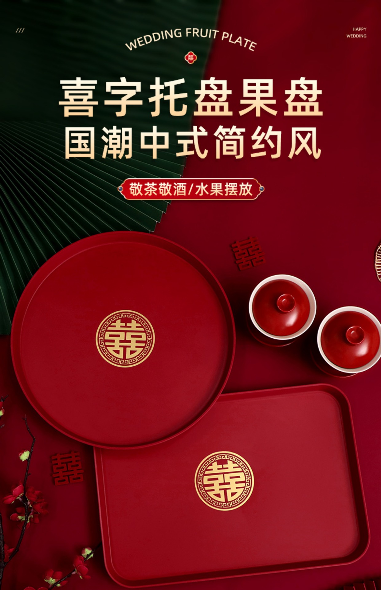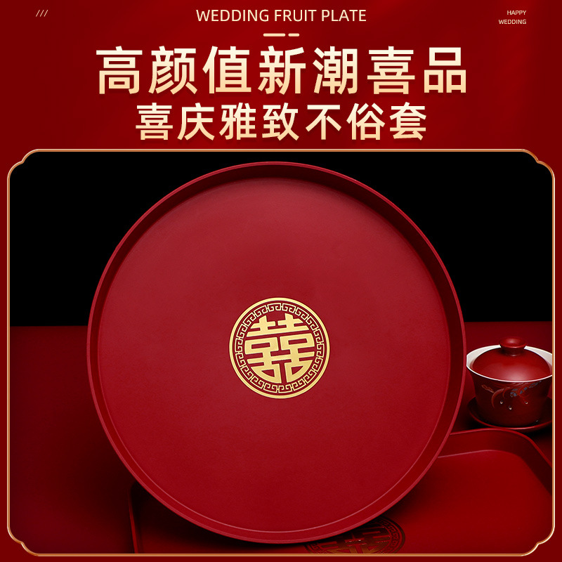 结婚托盘婚礼红色喜庆果盘婚宴喜字圆形敬茶盘婚庆用品方形喜糖盘