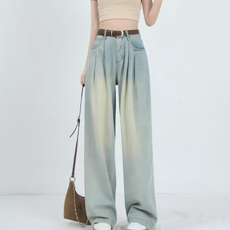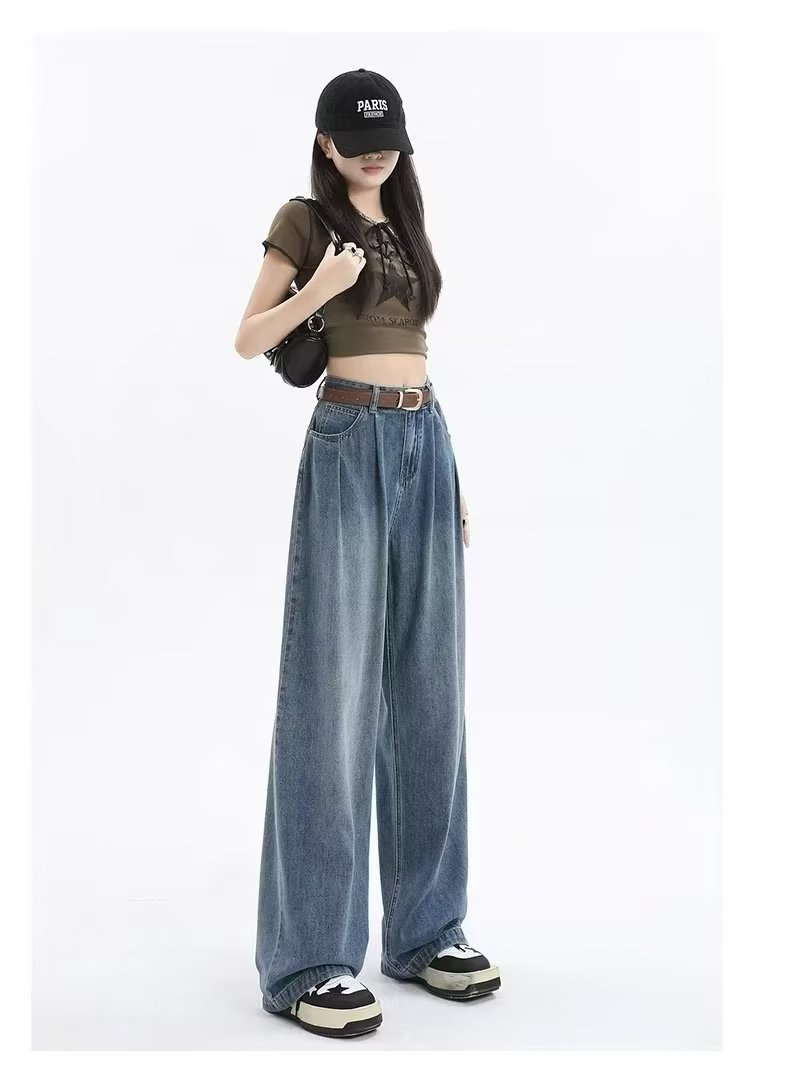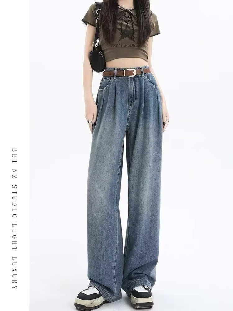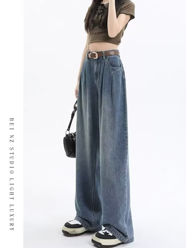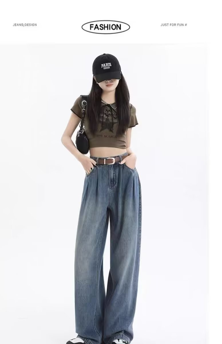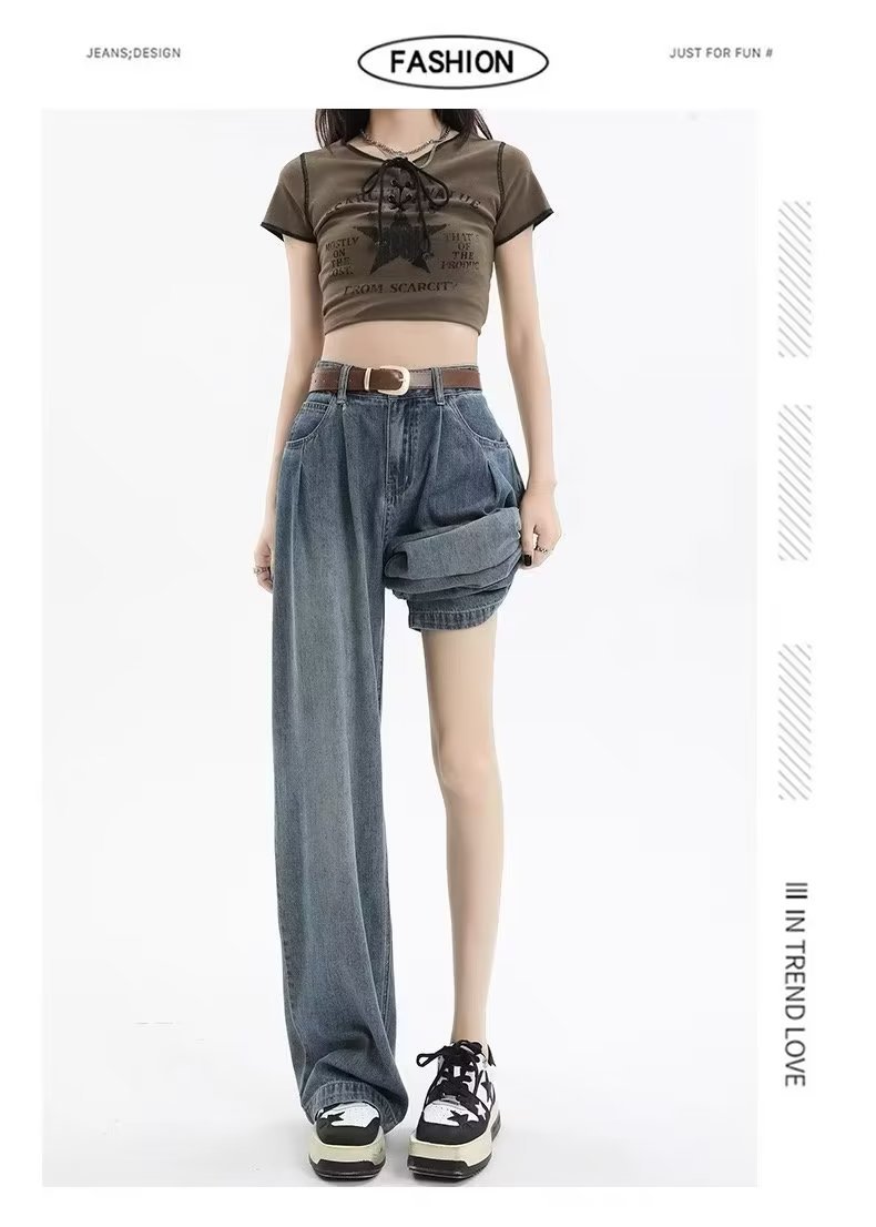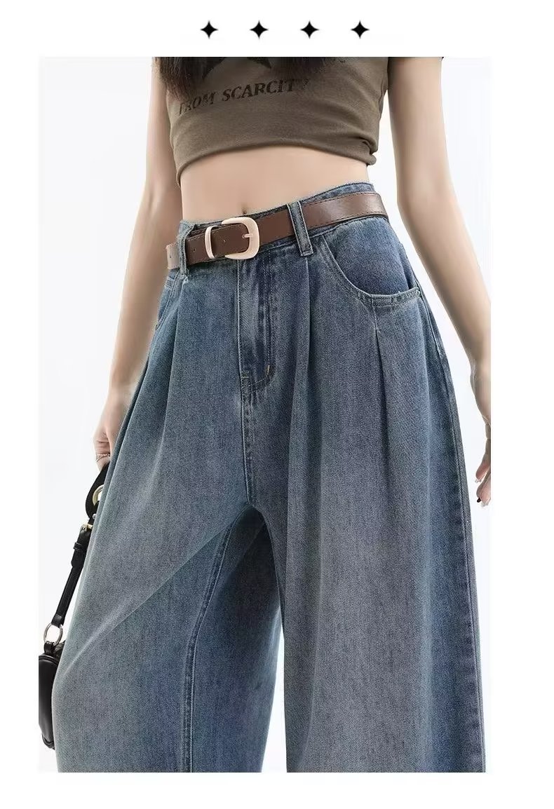 复古阔腿牛仔裤女夏季2025年新款高腰显瘦遮跨设计感梨形身材裤子