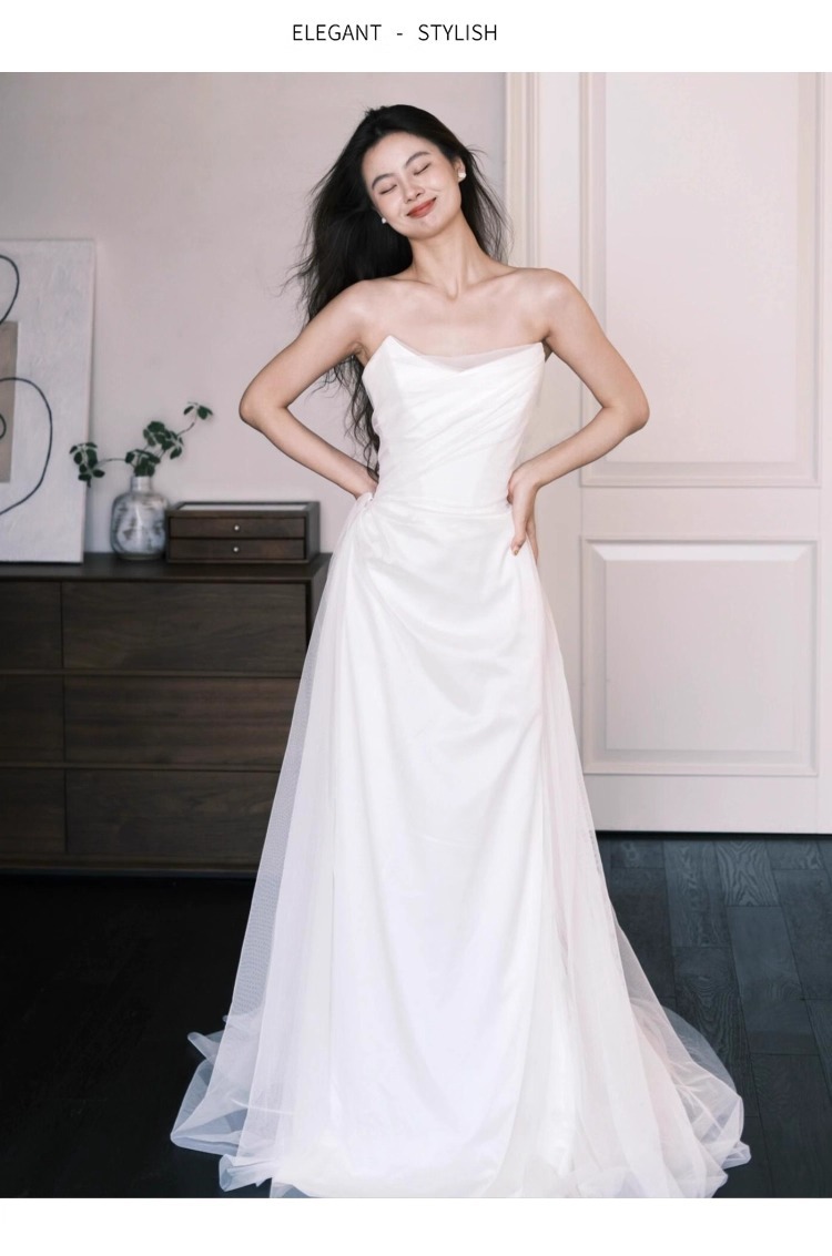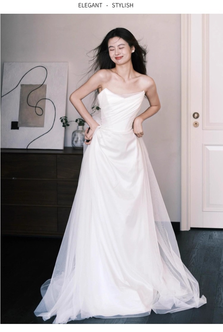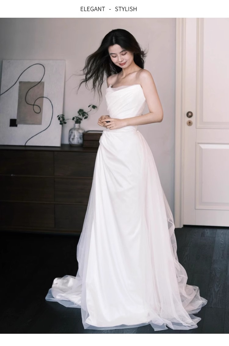 法式抹胸轻婚纱新娘森系出门纱缎面白色订婚敬酒服小拖尾迎宾礼服