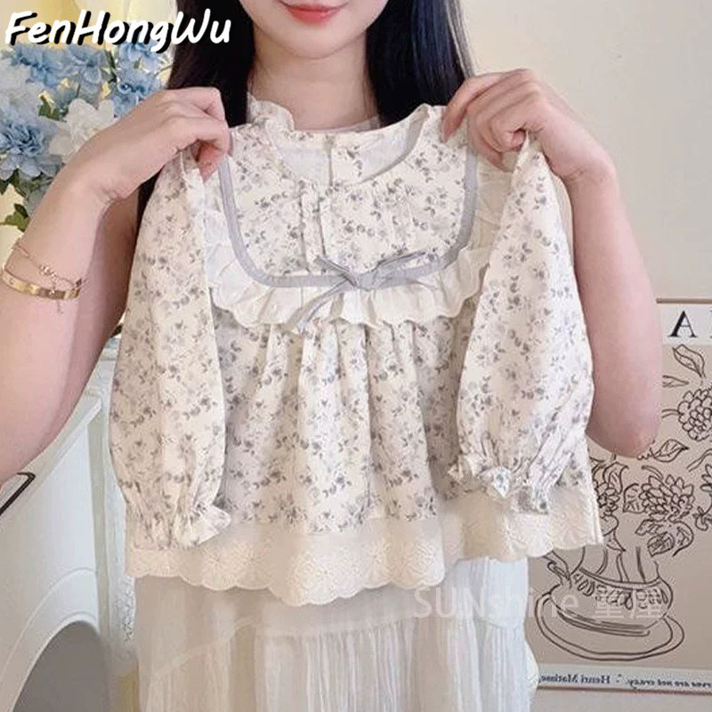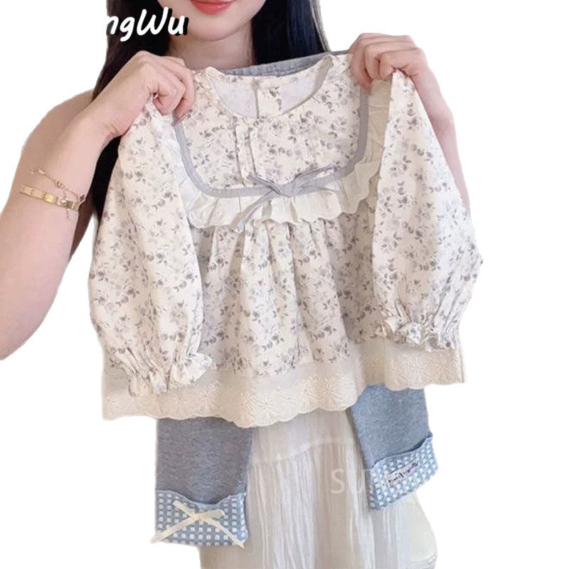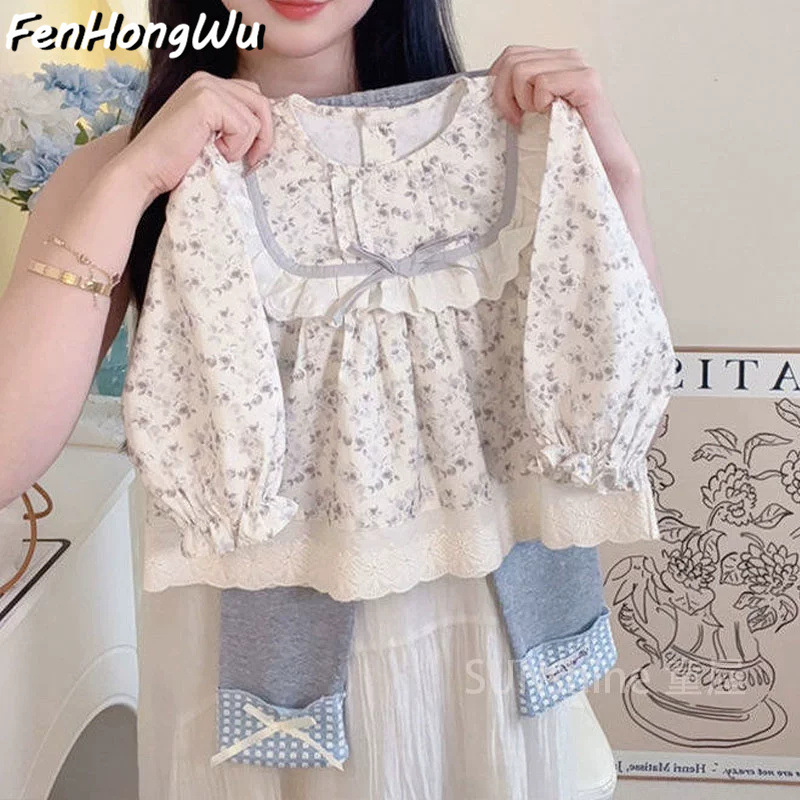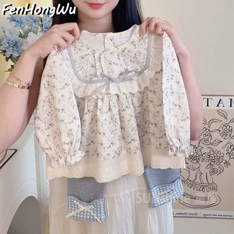 【粉红屋】女童娃娃领衬衫套装春碎花蕾丝边娃娃衫打底裤套装跨境