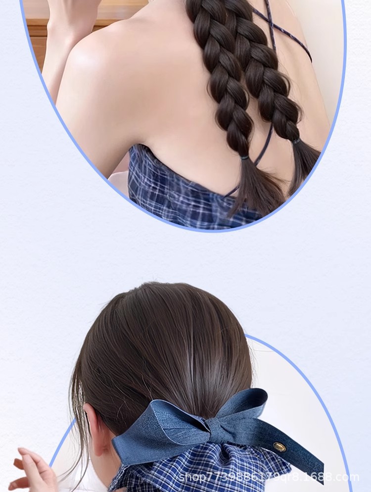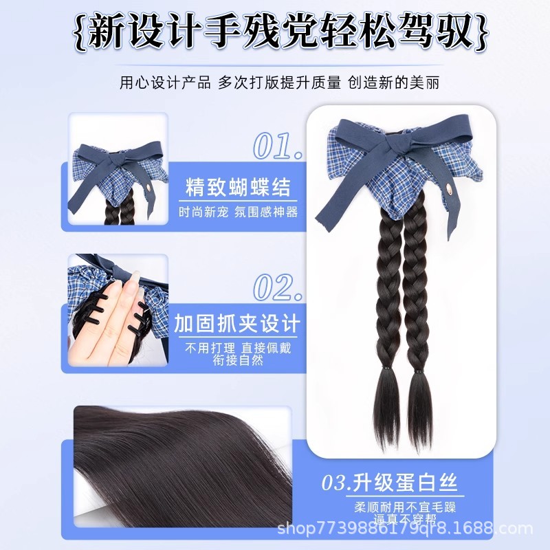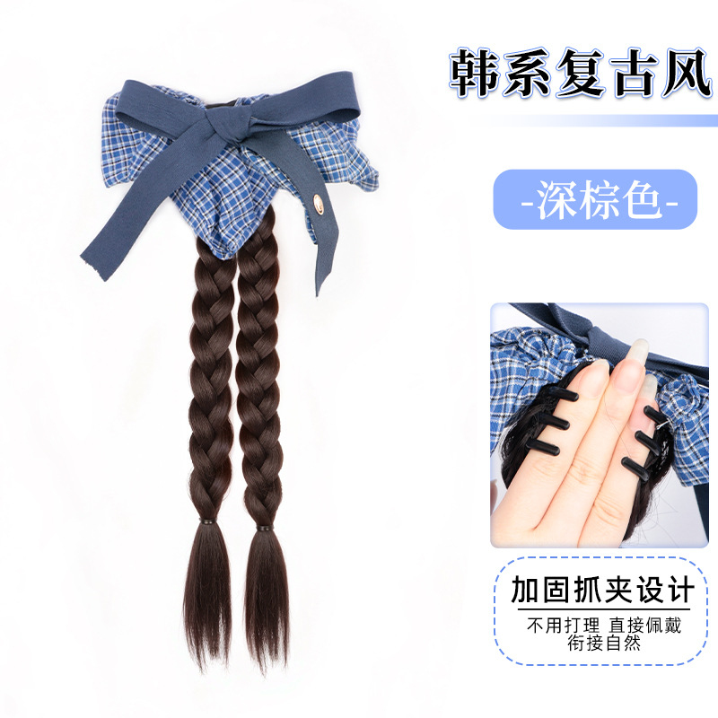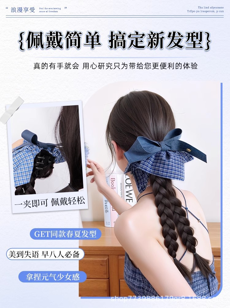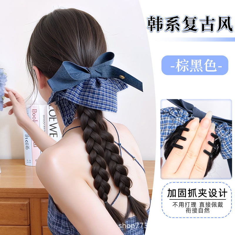 假发辫子马尾韩系蓝格纹蝴蝶结双麻花辫长辫子发饰仿真抓夹低马尾