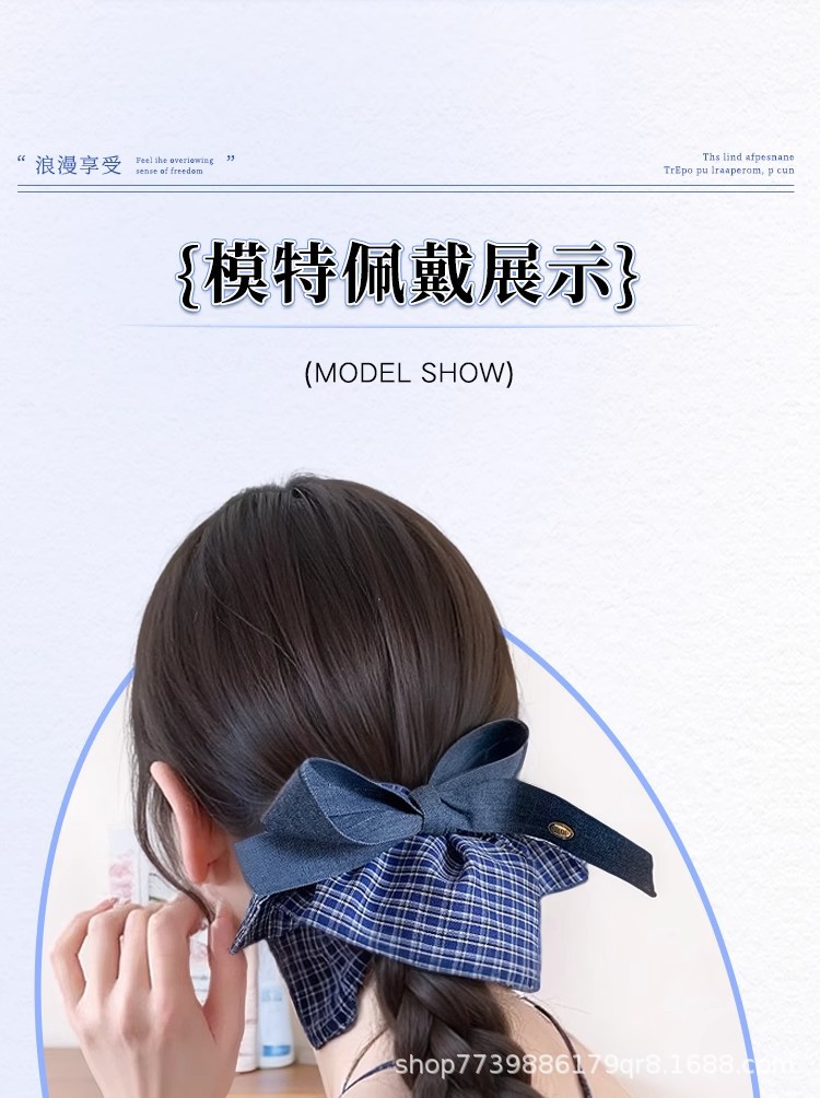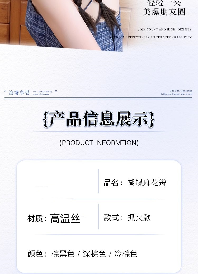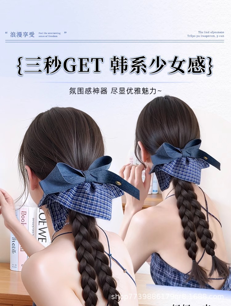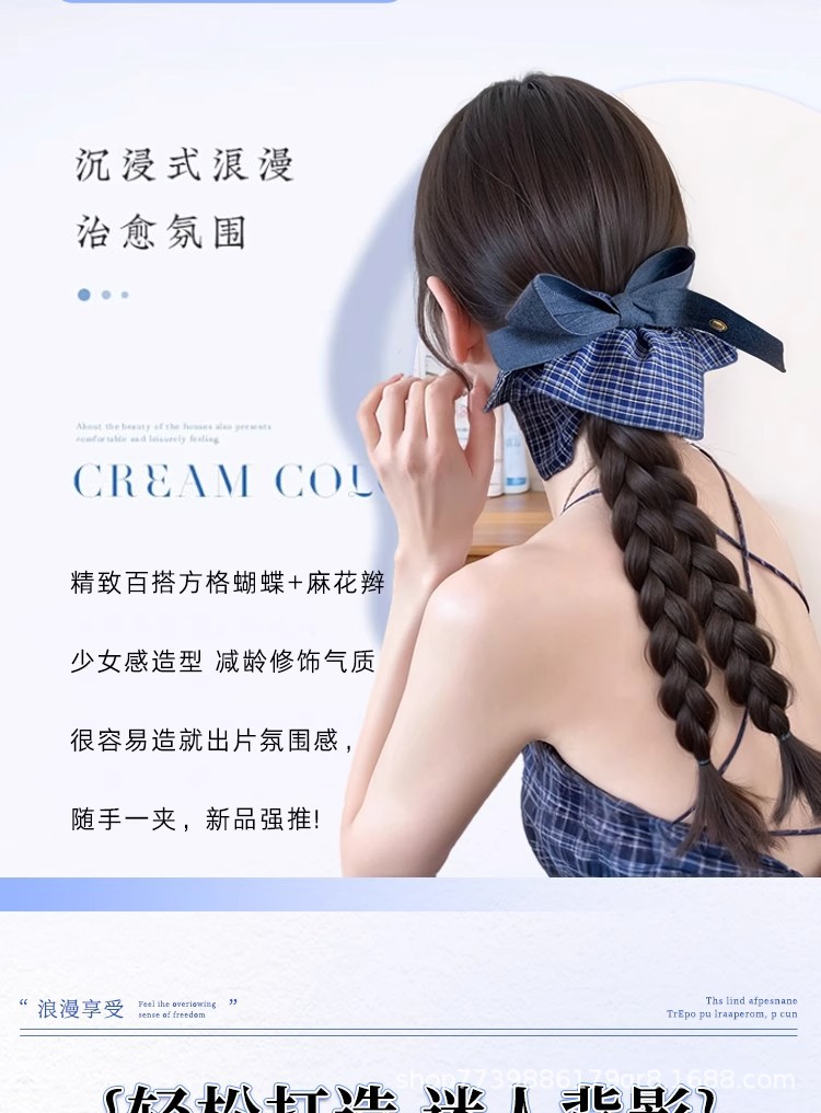 假发辫子马尾韩系蓝格纹蝴蝶结双麻花辫长辫子发饰仿真抓夹低马尾