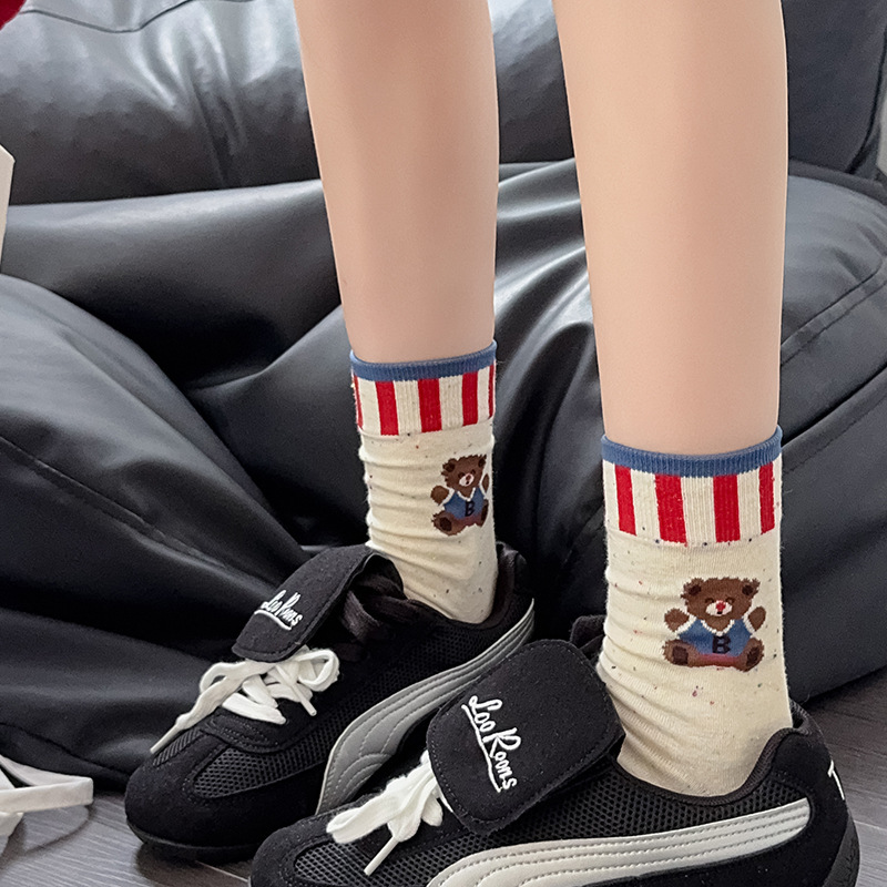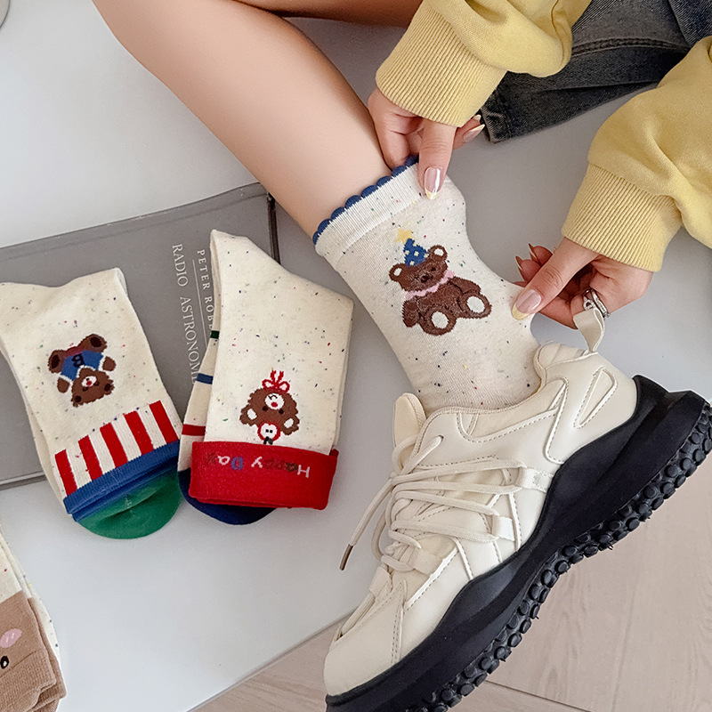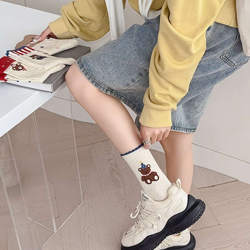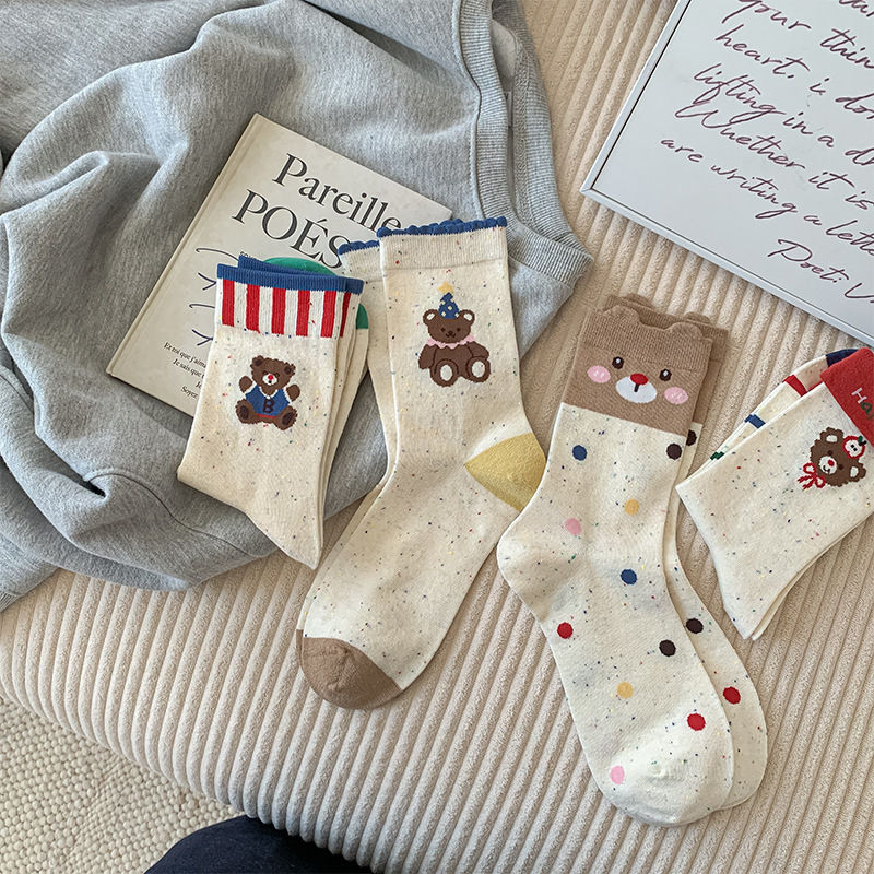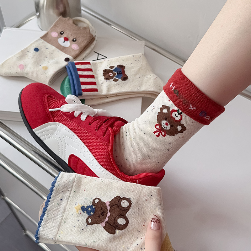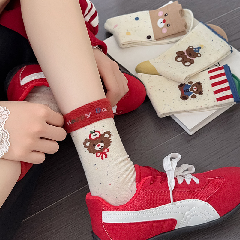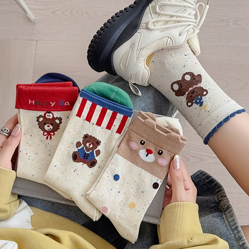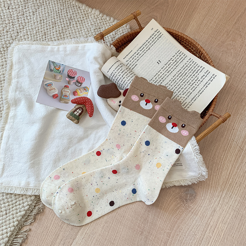 2025秋季新品 韩版ins风可爱卡通小熊棉质堆堆袜点子纱中筒袜