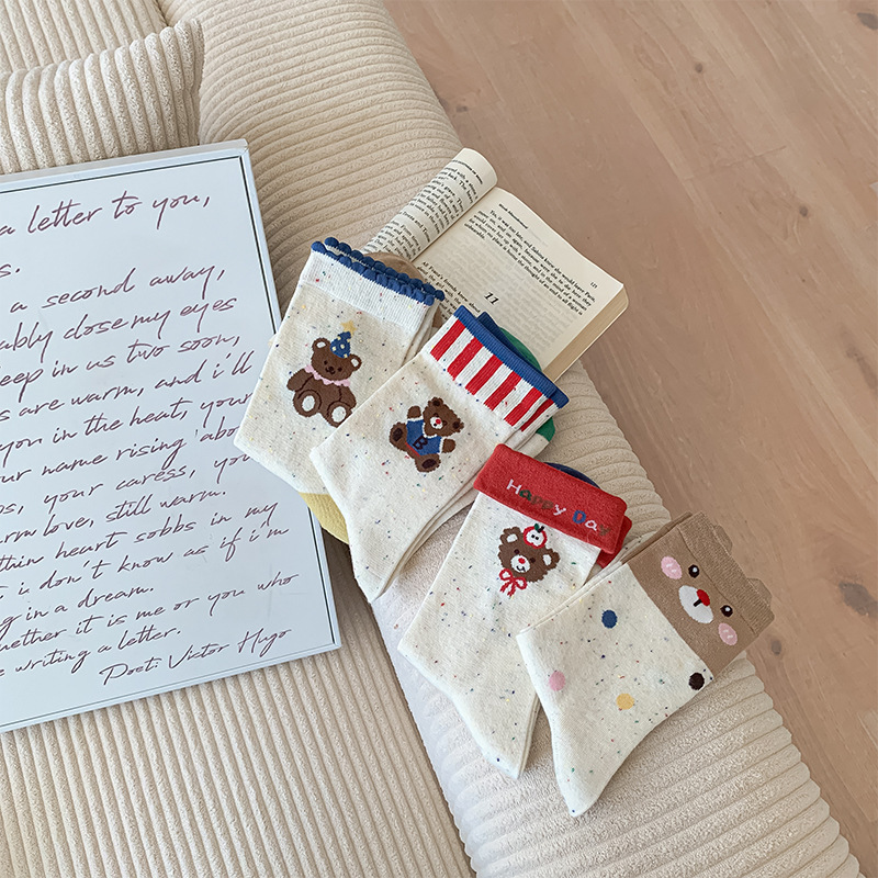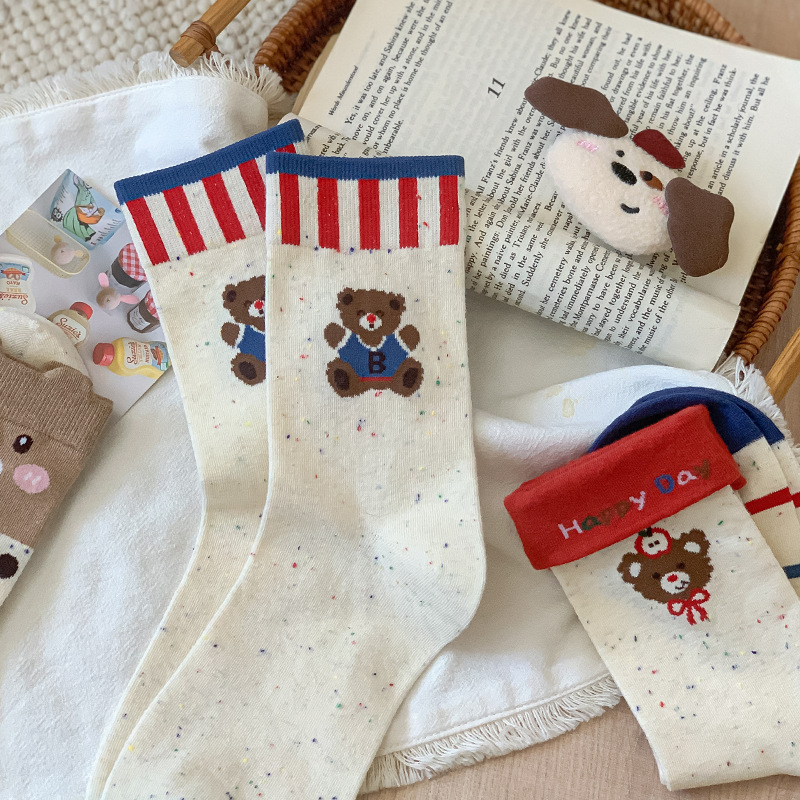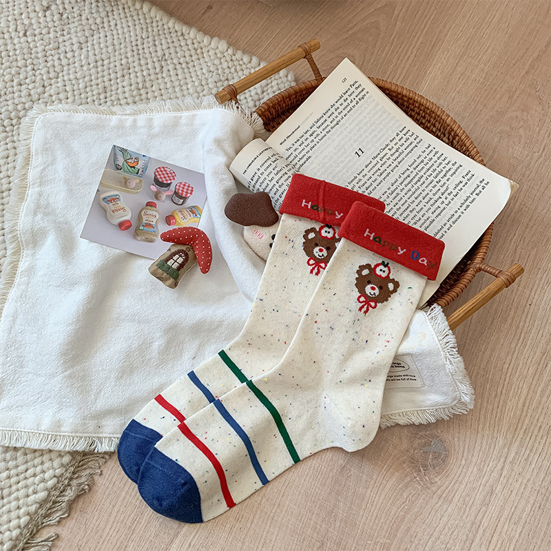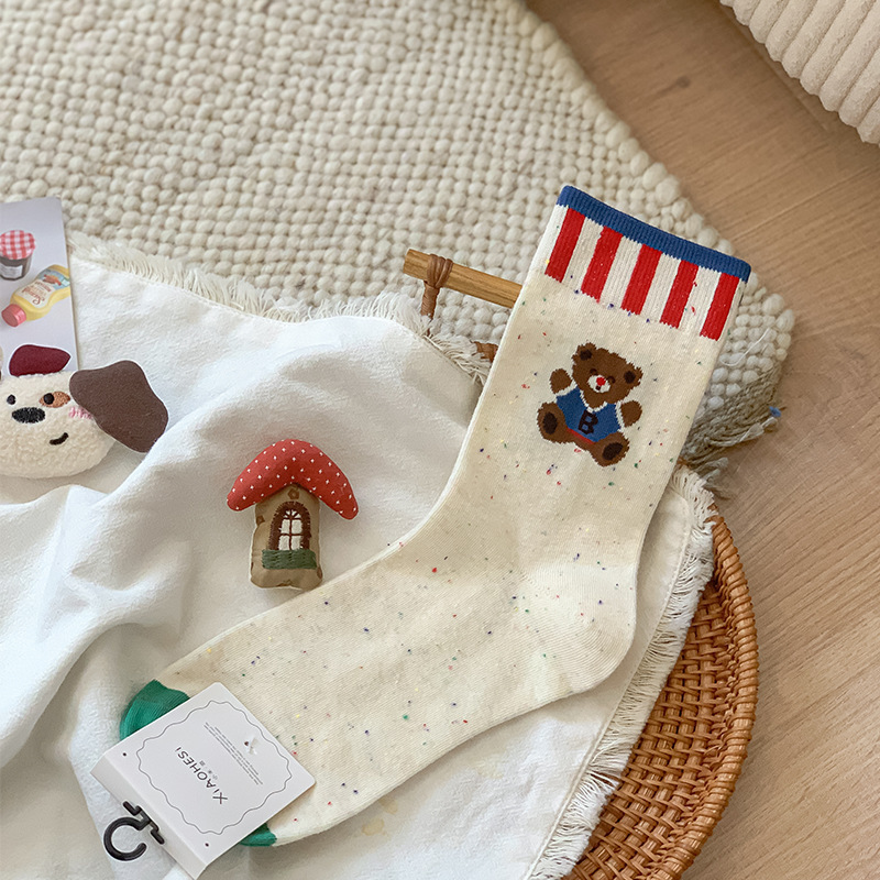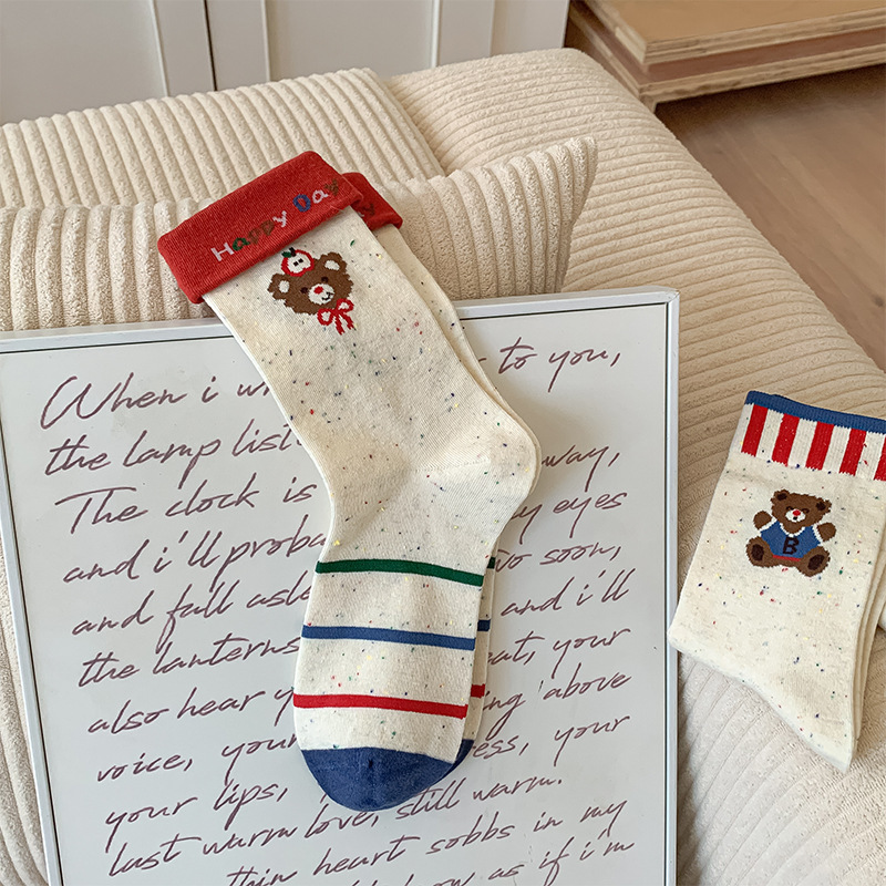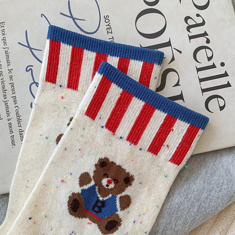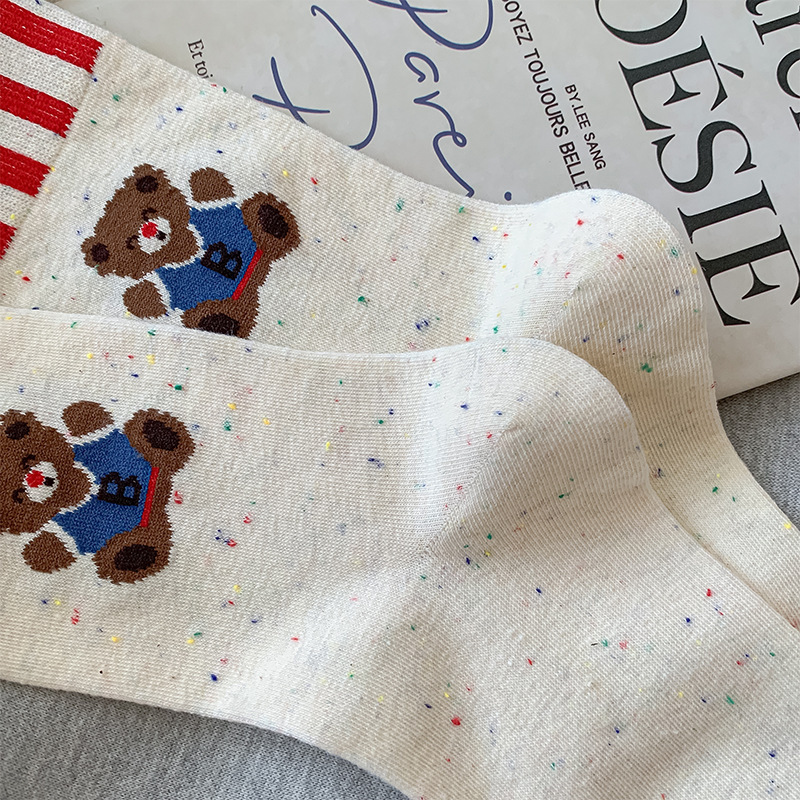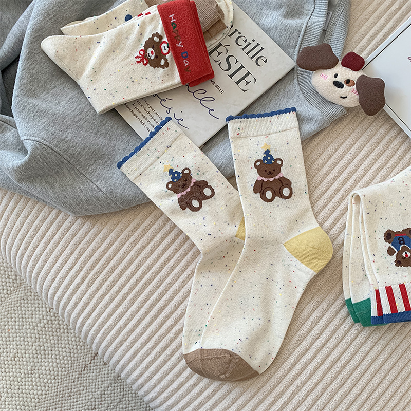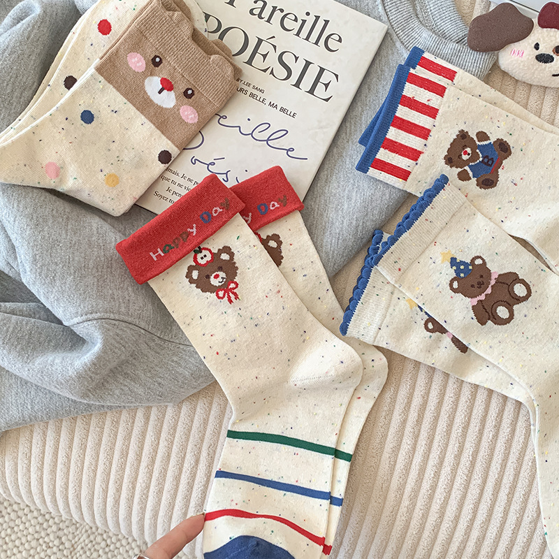 2025秋季新品 韩版ins风可爱卡通小熊棉质堆堆袜点子纱中筒袜