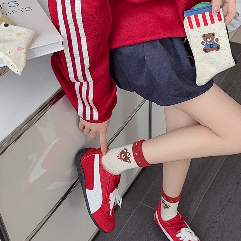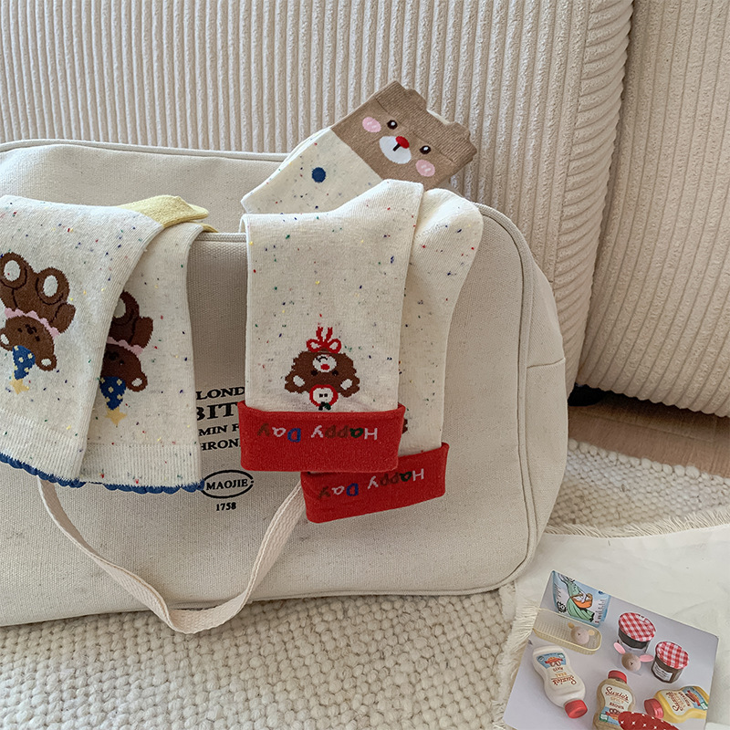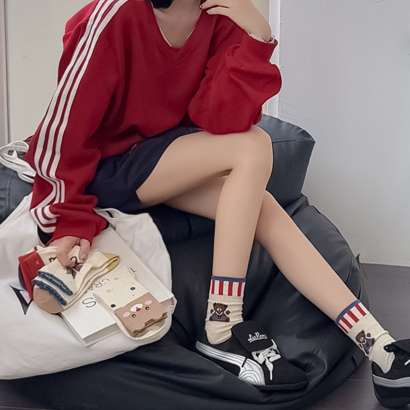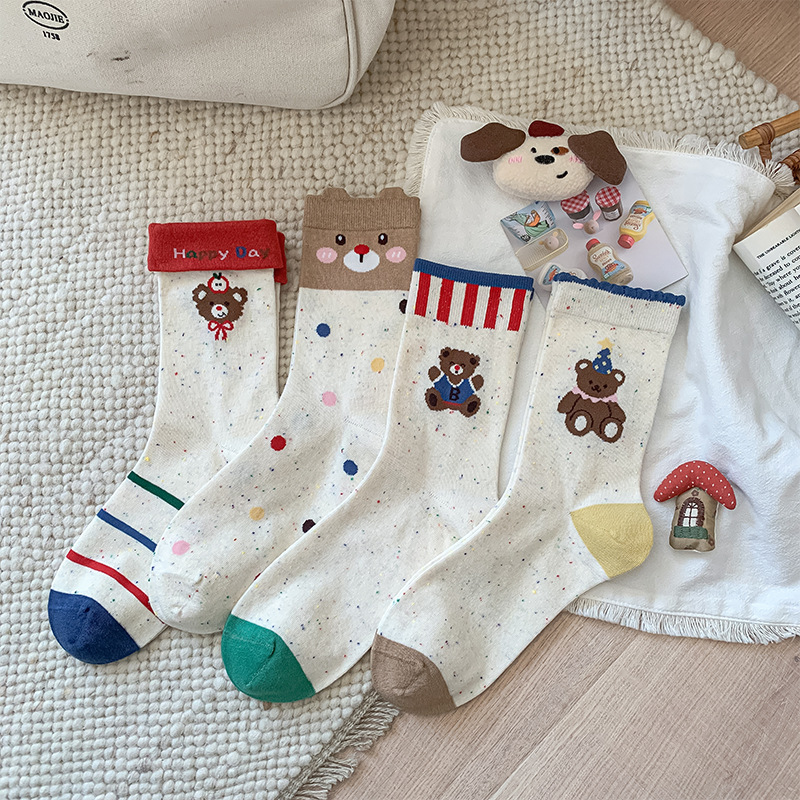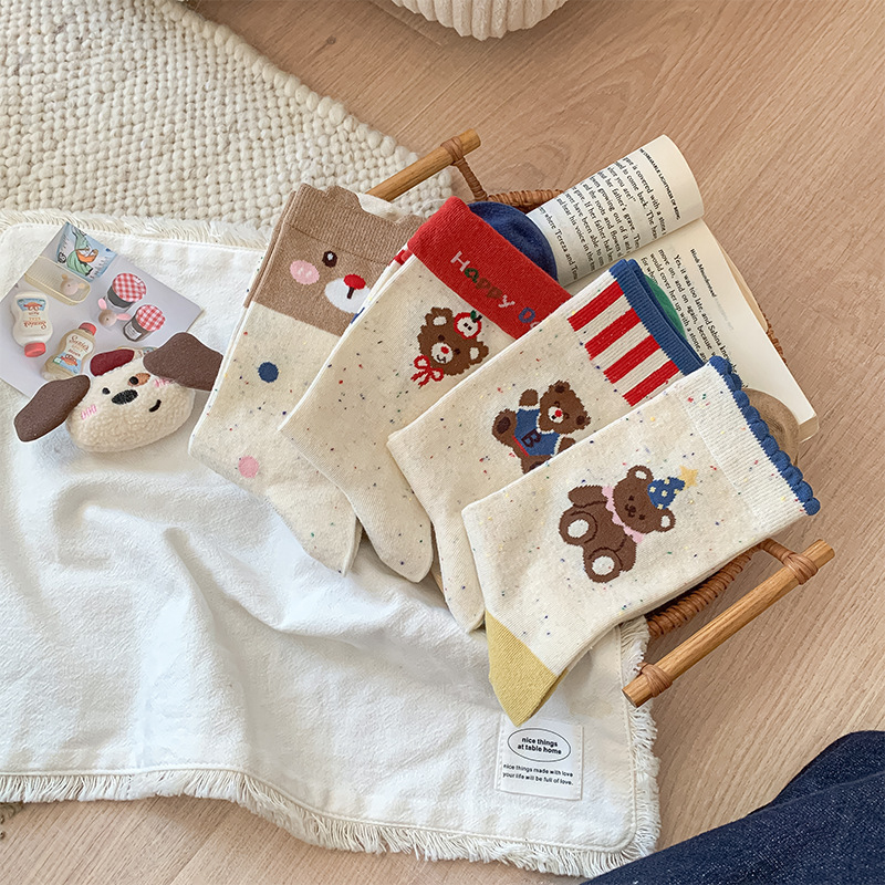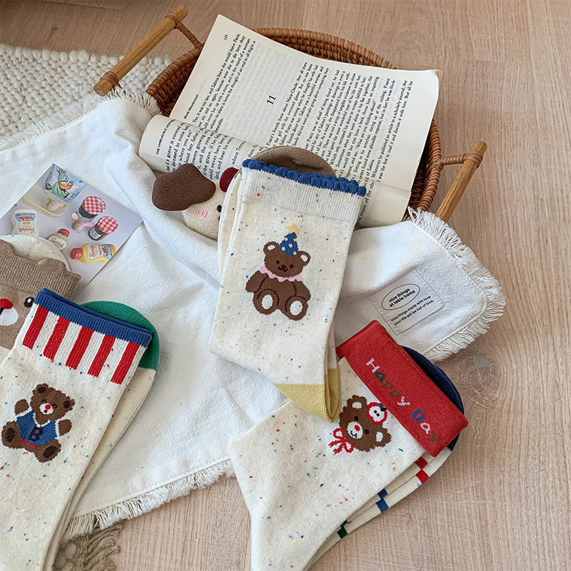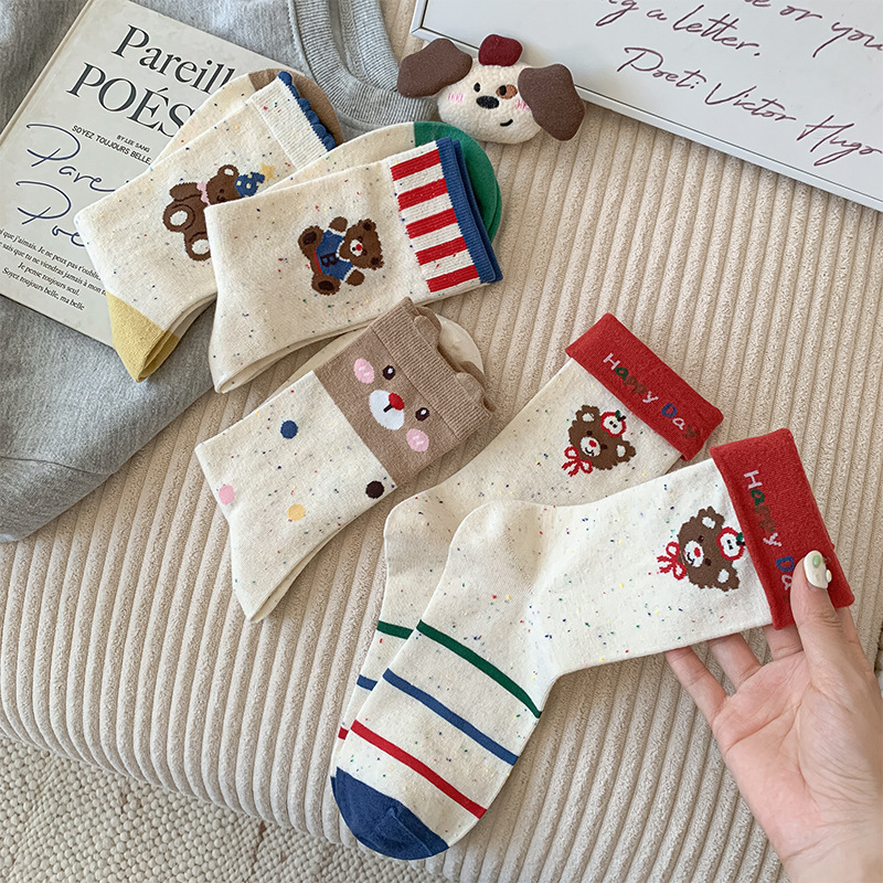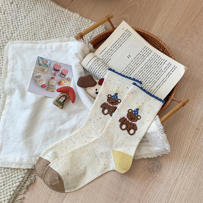 2025秋季新品 韩版ins风可爱卡通小熊棉质堆堆袜点子纱中筒袜