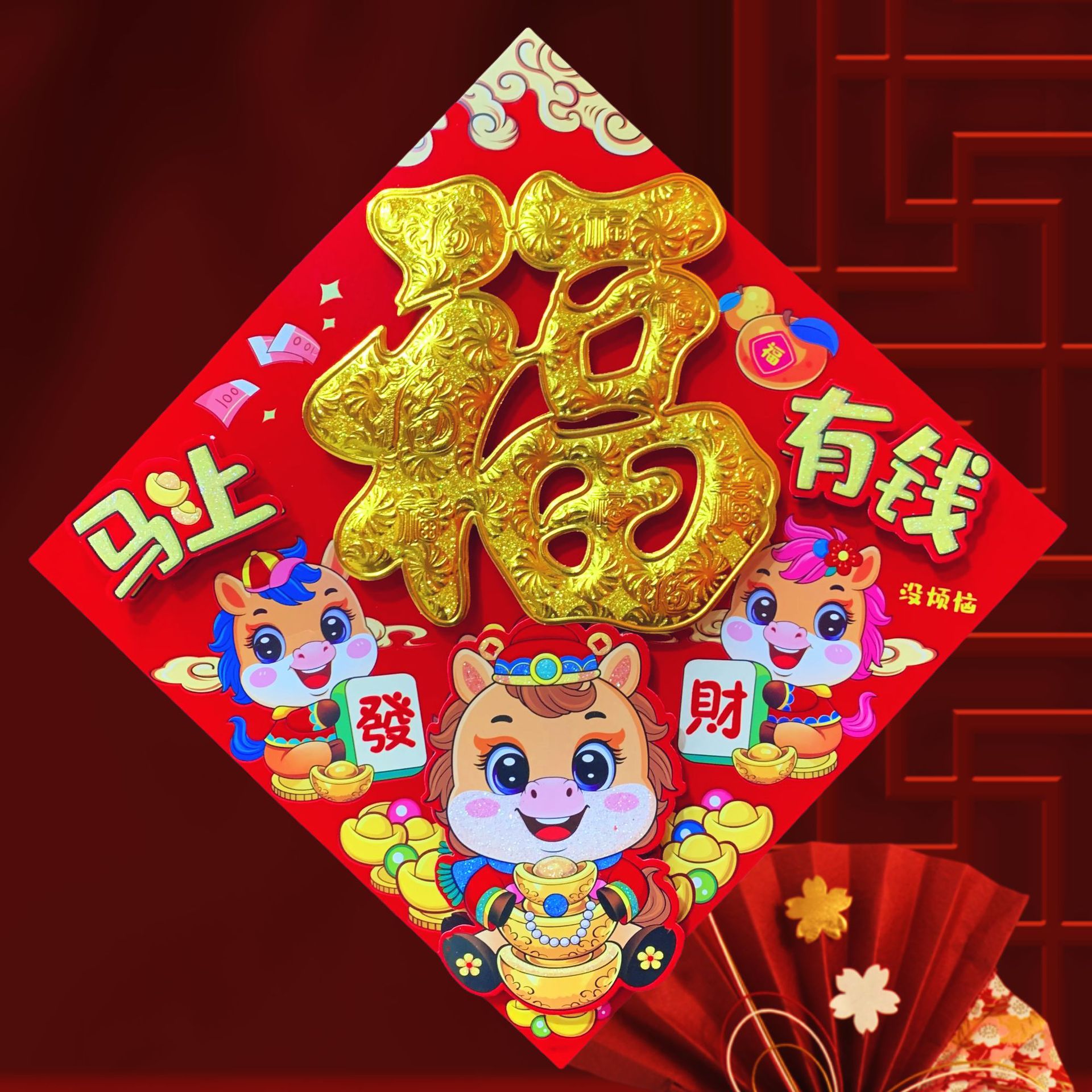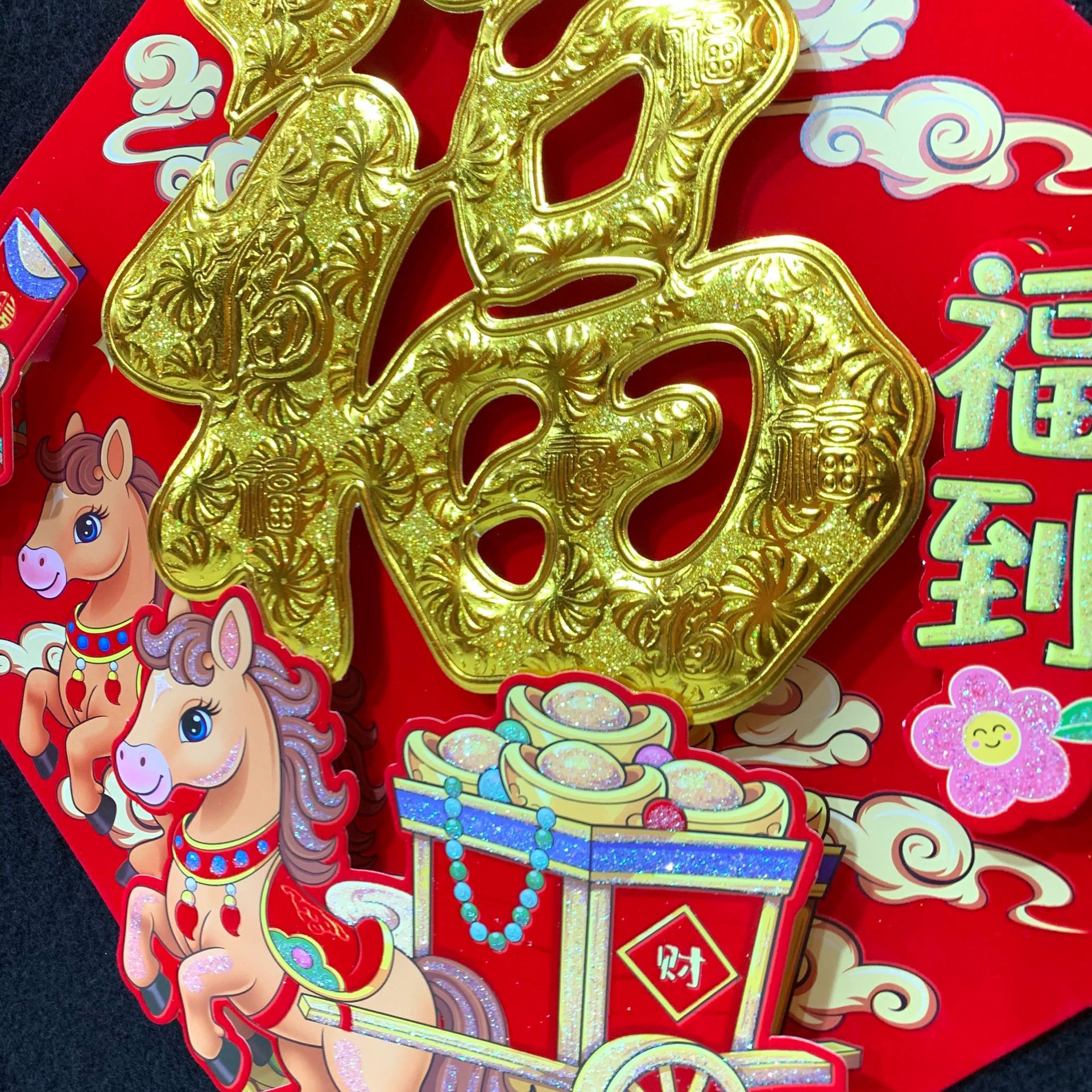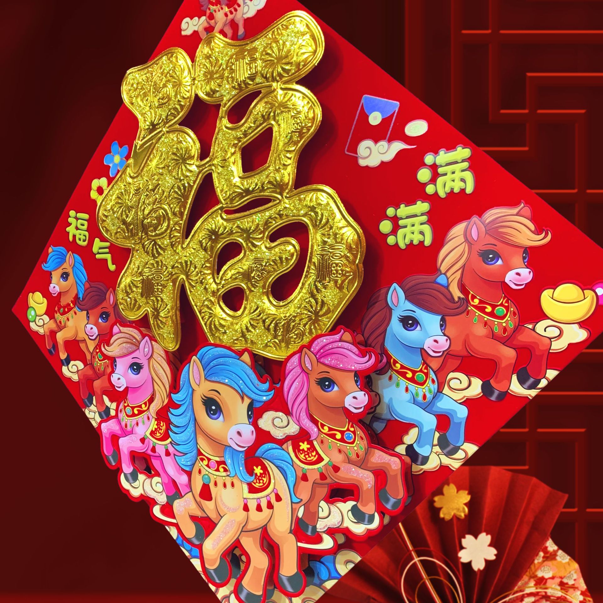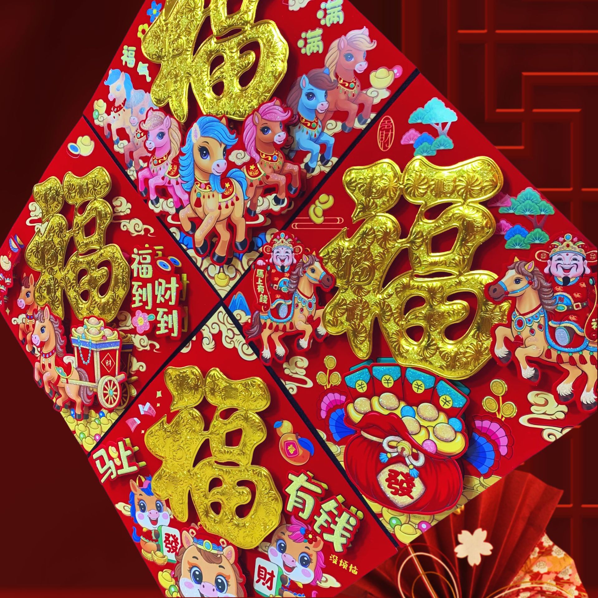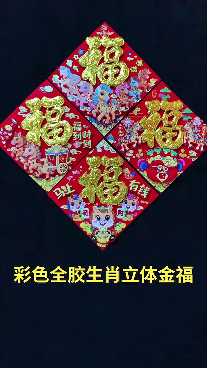 新品上市,彩色全胶生肖植绒立体金福,40# 1.6元一张,50# 2.4元一张,真马3个款卡通马1个款,共四个款式,实际尺寸40# 33×33cm.50# 43.5×43.5cm新款上市.款式混搭发货, 底板全胶硬白卡纸植绒彩色印花+福字撒粉加烫金,+配件马植绒撒水晶粉工艺,高端大气上档次……箱装清装数量:40# 400/箱,50# 300/箱