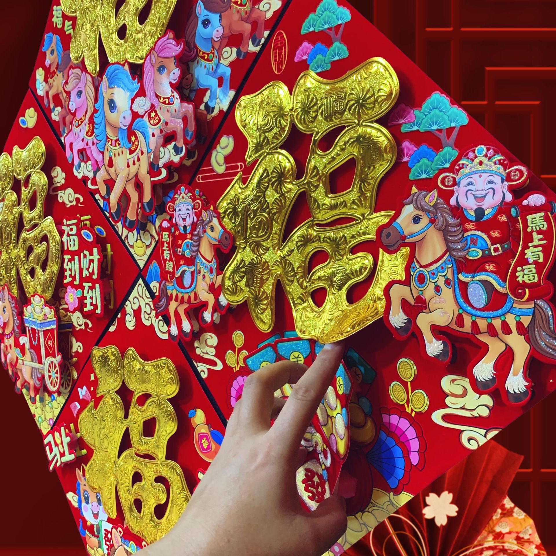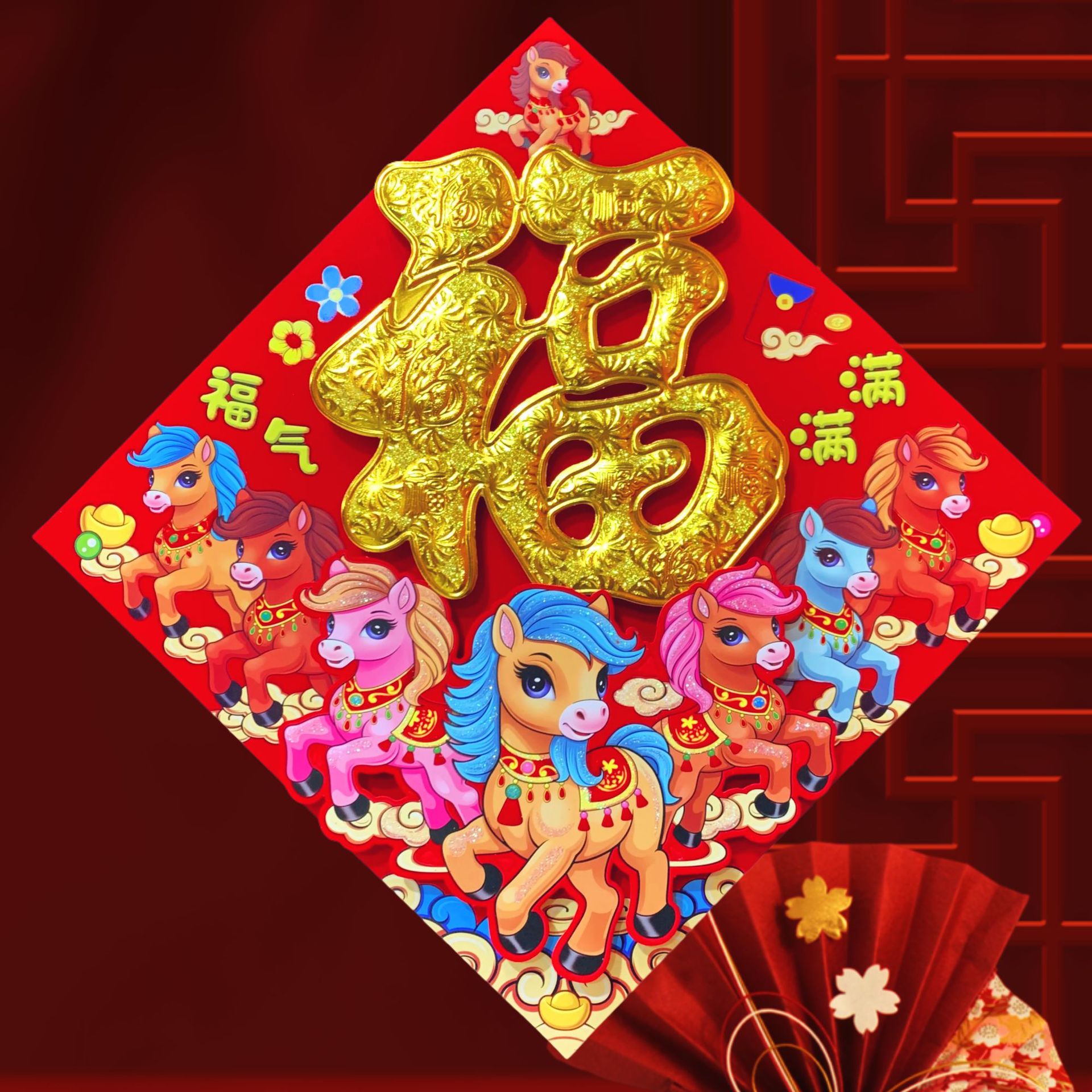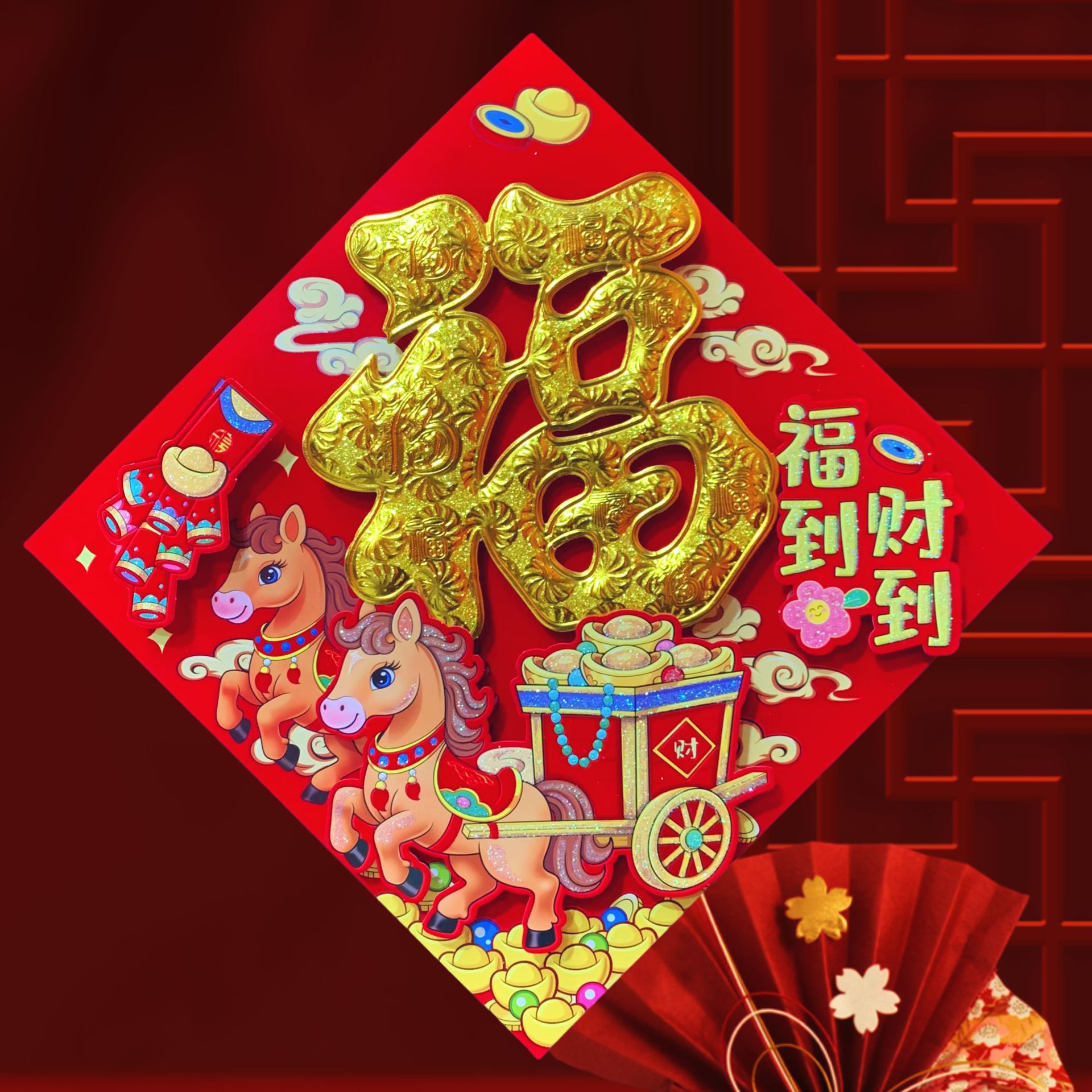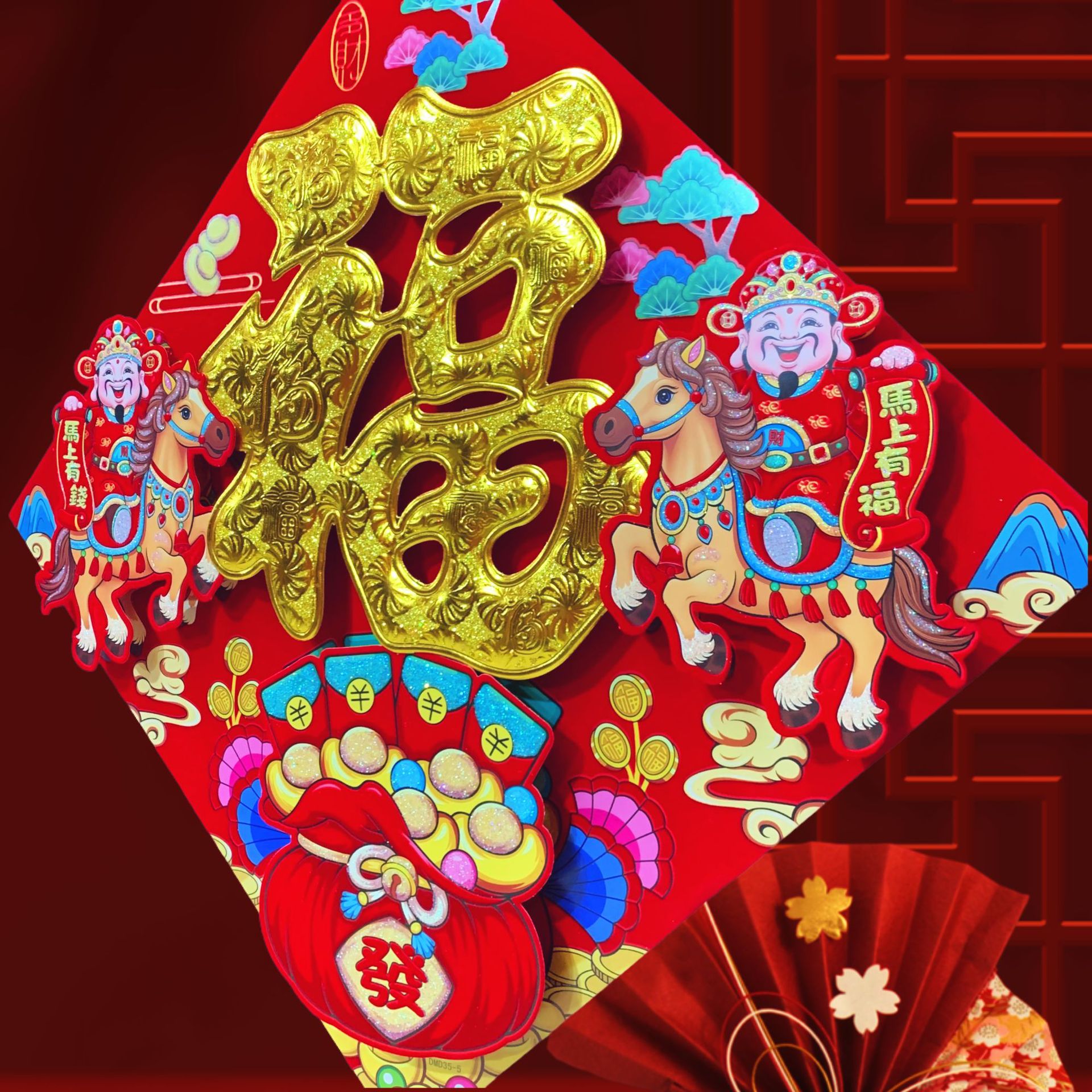 新品上市,彩色全胶生肖植绒立体金福,40# 1.6元一张,50# 2.4元一张,真马3个款卡通马1个款,共四个款式,实际尺寸40# 33×33cm.50# 43.5×43.5cm新款上市.款式混搭发货, 底板全胶硬白卡纸植绒彩色印花+福字撒粉加烫金,+配件马植绒撒水晶粉工艺,高端大气上档次……箱装清装数量:40# 400/箱,50# 300/箱