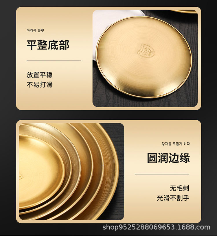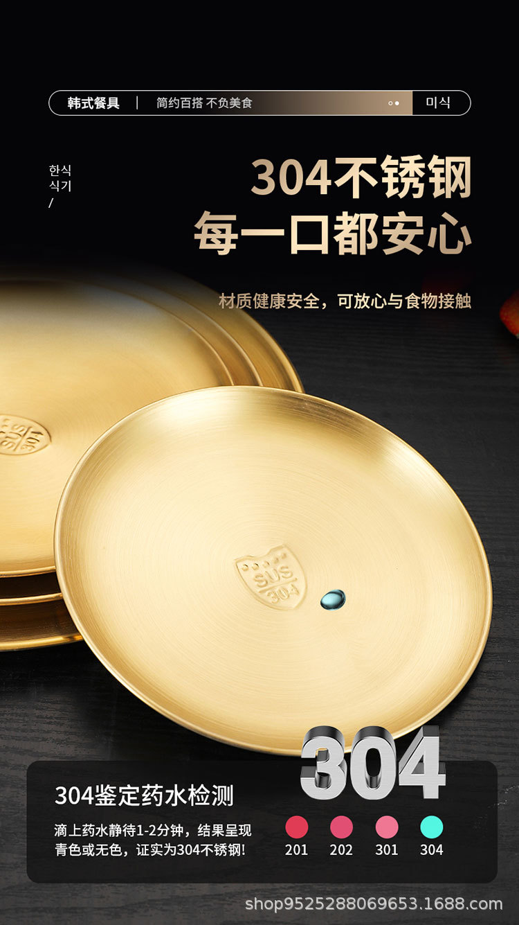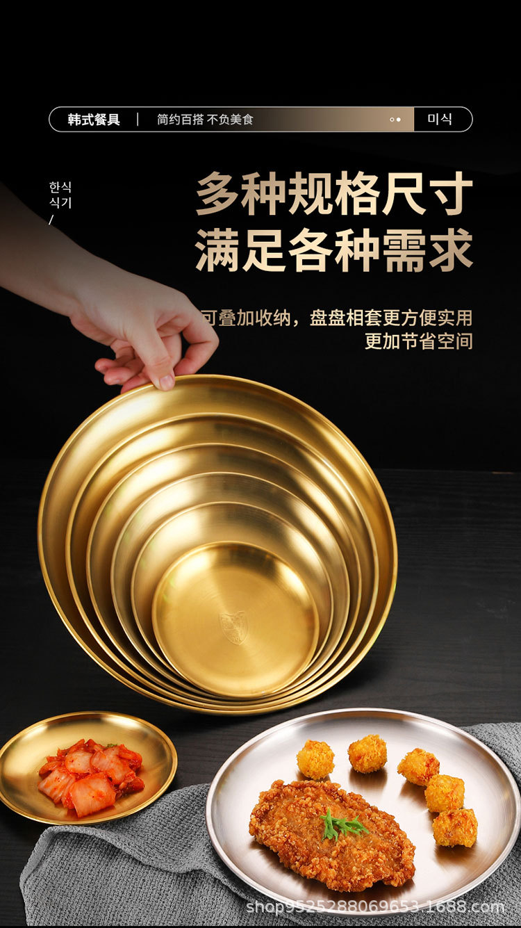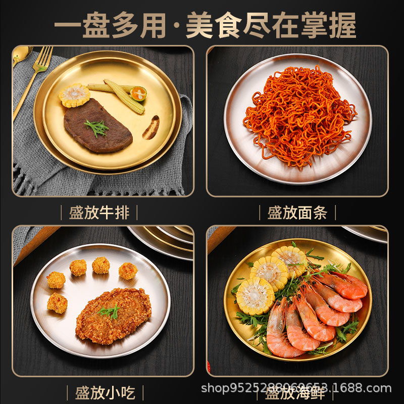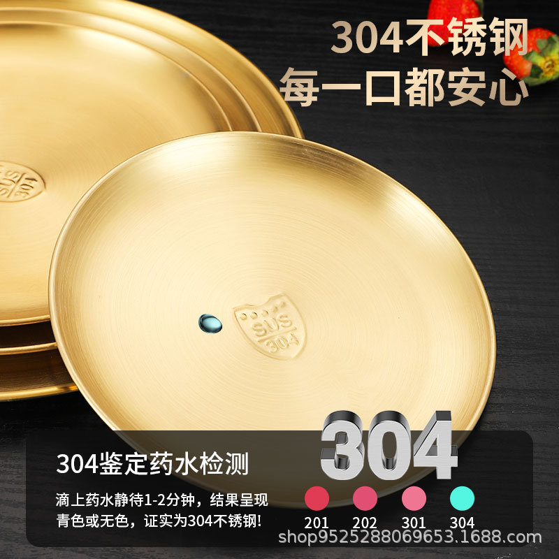 韩式圆盘304不锈钢水果餐盘圆形托盘金色骨碟菜碟商用烤肉浅盘子