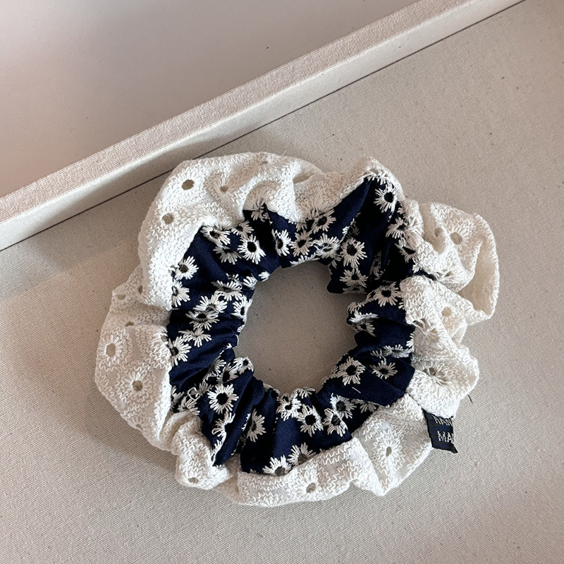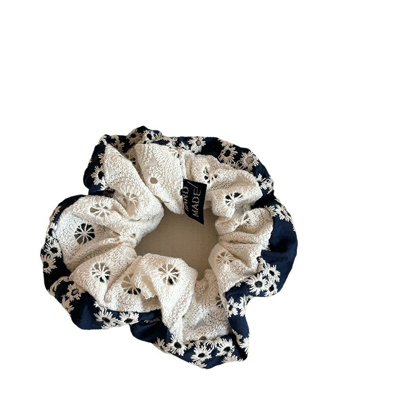 小众民族风棉麻镂空刺绣藏蓝小花拼接褶皱大肠发圈丸子头
