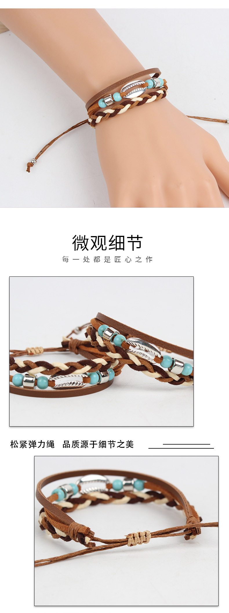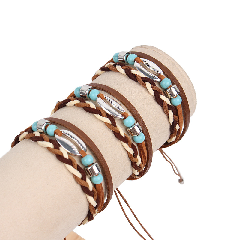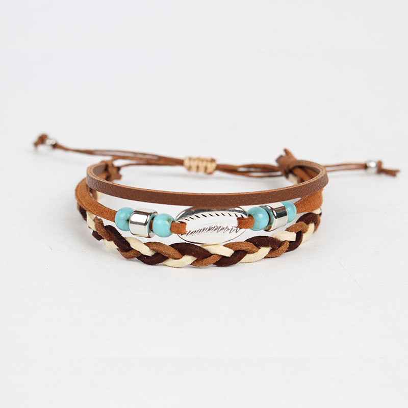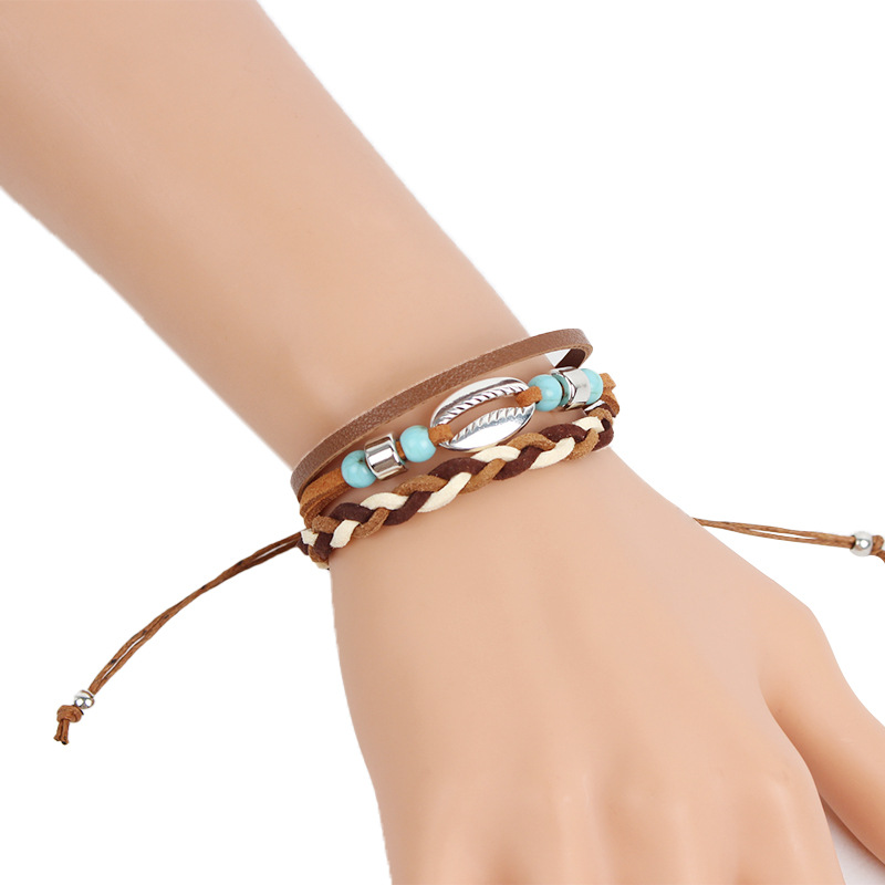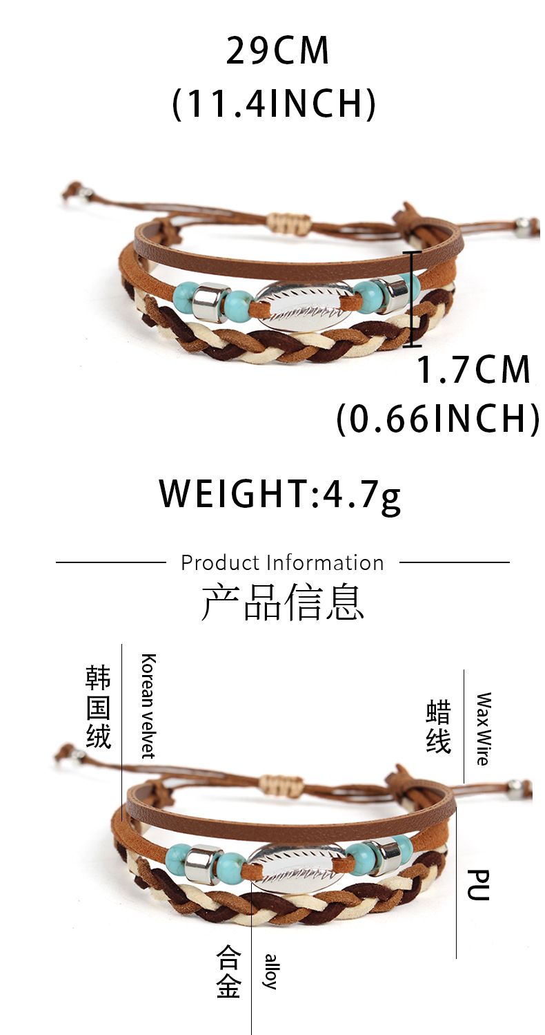 跨境热卖手工编织贝壳手链原创多层复古风皮革手链情侣款手串批发