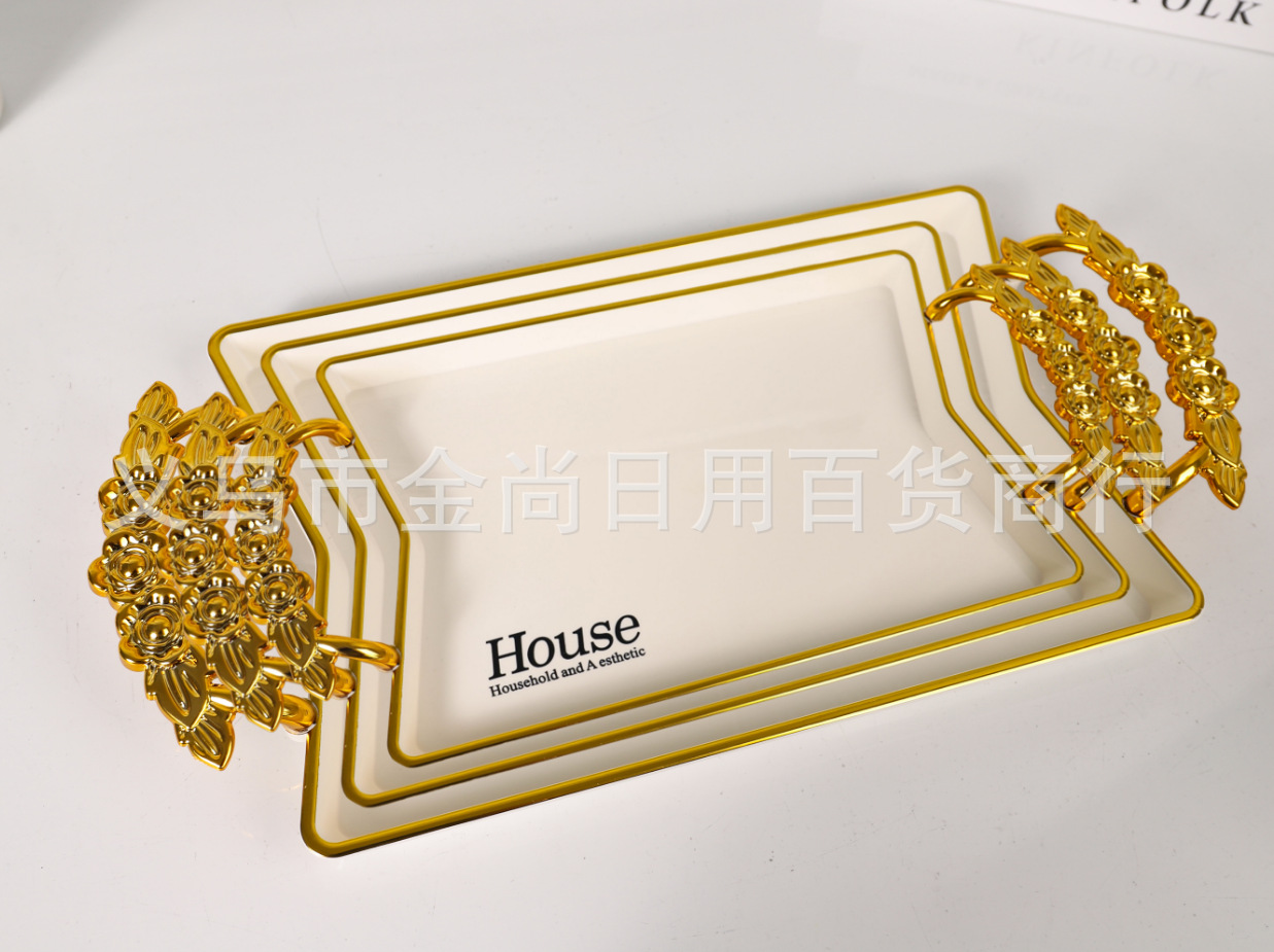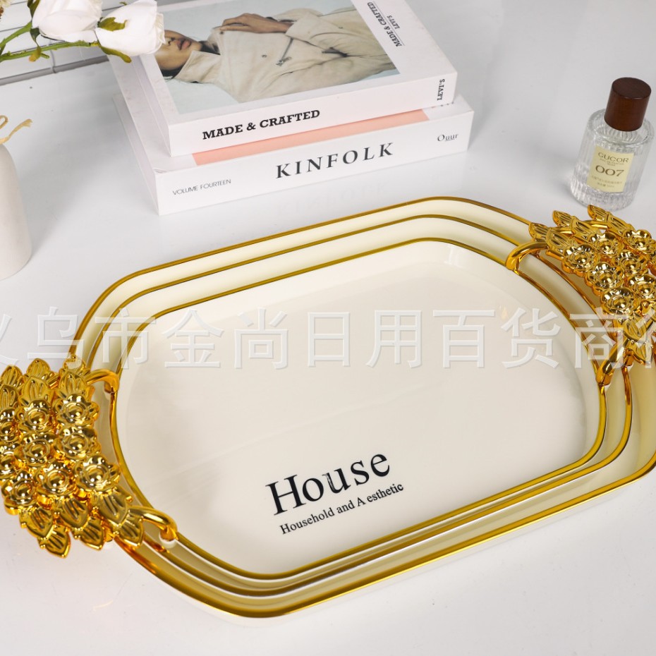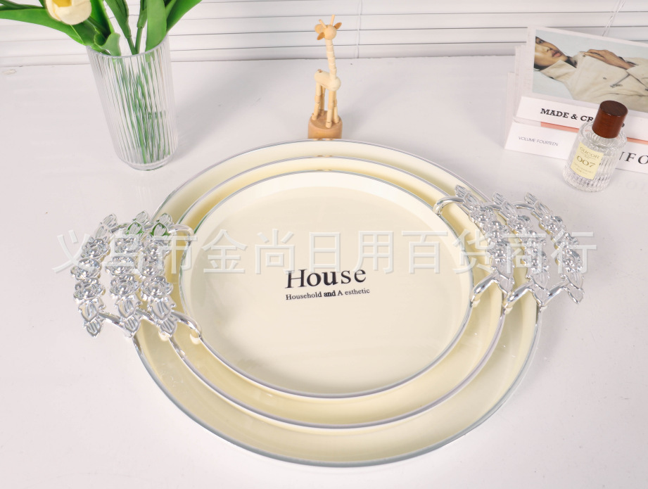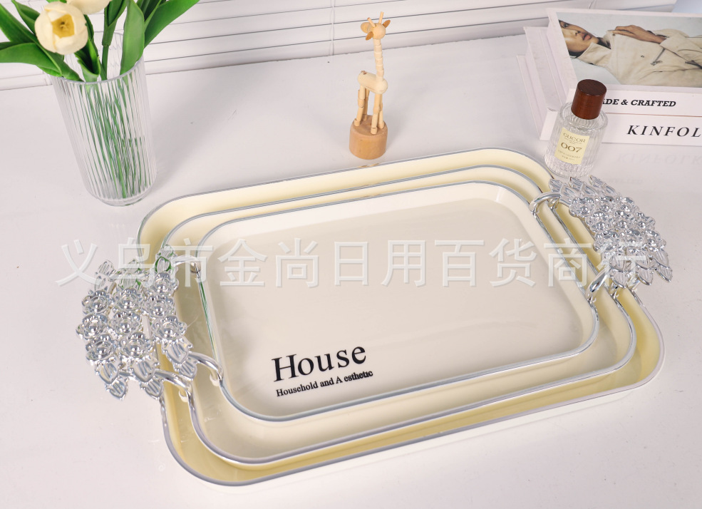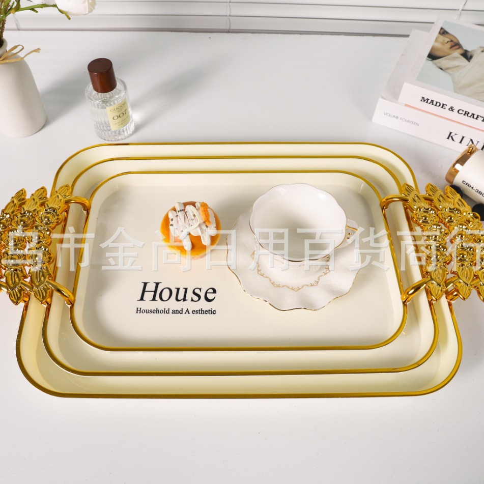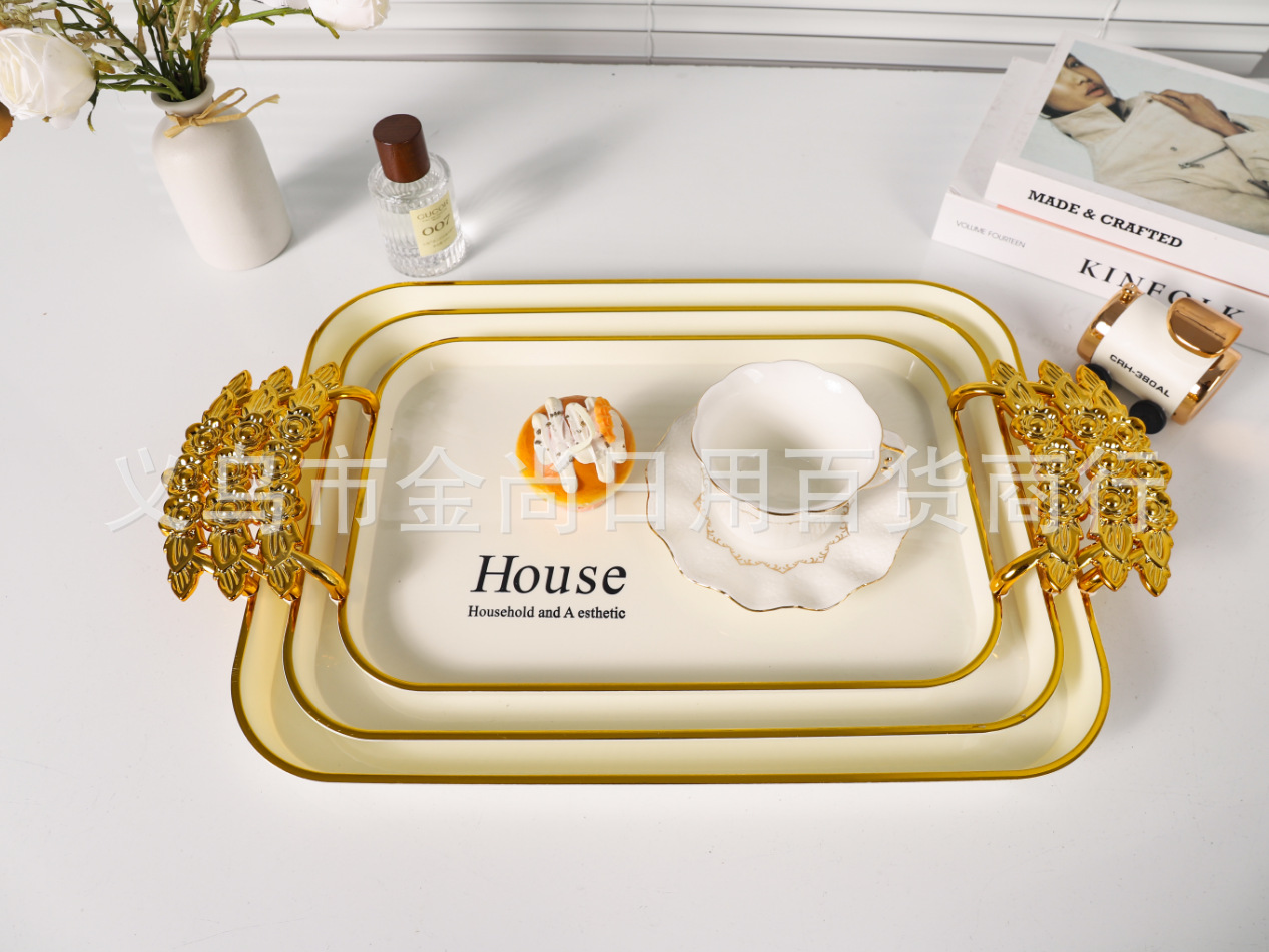 新款餐厅茶盘茶几杯子放茶杯水杯家用玫瑰手柄轻奢托盘白金