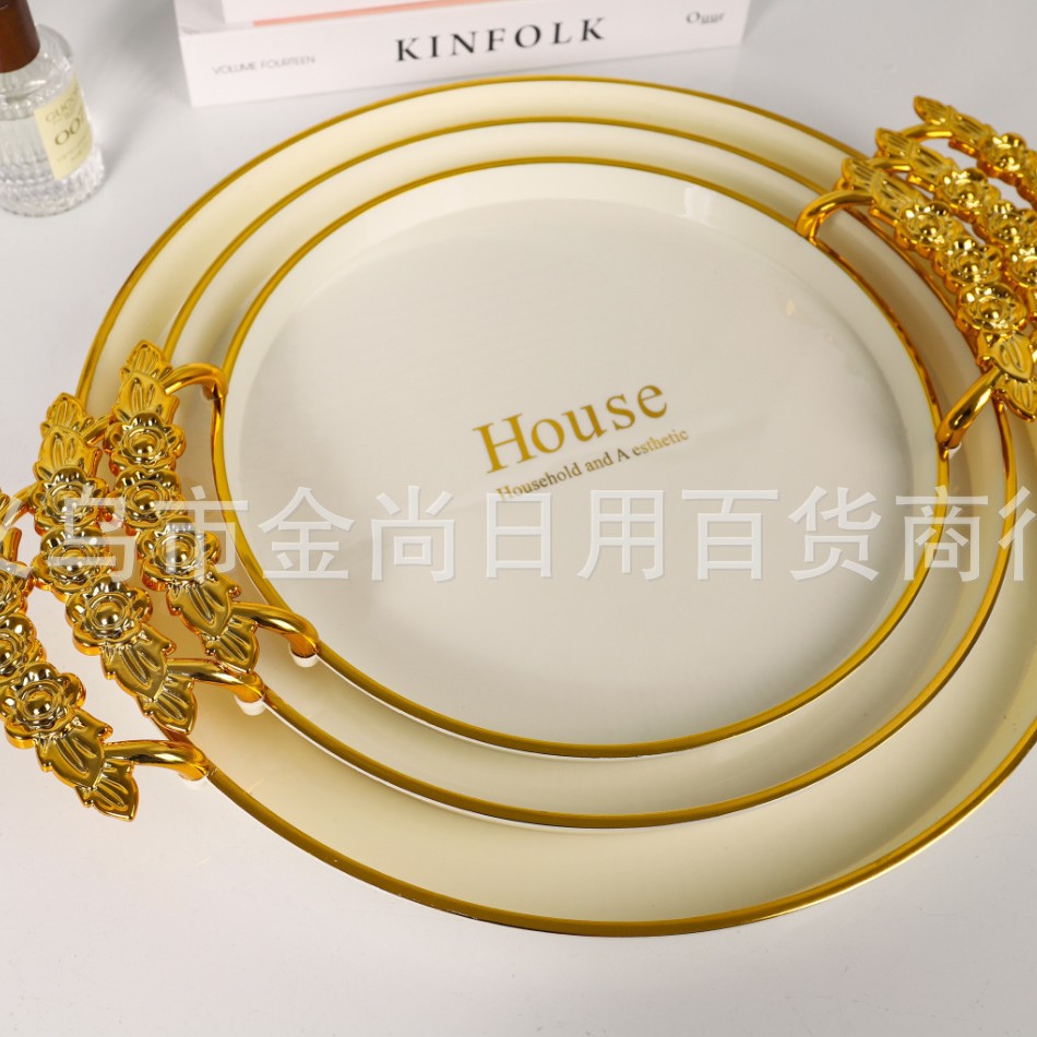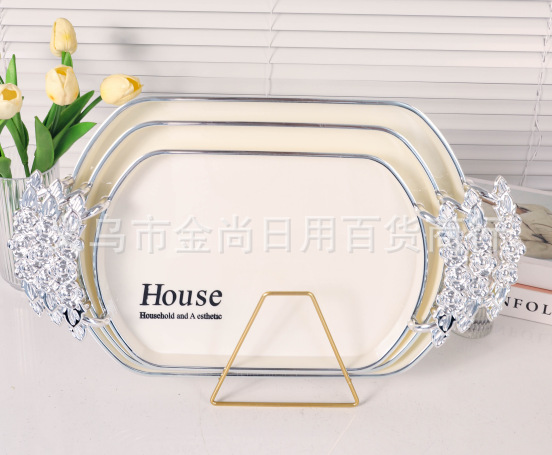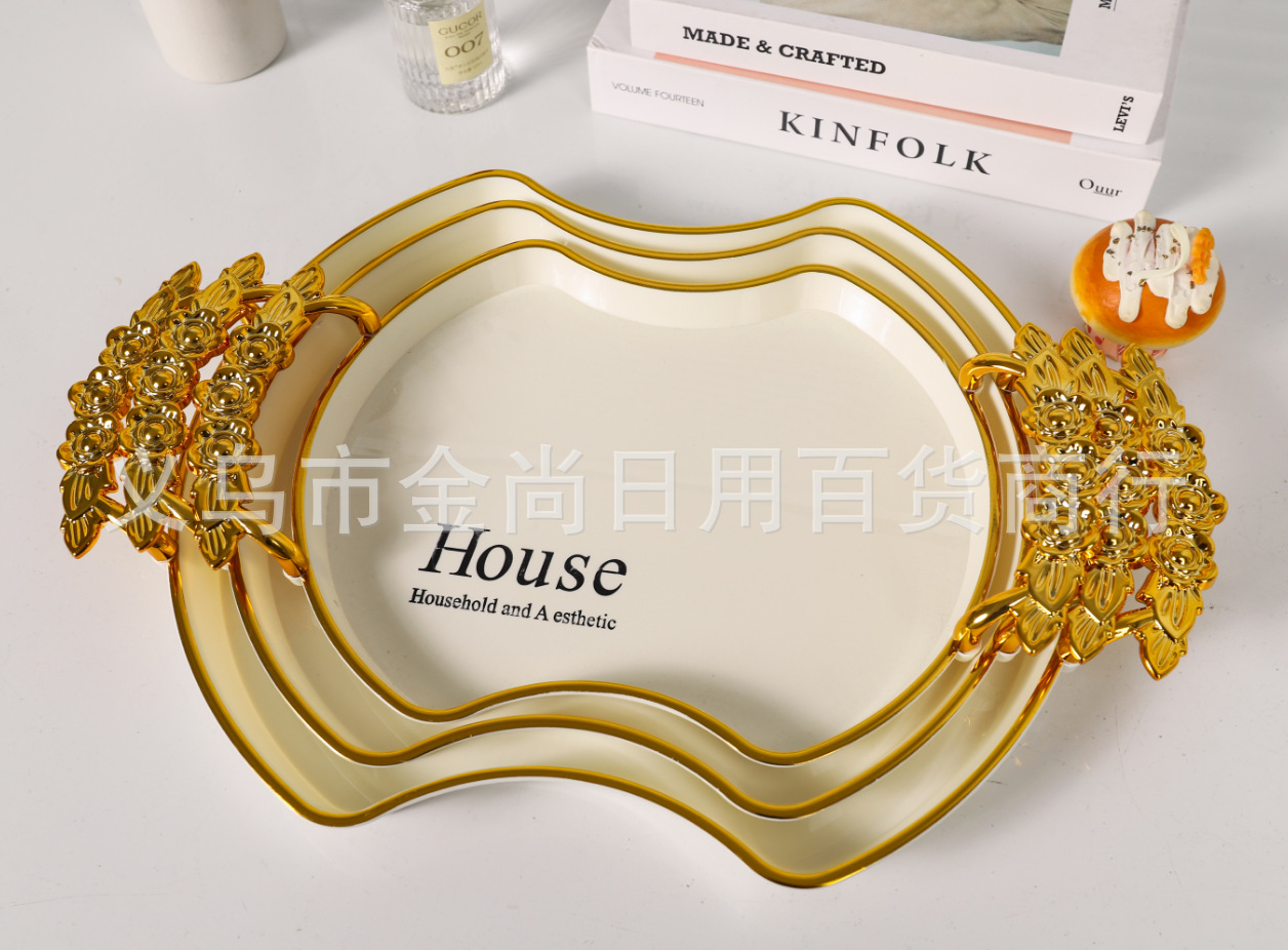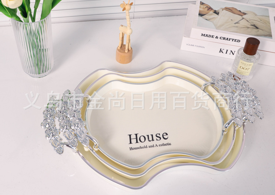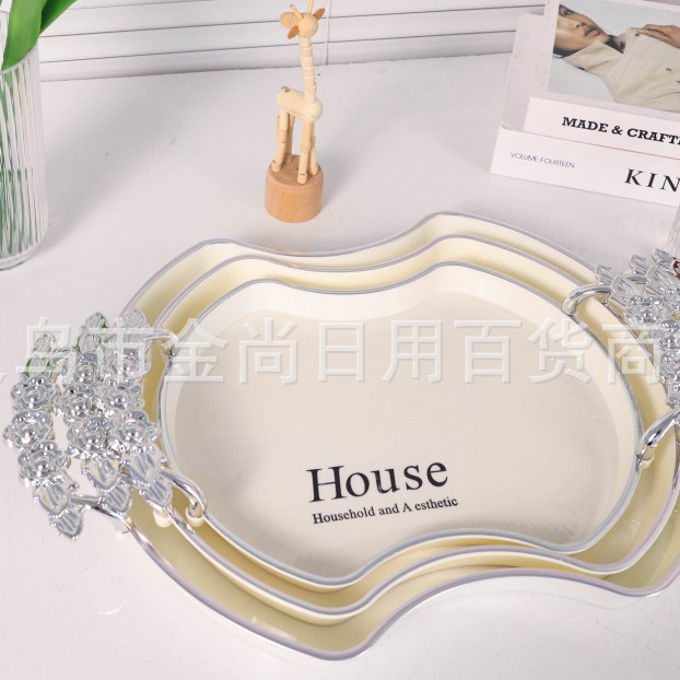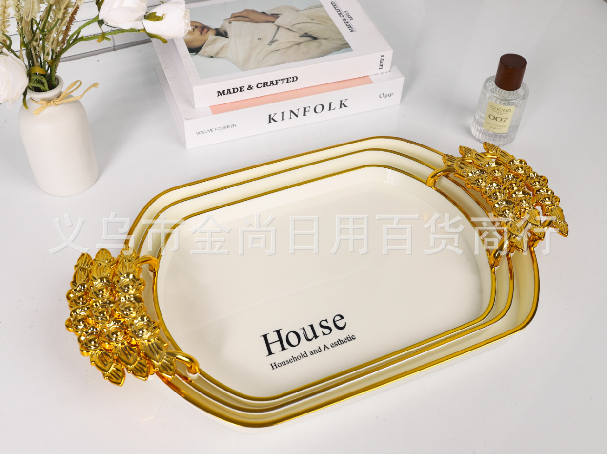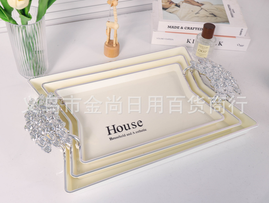 新款餐厅茶盘茶几杯子放茶杯水杯家用玫瑰手柄轻奢托盘白金