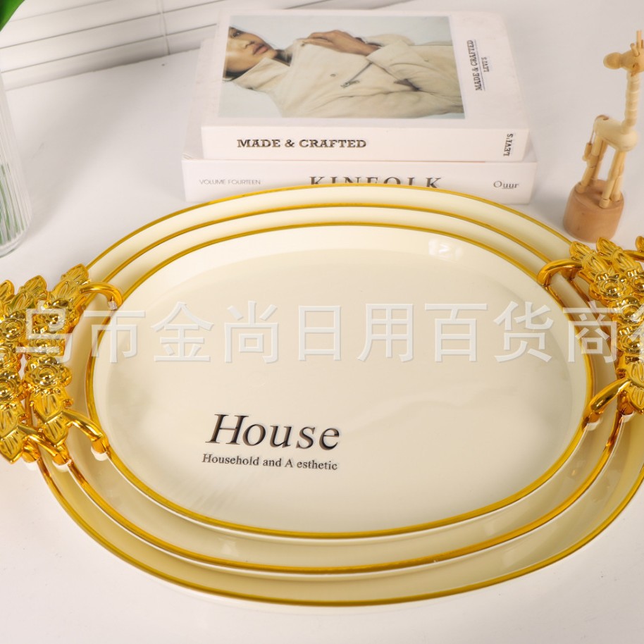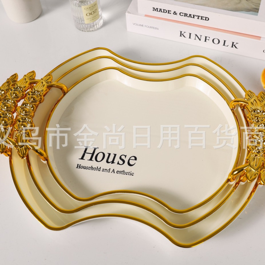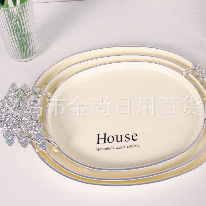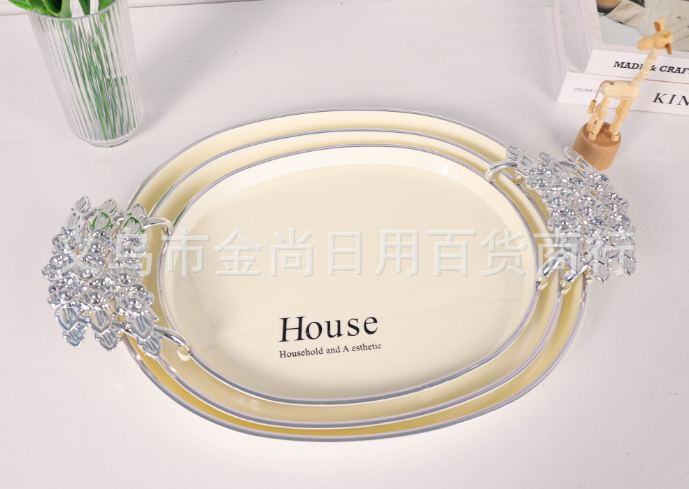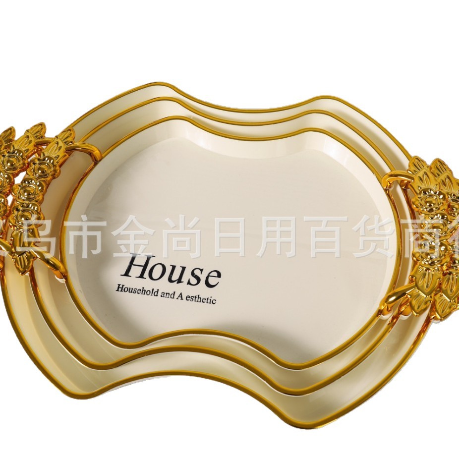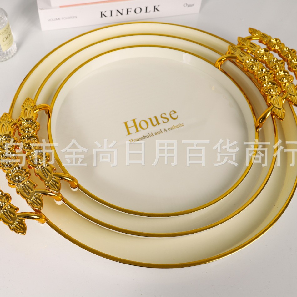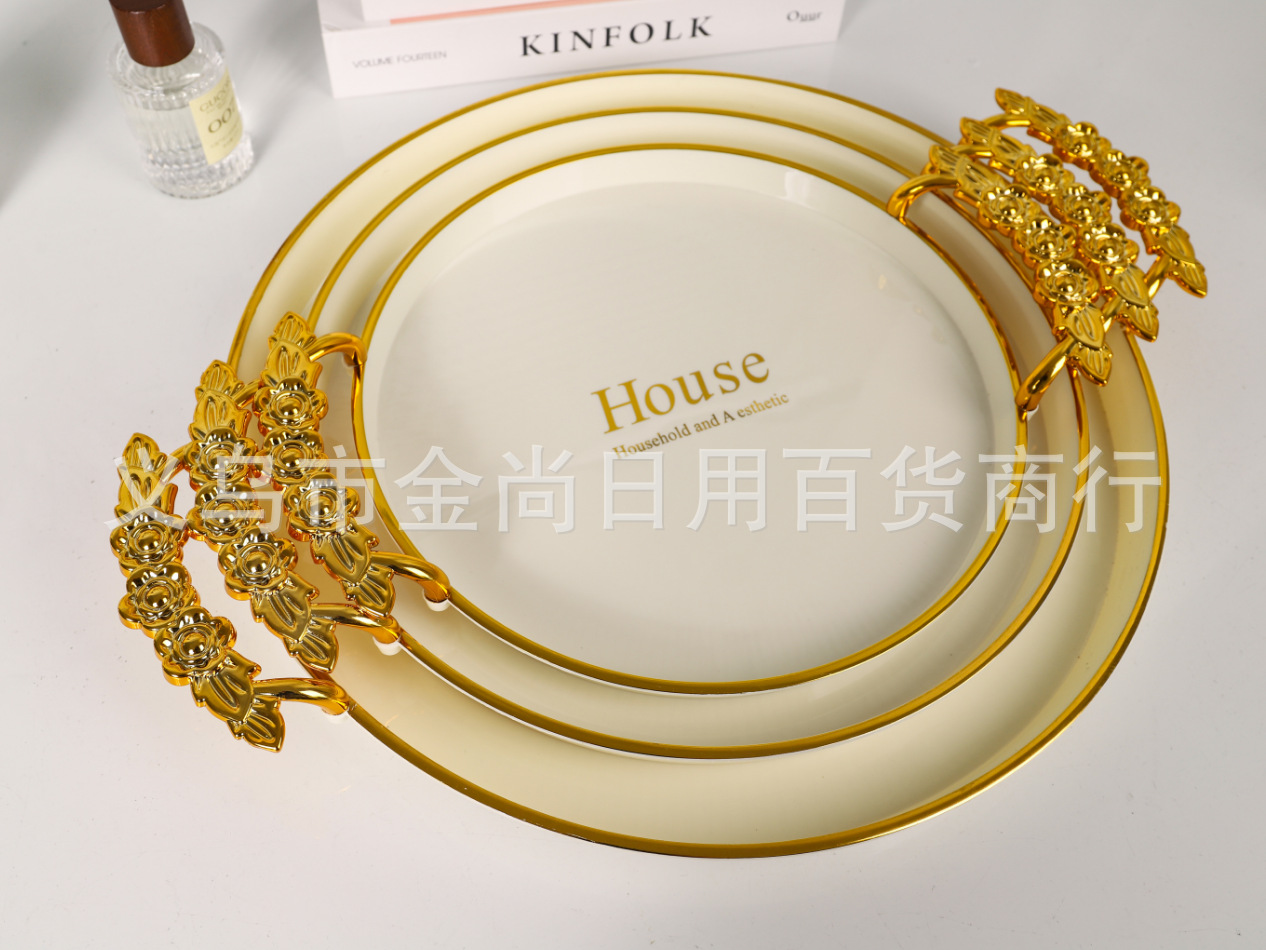 新款餐厅茶盘茶几杯子放茶杯水杯家用玫瑰手柄轻奢托盘白金
