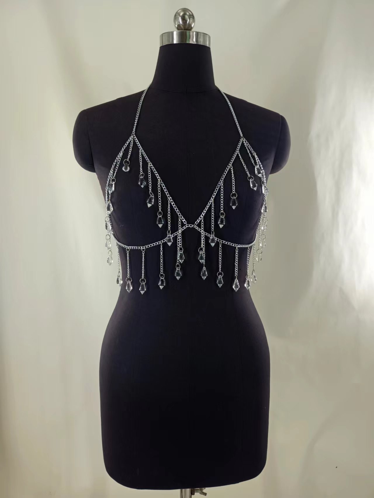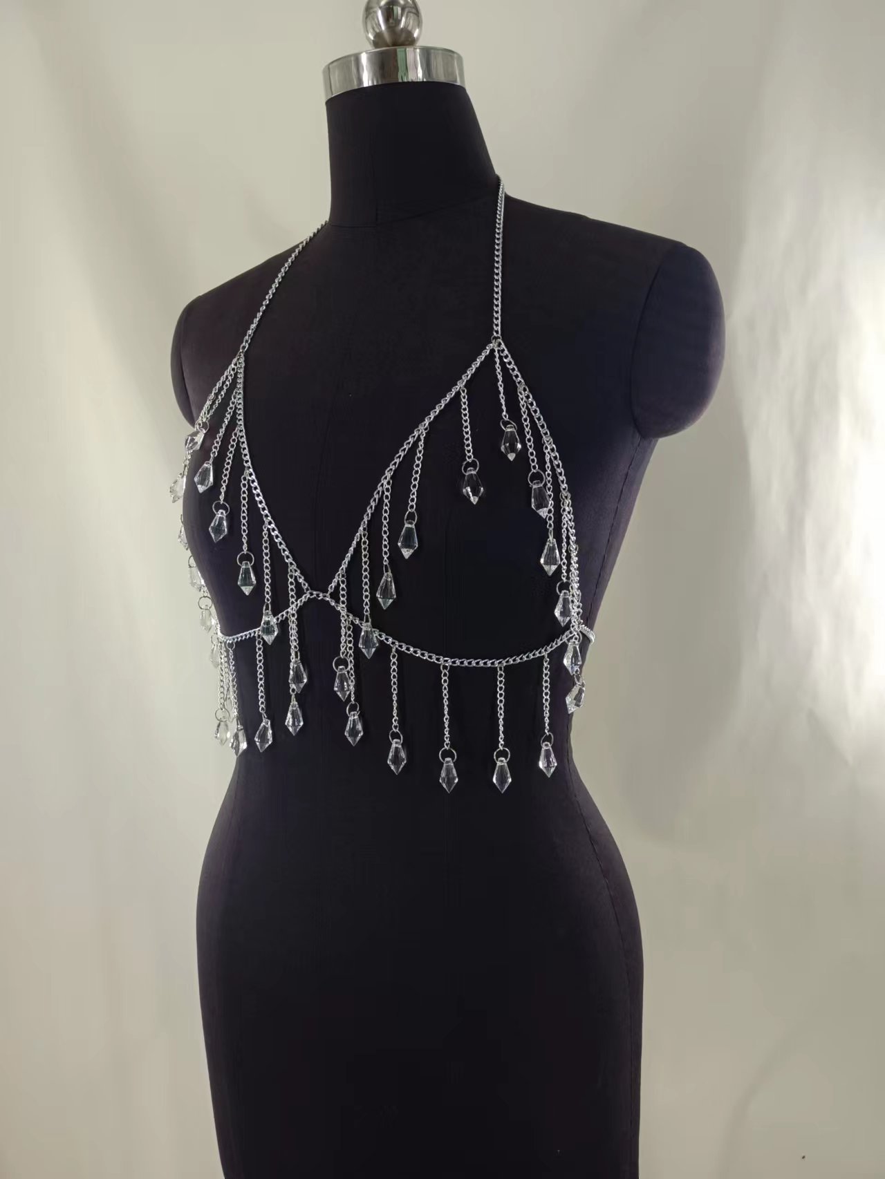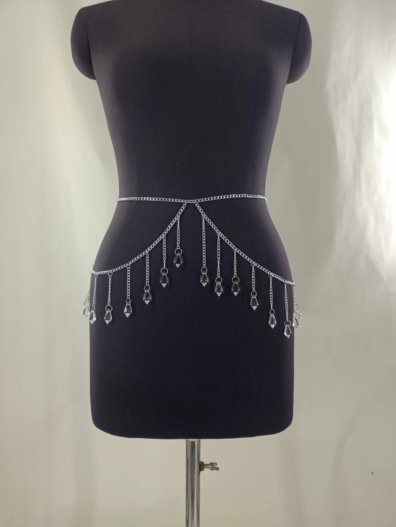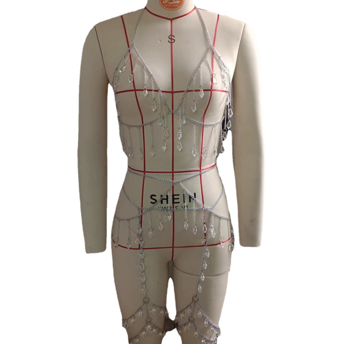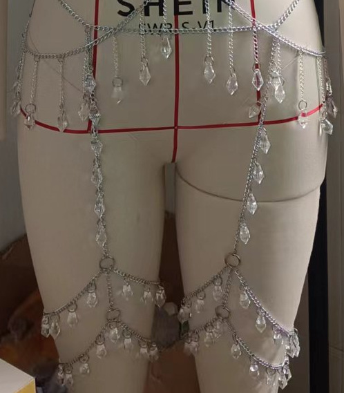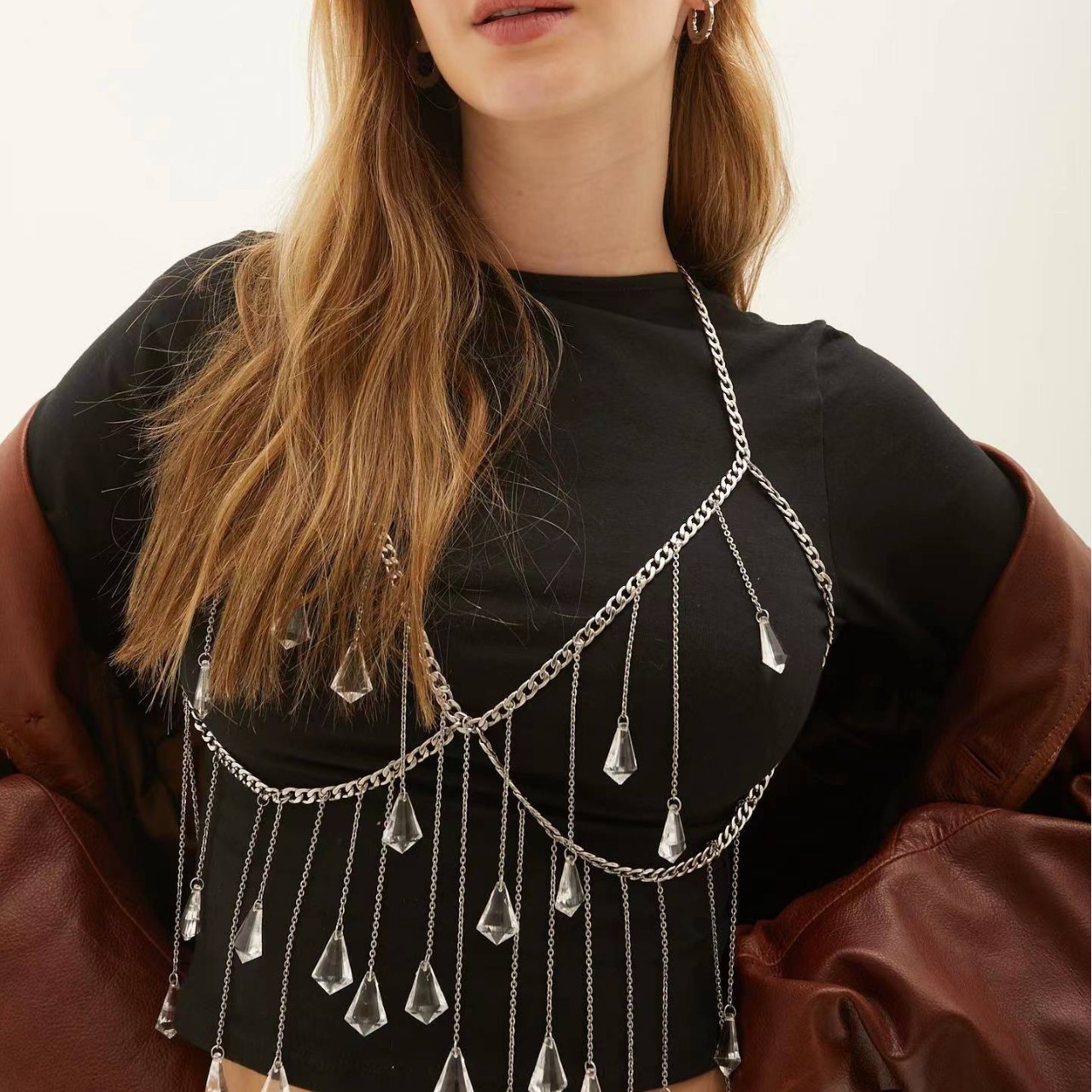 FB3475欧美body chain透明水晶宝石挂坠流苏链胸链腰链腿链身体链