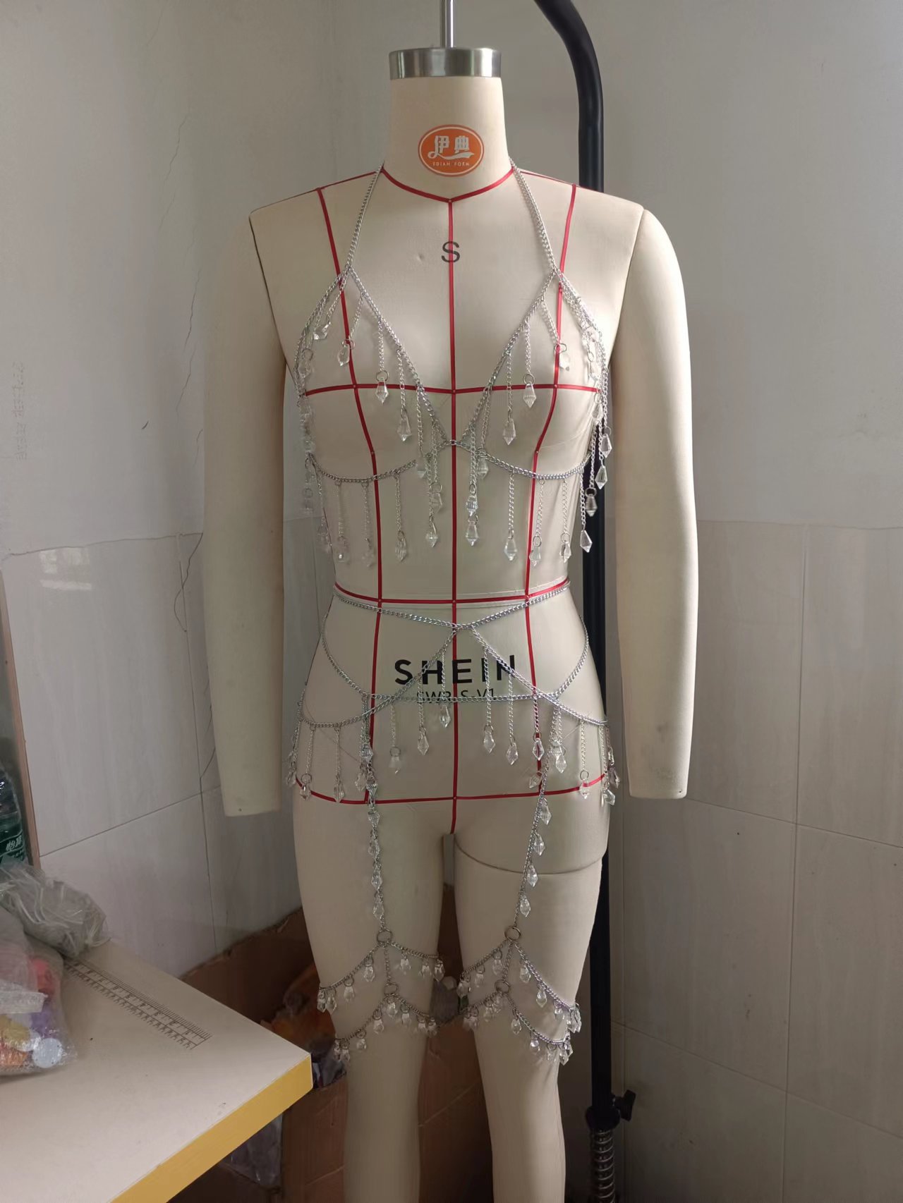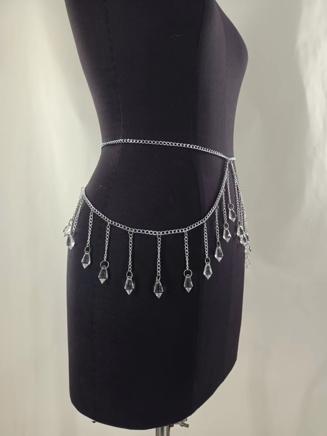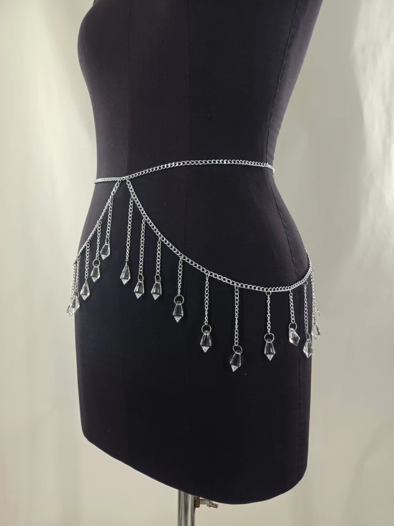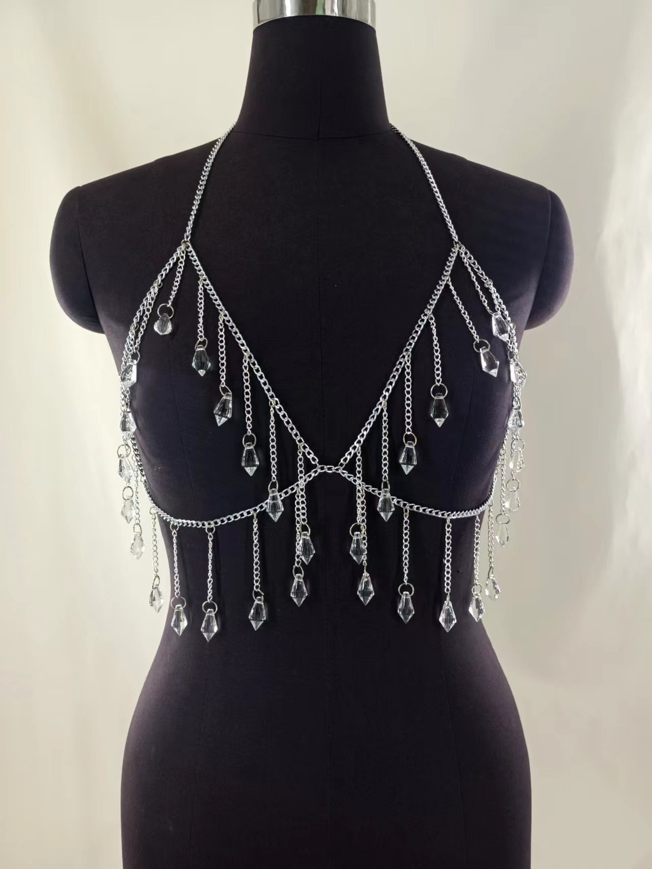FB3475欧美body chain透明水晶宝石挂坠流苏链胸链腰链腿链身体链