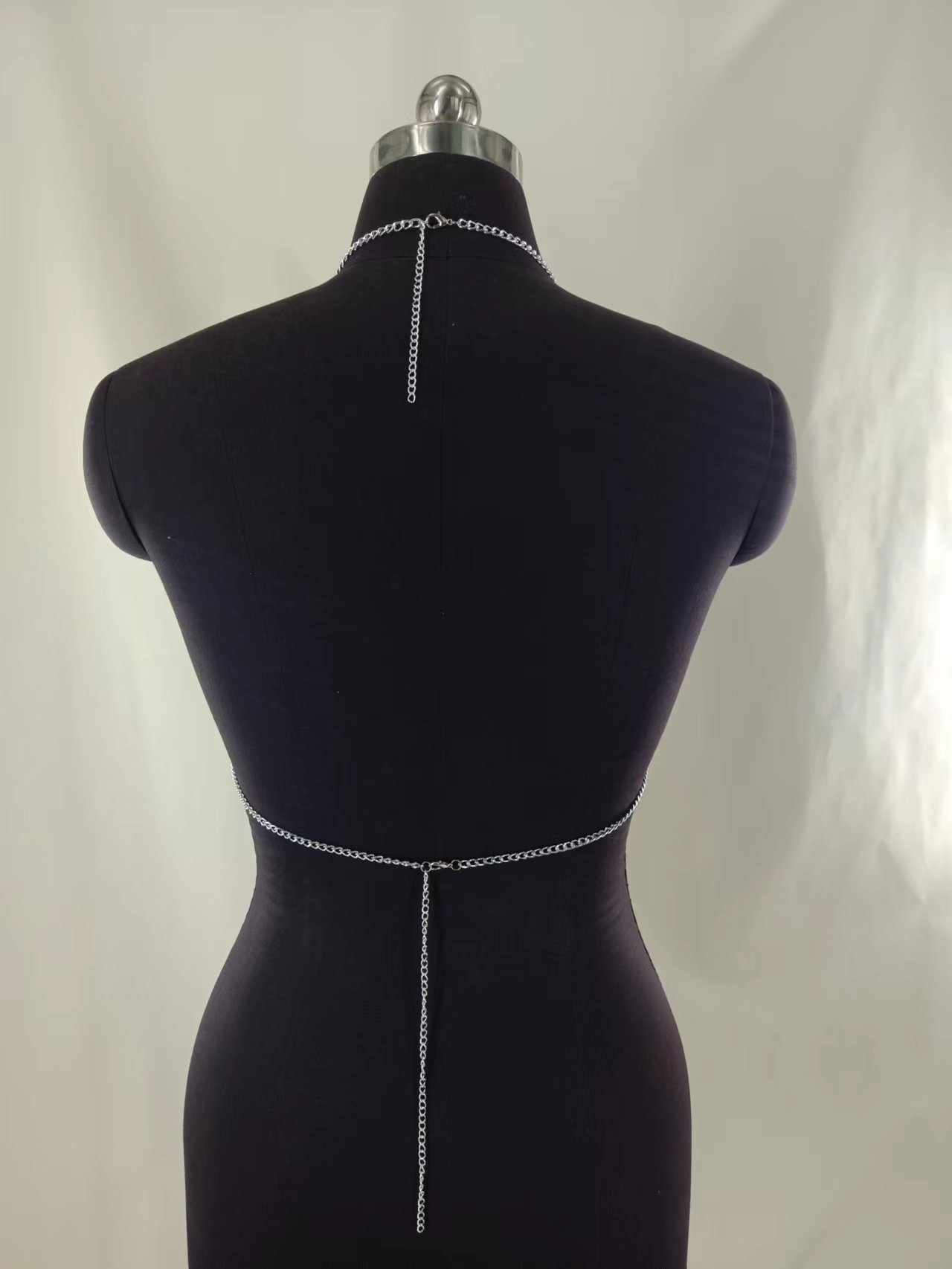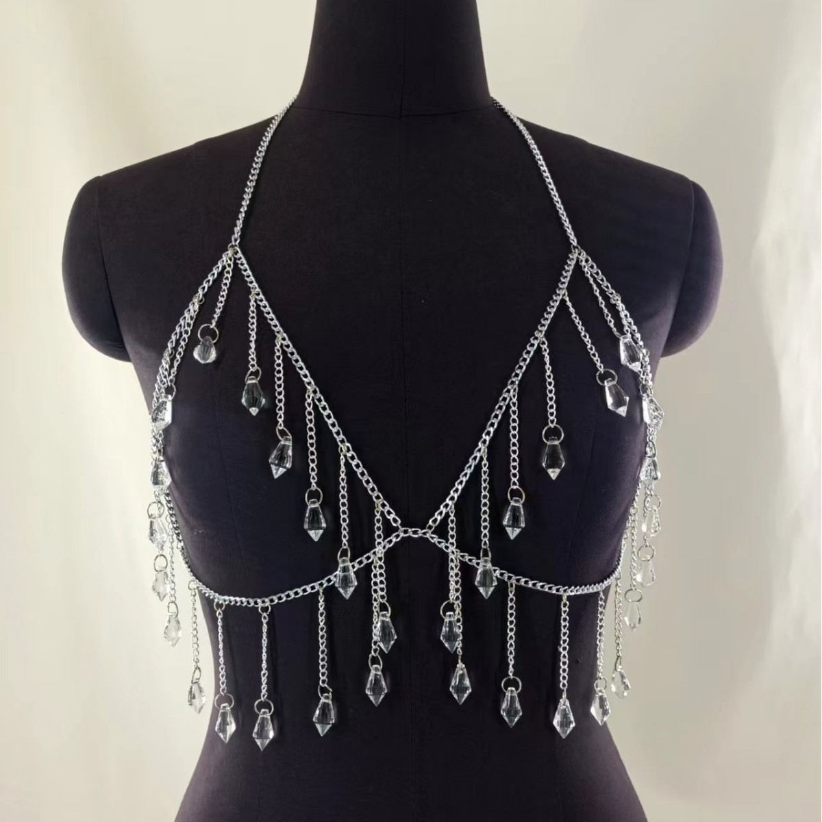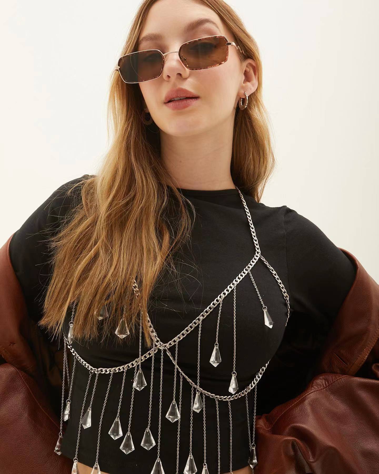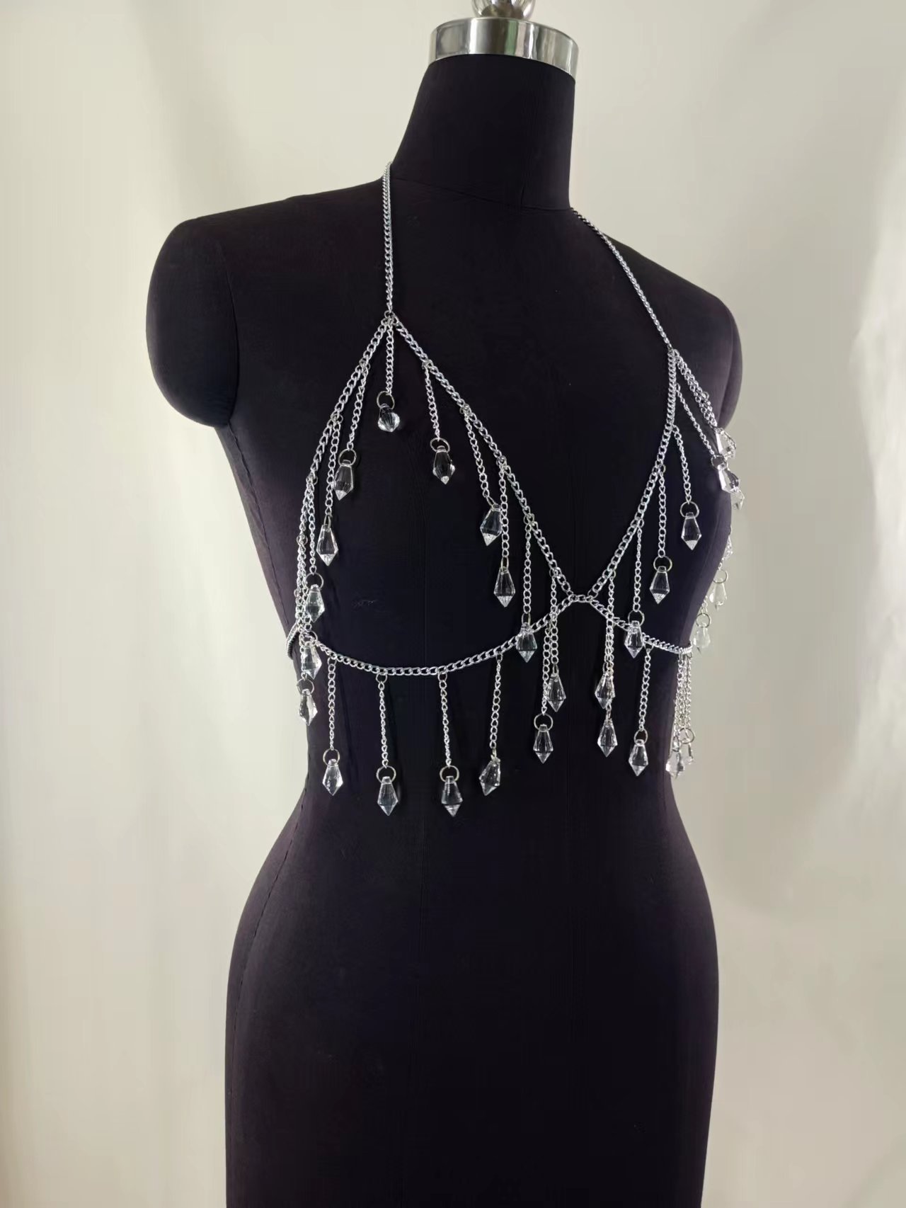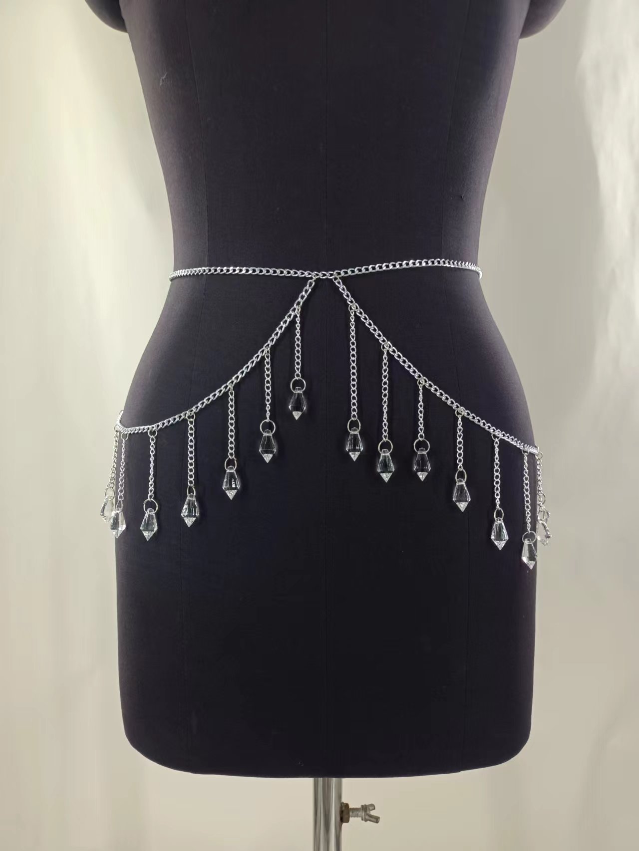 FB3475欧美body chain透明水晶宝石挂坠流苏链胸链腰链腿链身体链