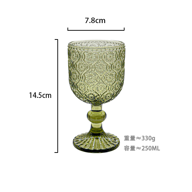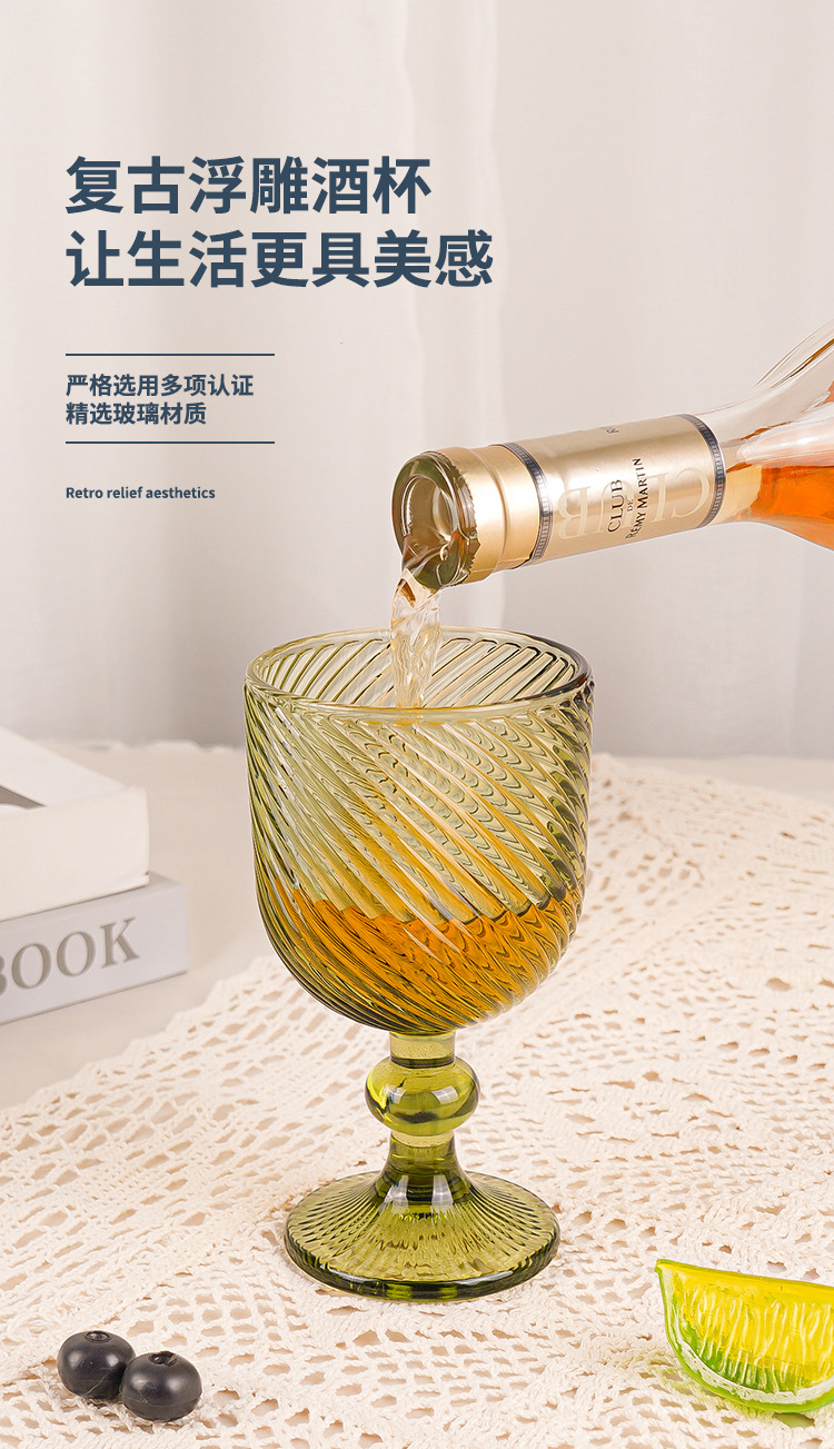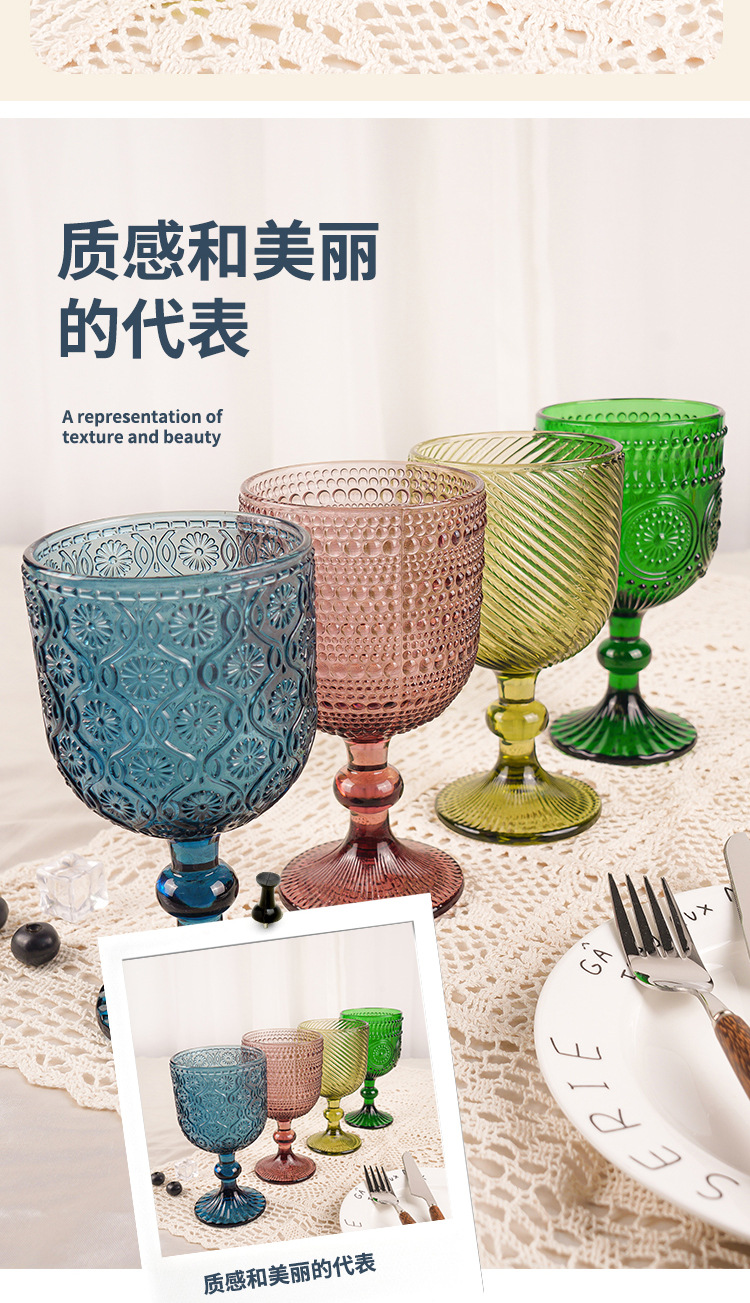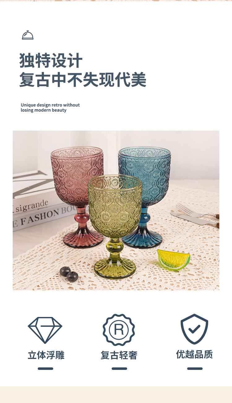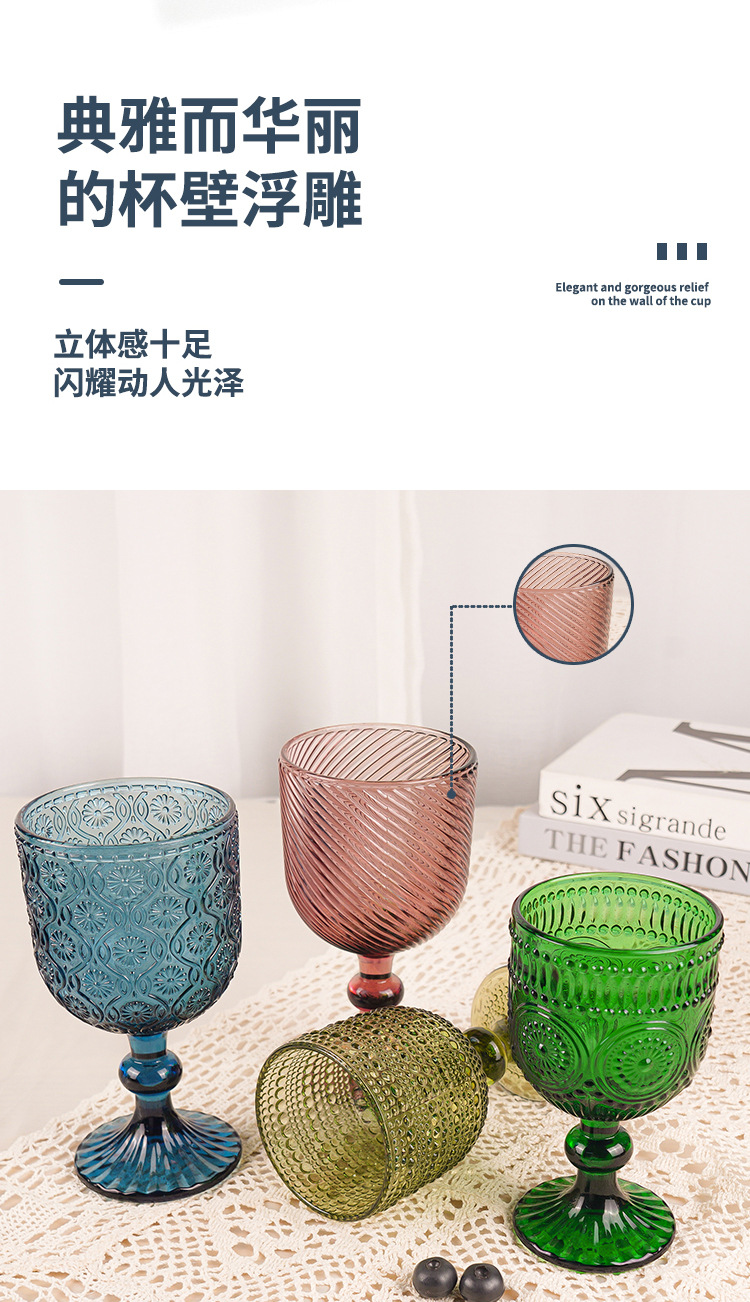 工厂批发欧式彩色红酒杯浮雕玻璃杯果汁杯婚礼宴会高脚杯葡萄酒杯