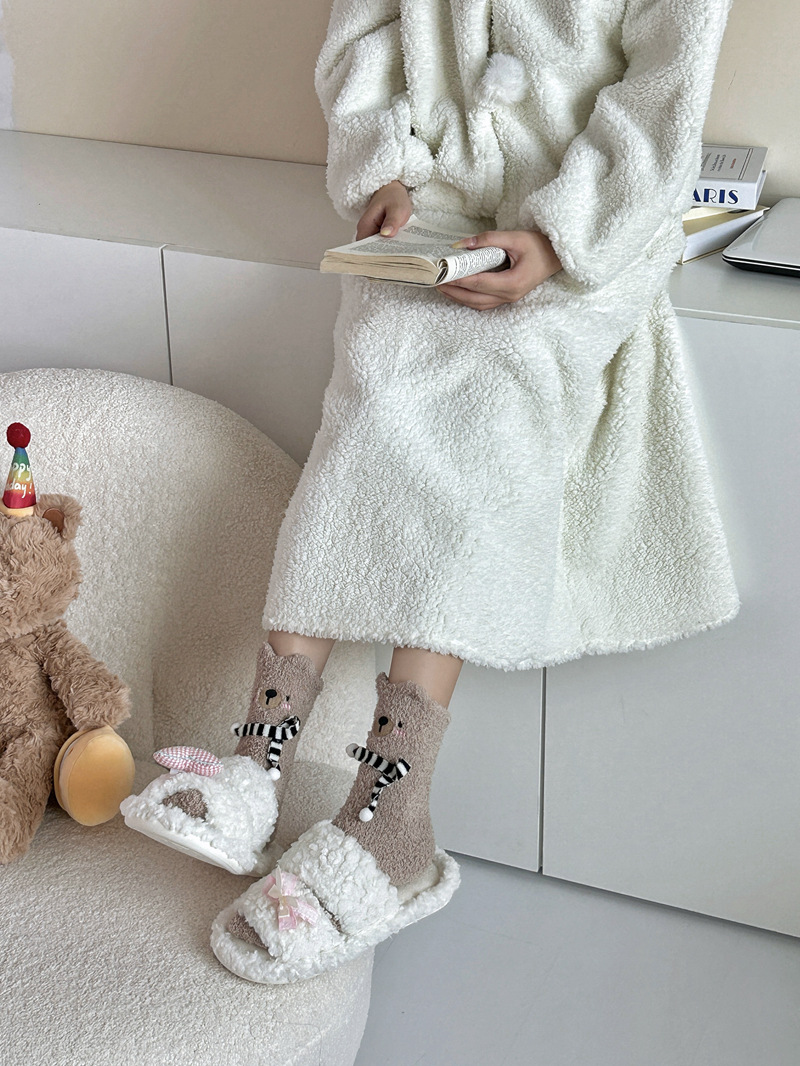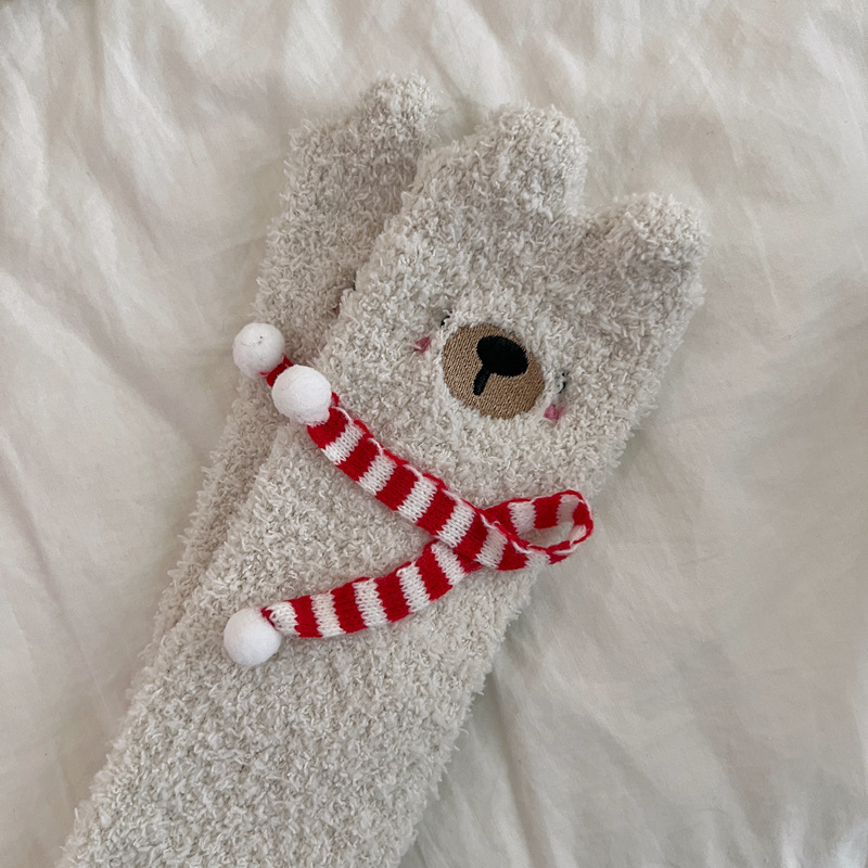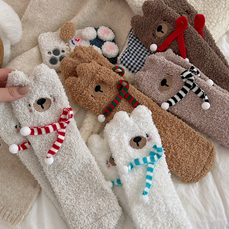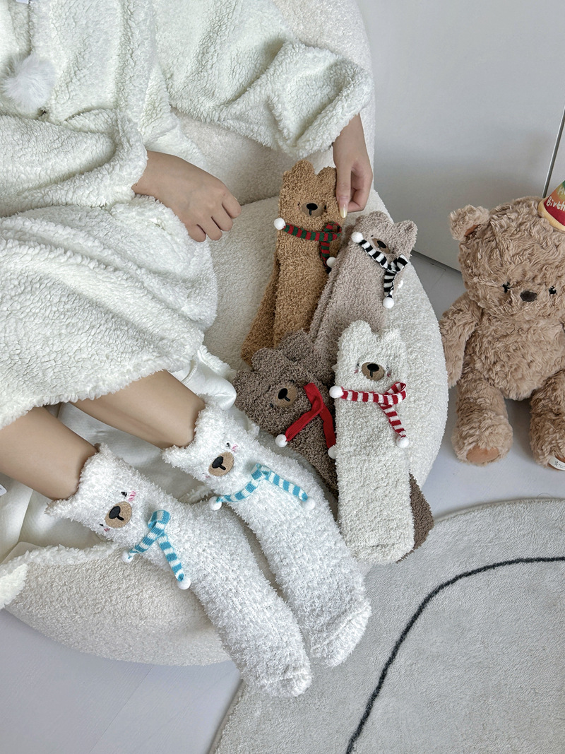 围巾小熊珊瑚绒袜子冬天加厚加绒居家地板袜毛茸茸可爱保暖学生袜