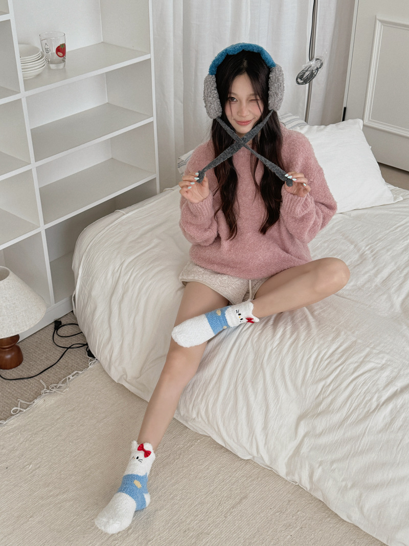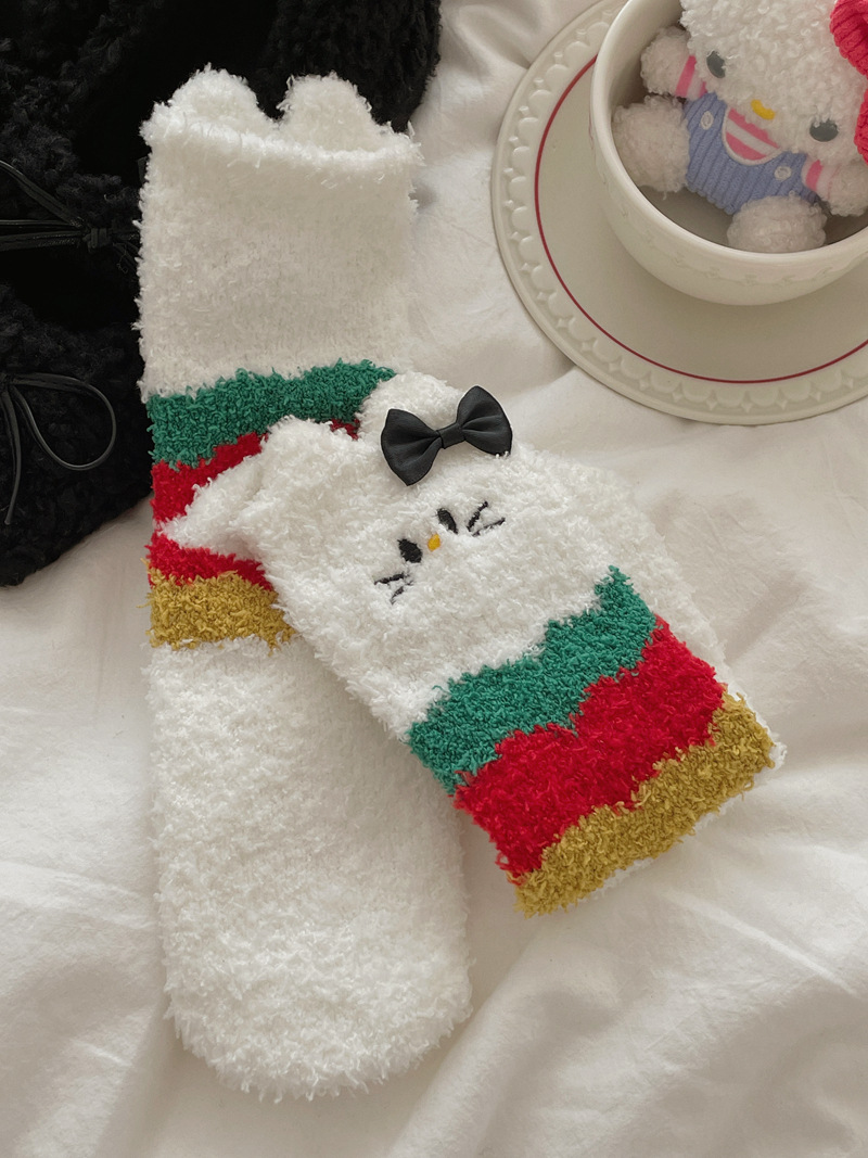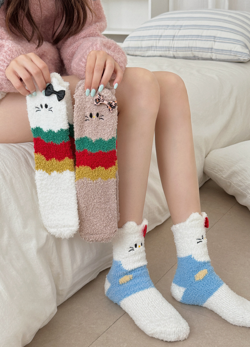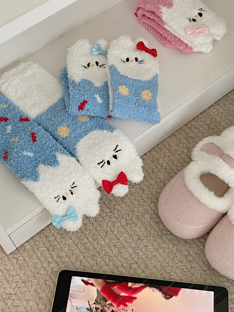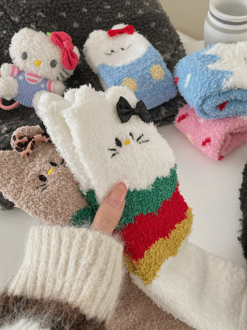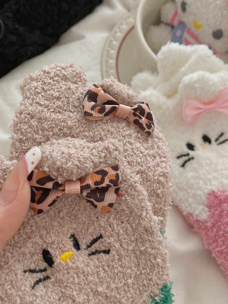 可爱猫咪珊瑚绒袜子女加绒加厚不掉毛家居地板袜滴冬天保暖睡眠袜