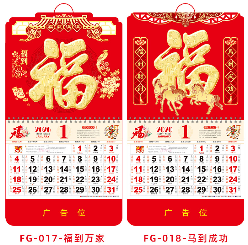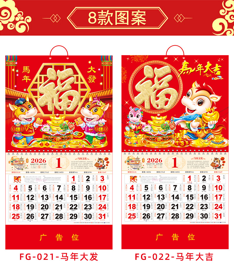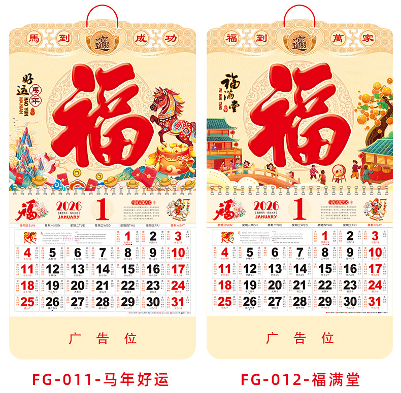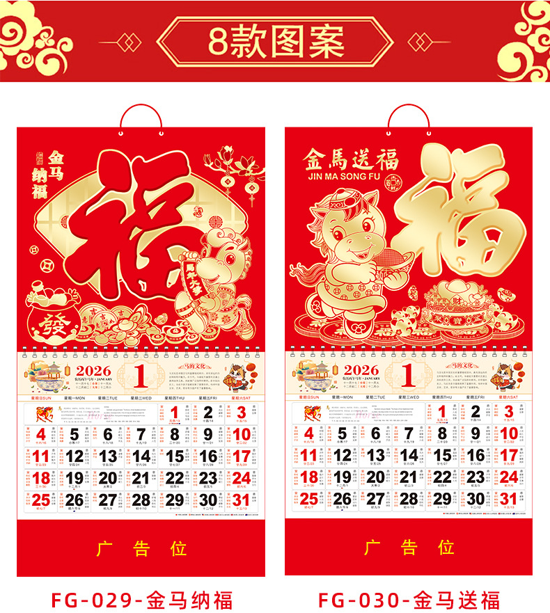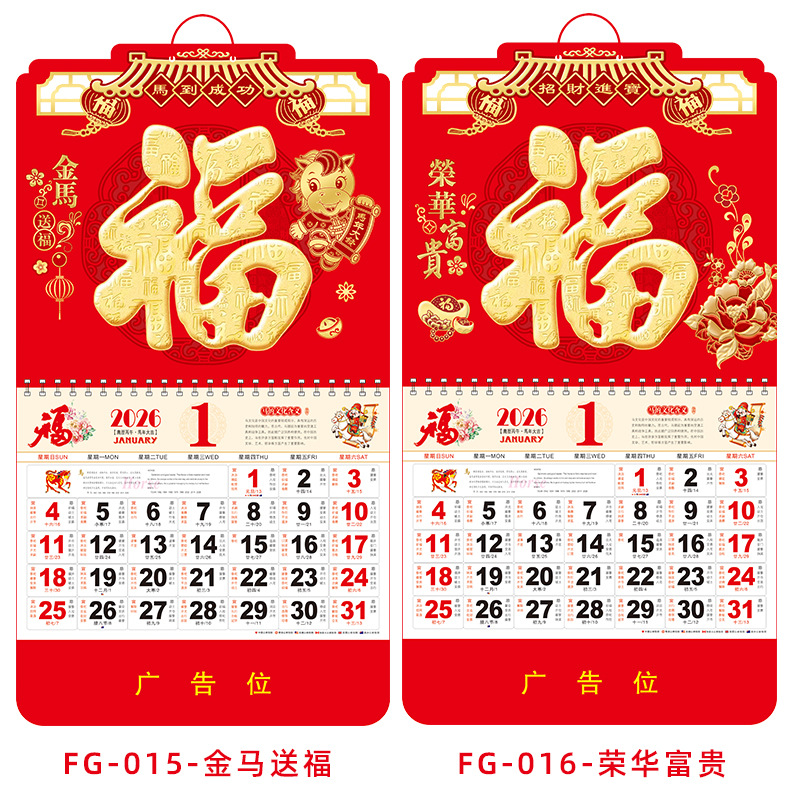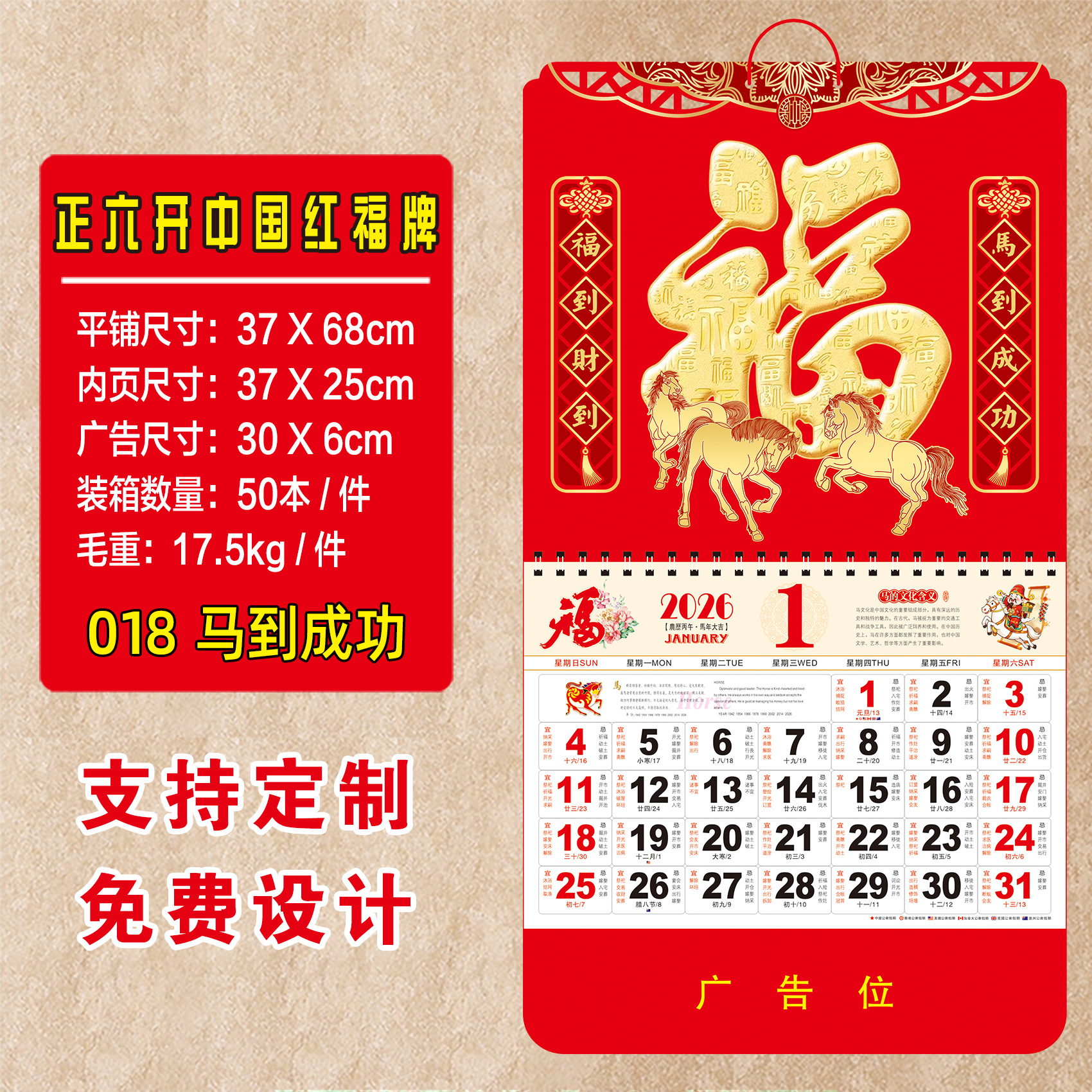 2026马年挂历厂家批发正六福字吊牌日历月历福牌送礼定制可印LOGO