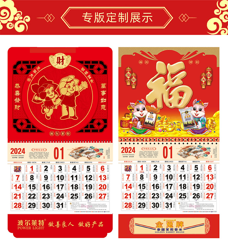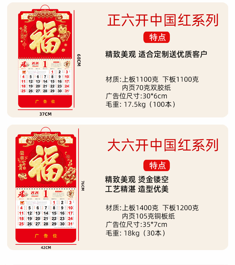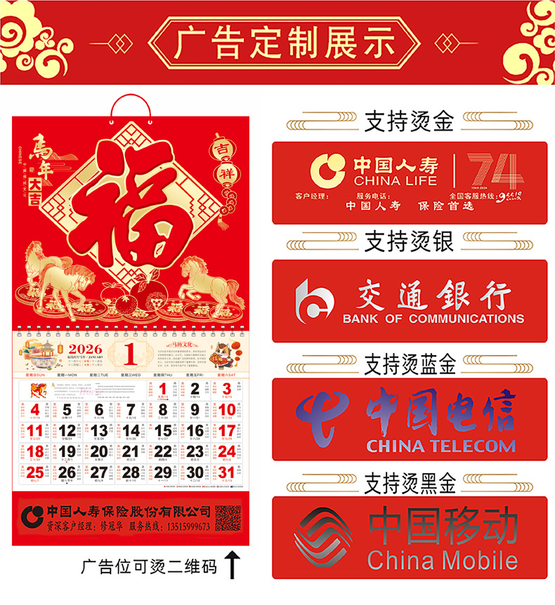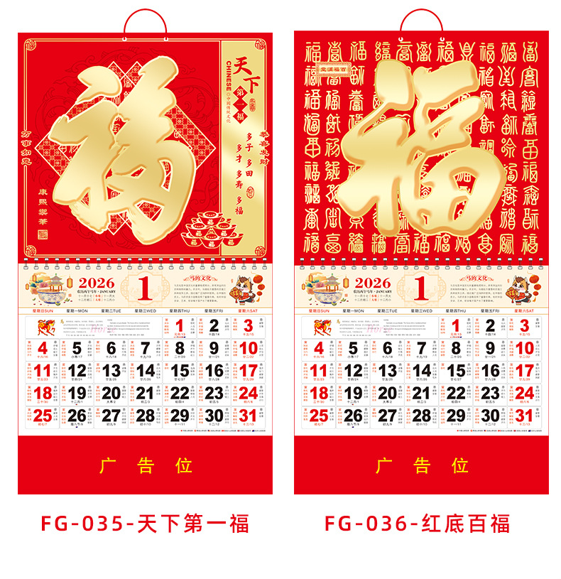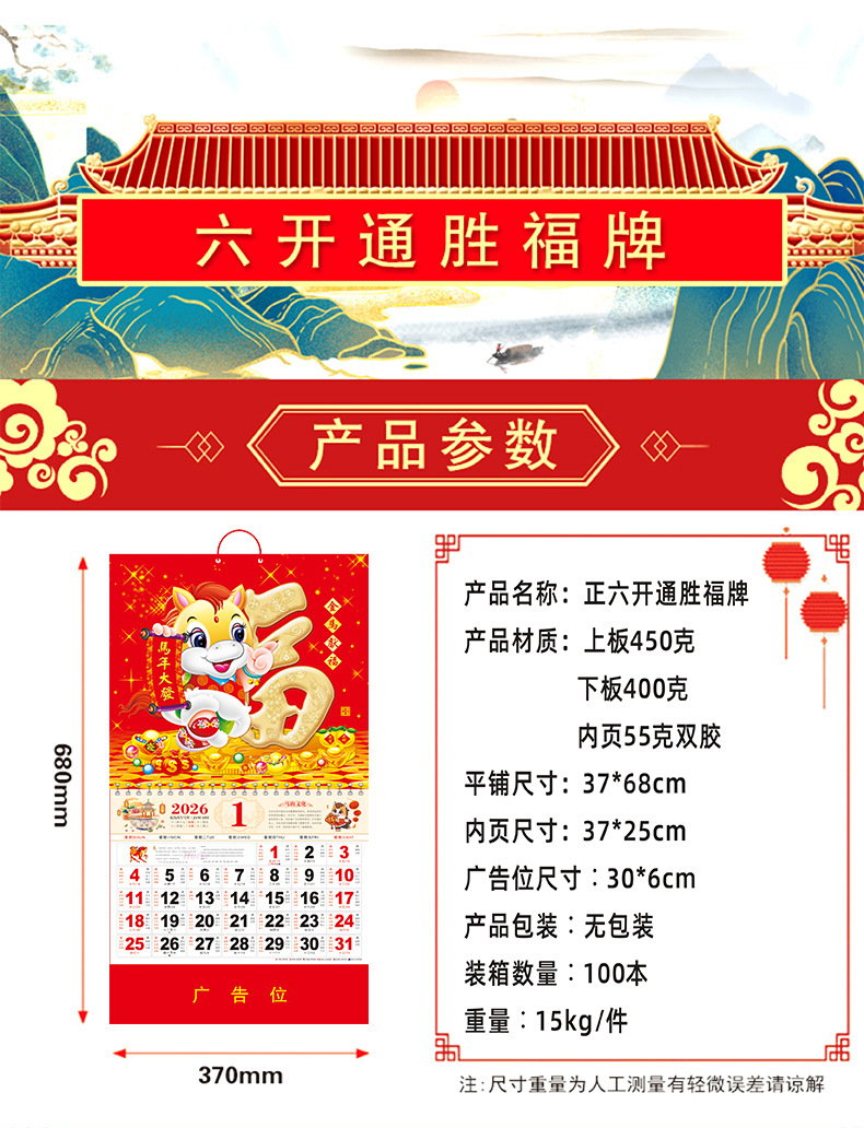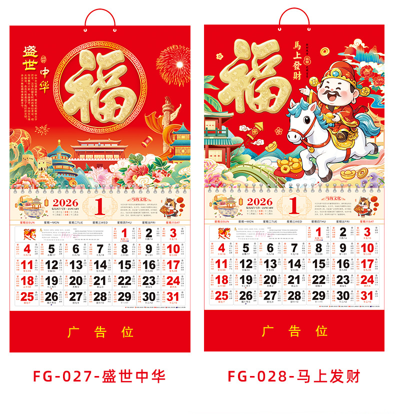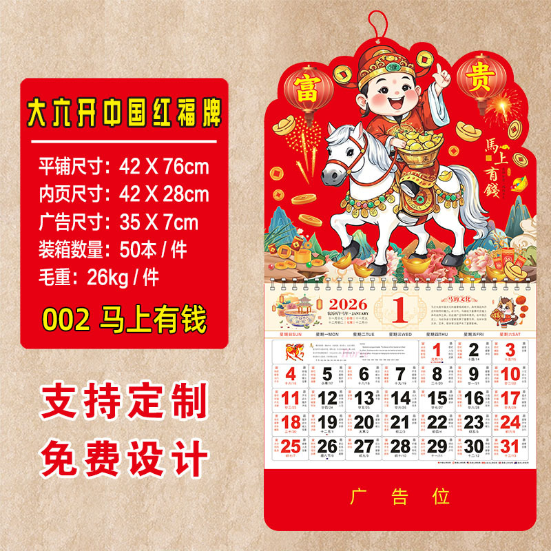 2026马年挂历厂家批发正六福字吊牌日历月历福牌送礼定制可印LOGO