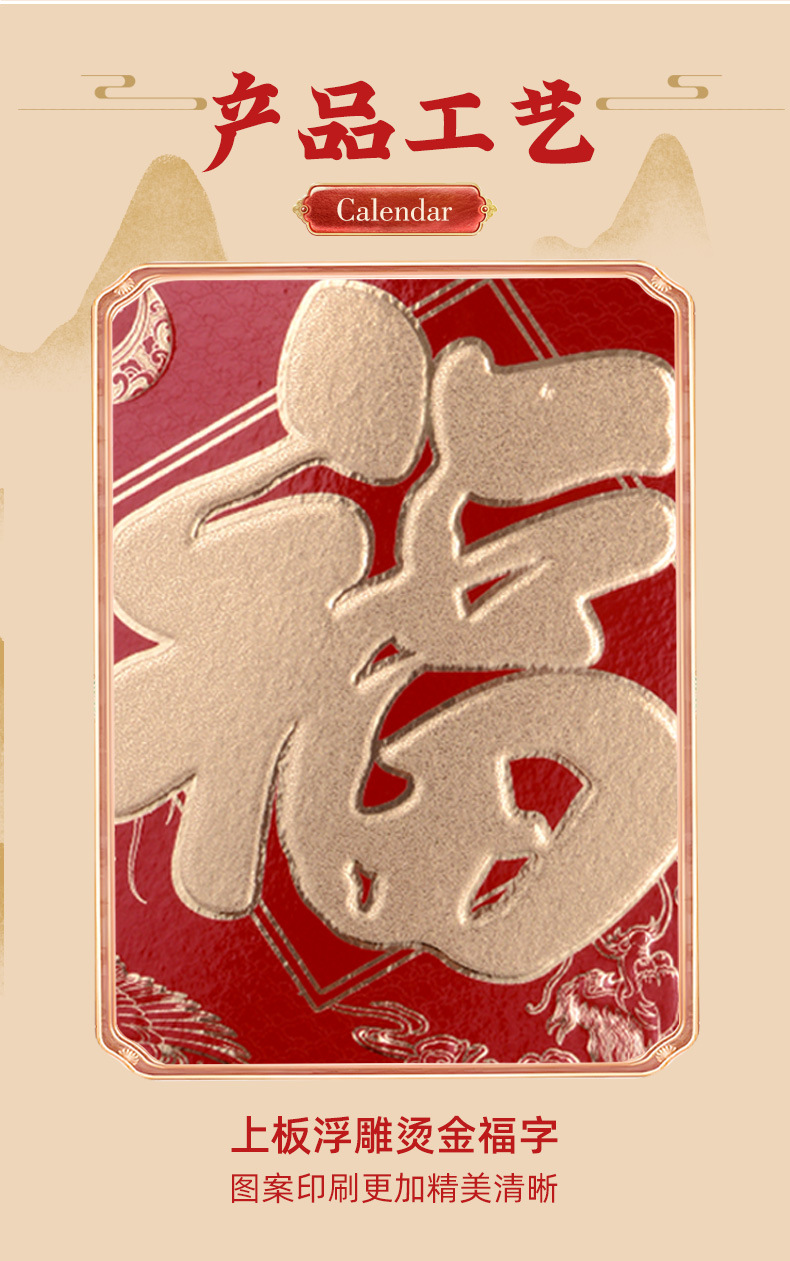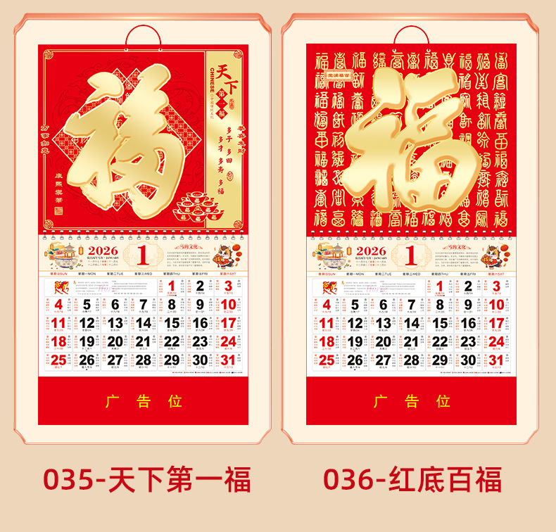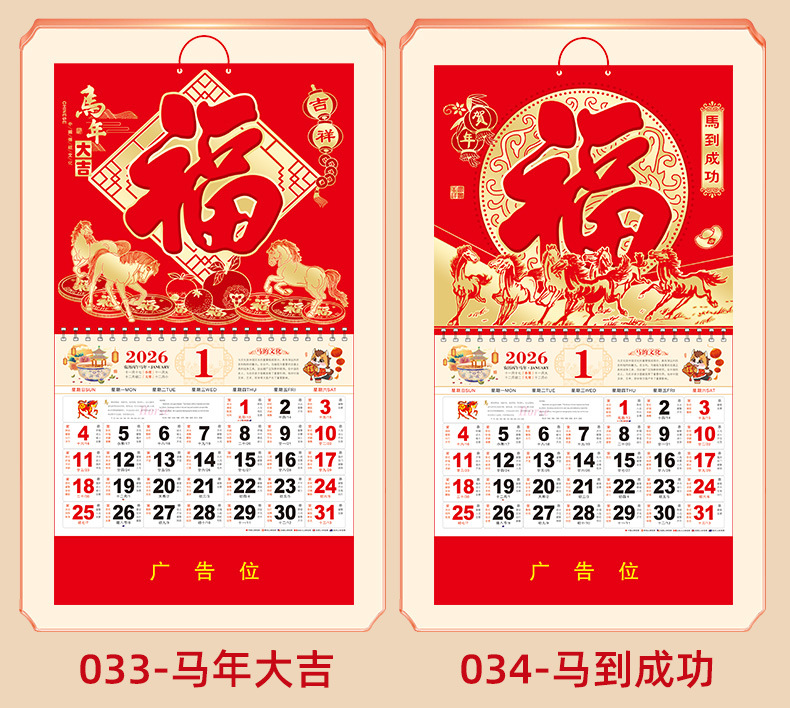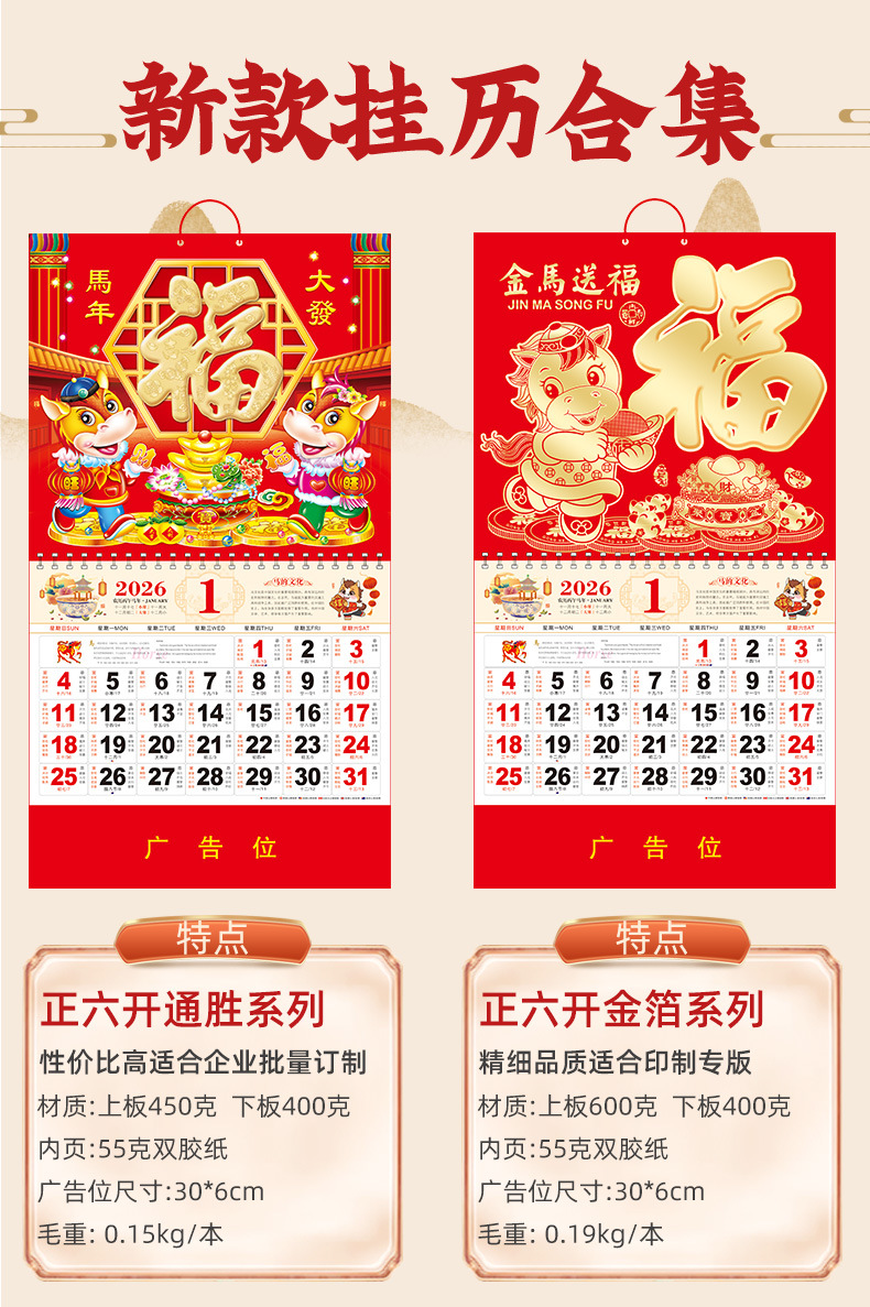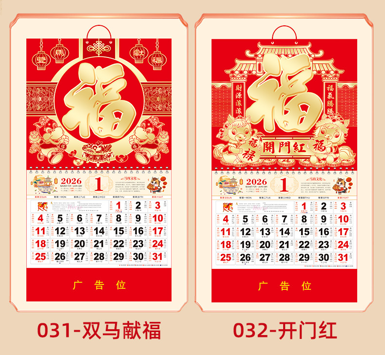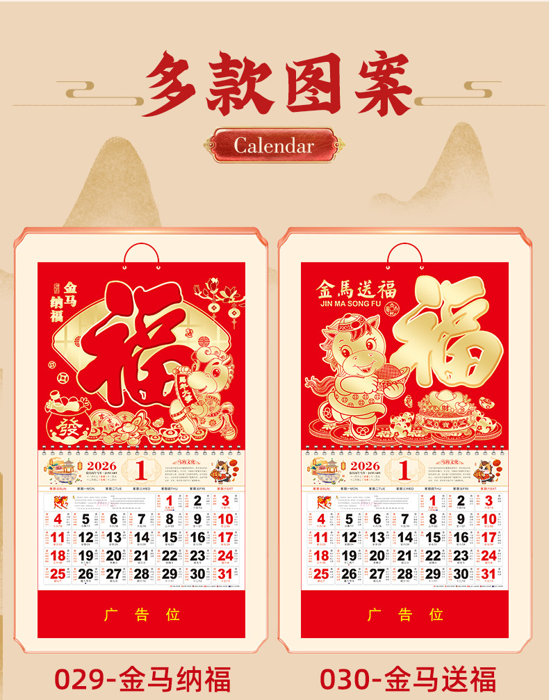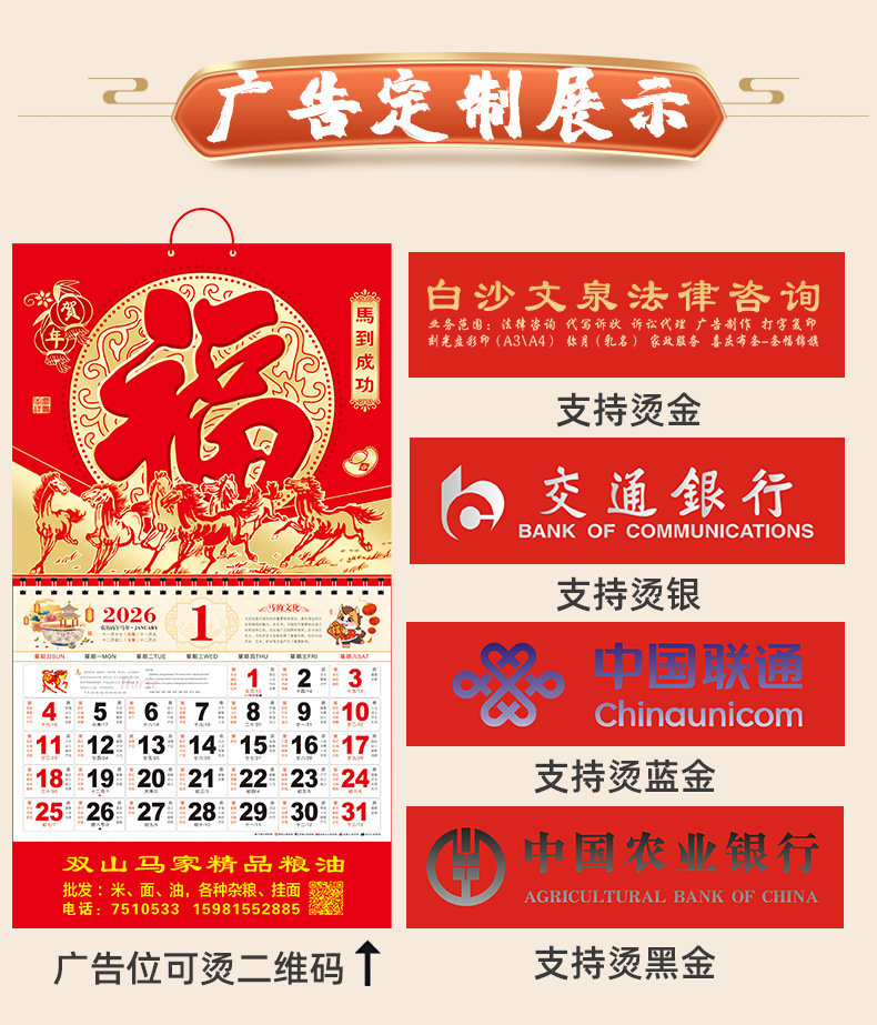 2026马年挂历定制整年新款福字日历来图定做新年跨境高档月历批发