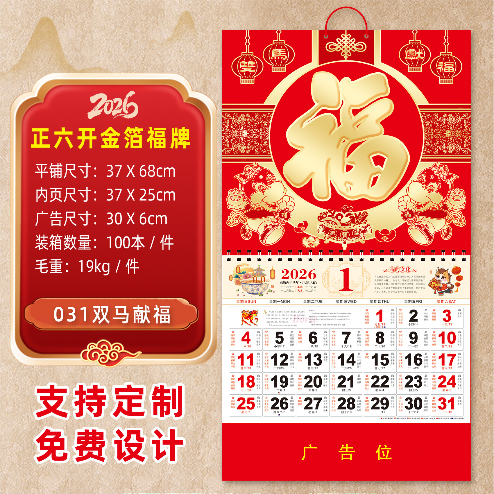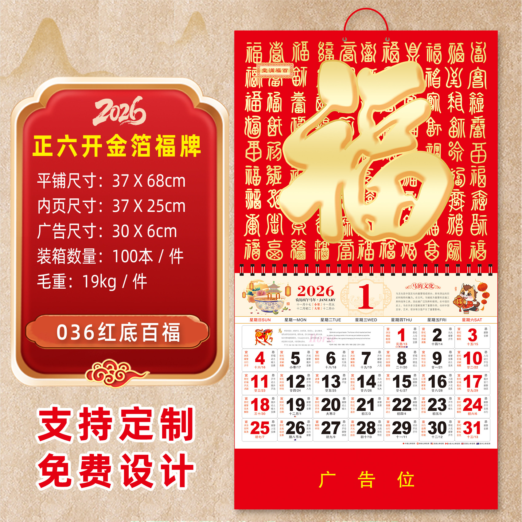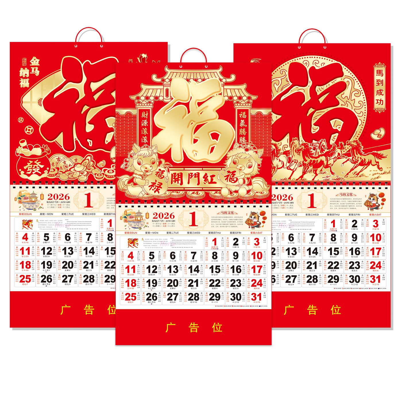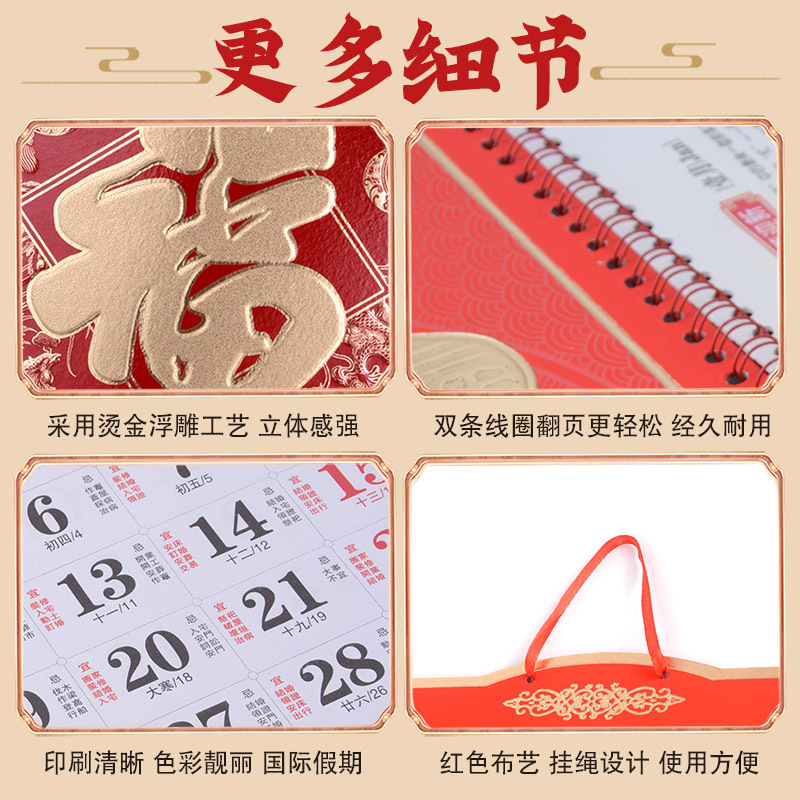 2026马年挂历定制整年新款福字日历来图定做新年跨境高档月历批发
