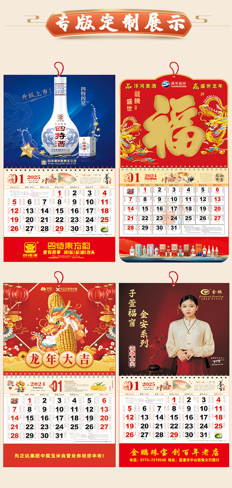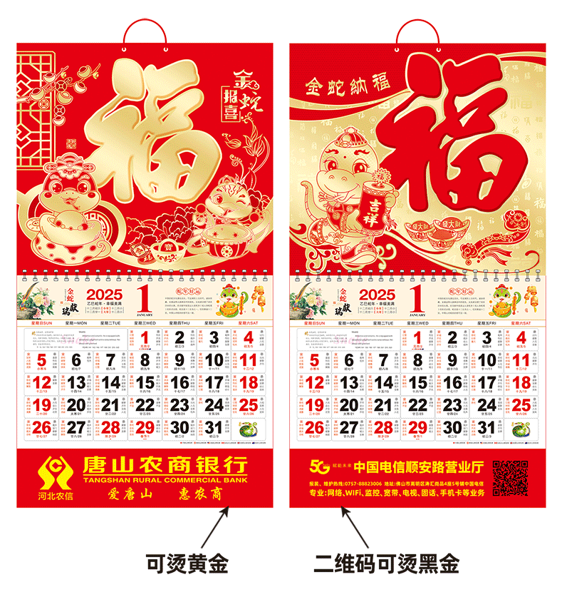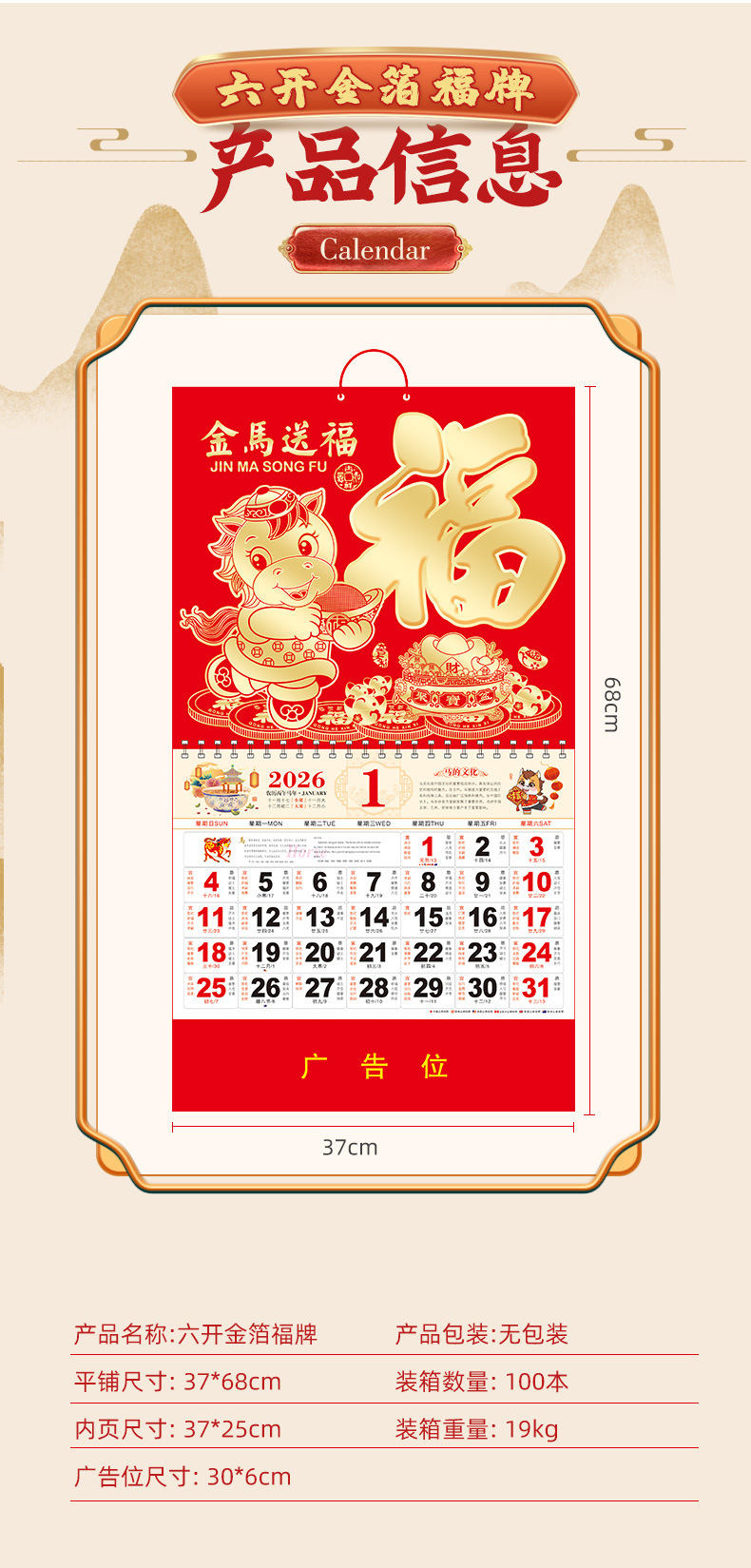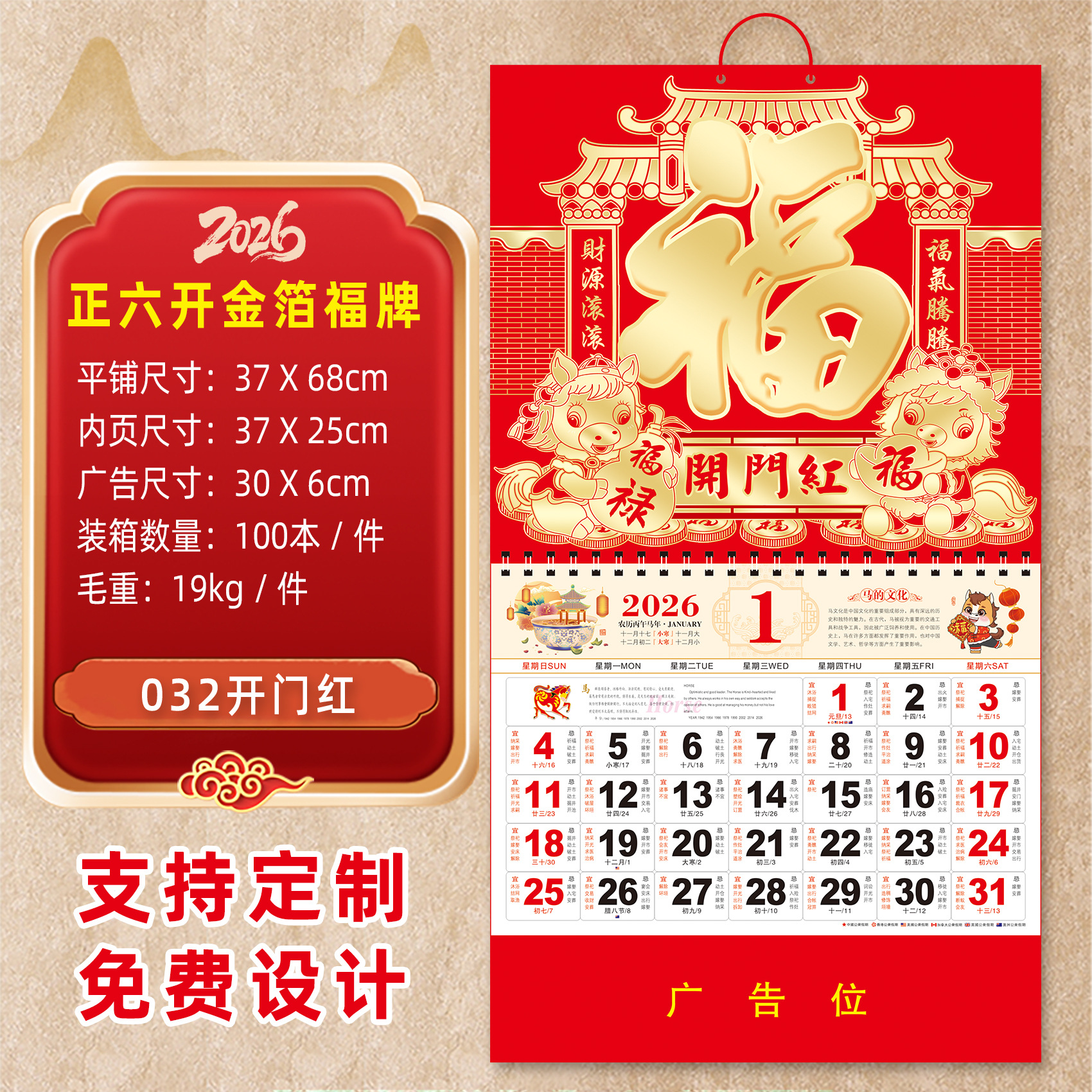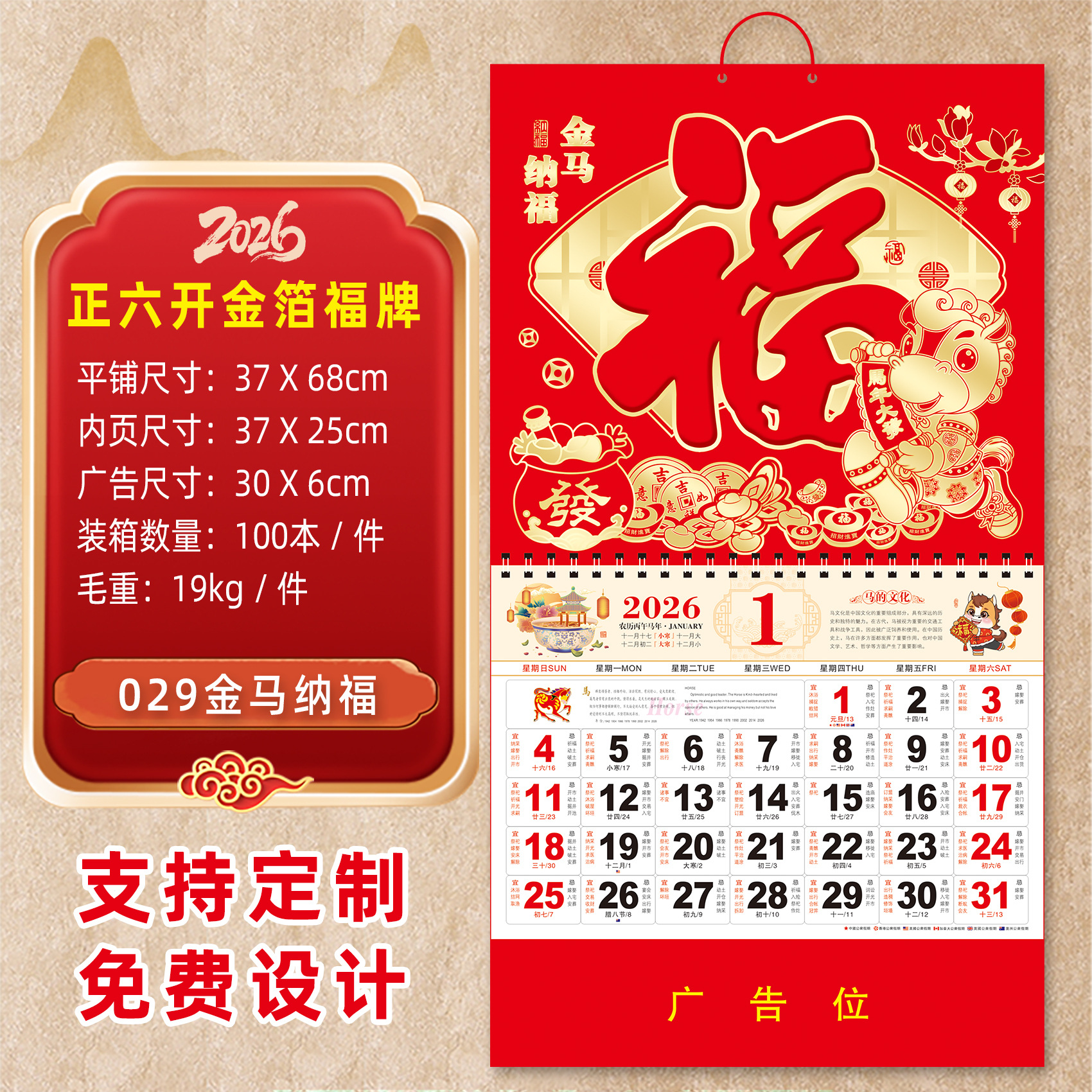 2026马年挂历定制整年新款福字日历来图定做新年跨境高档月历批发