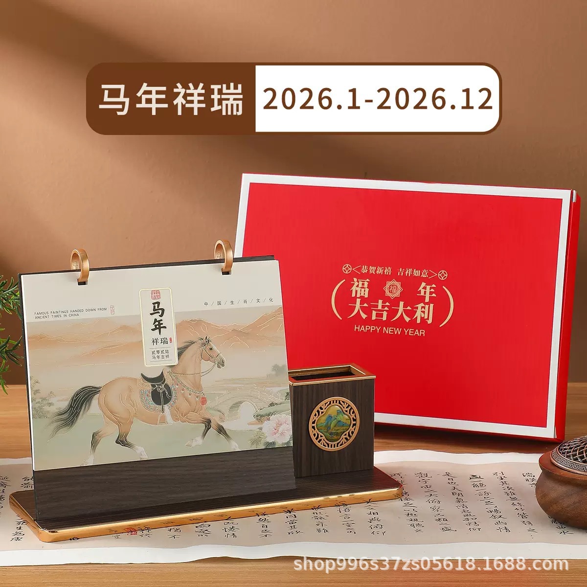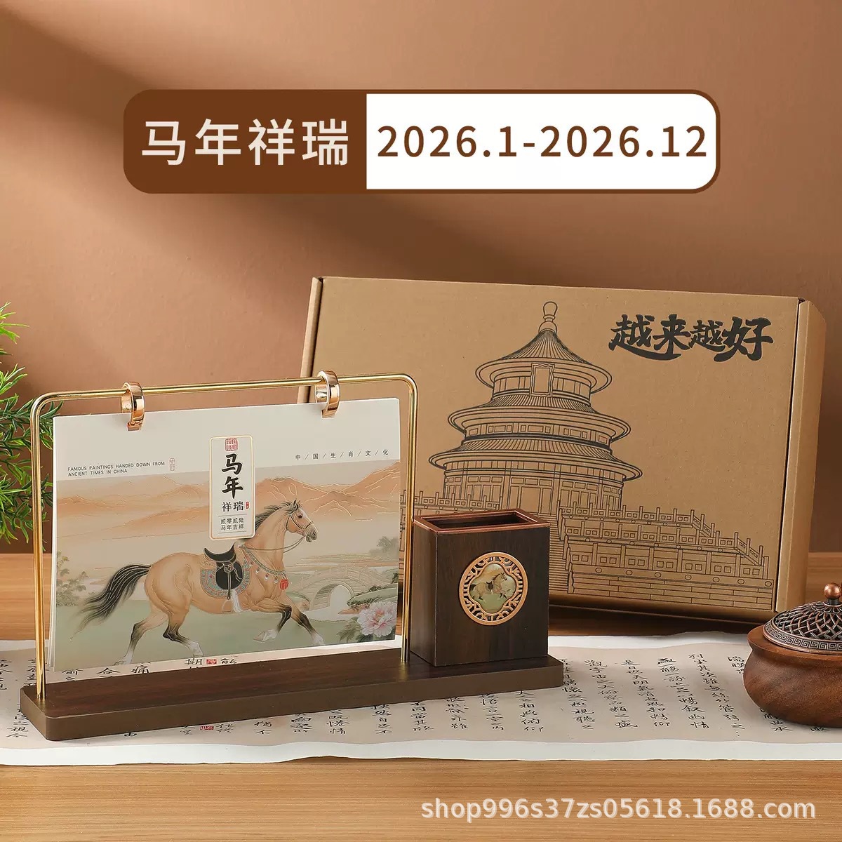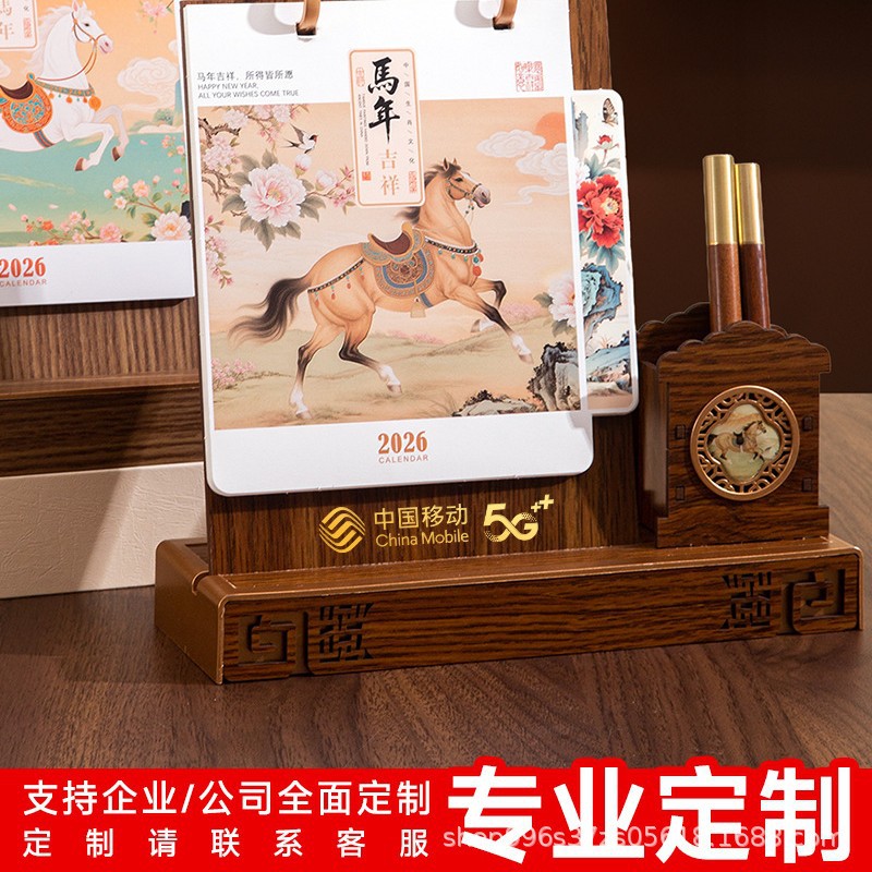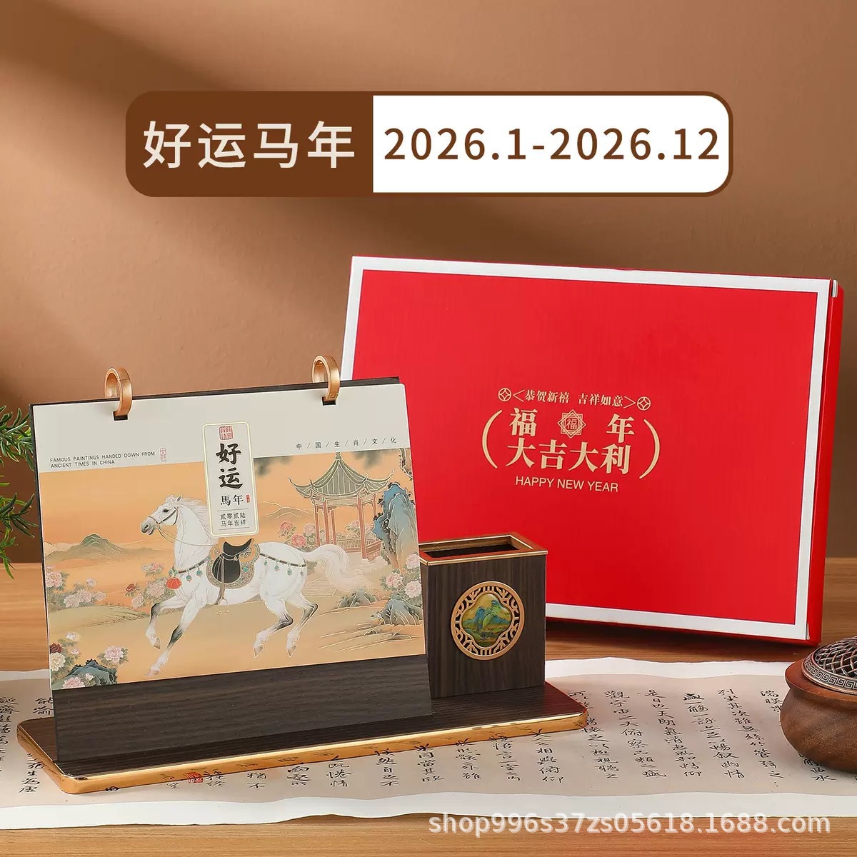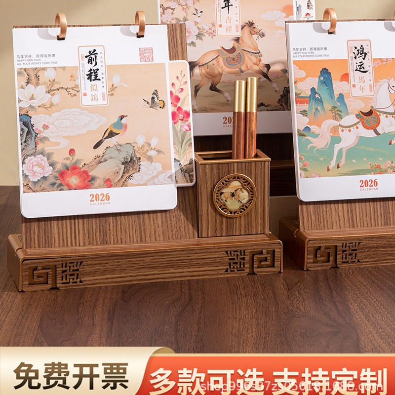 2026年新款台历木质创意马年笔筒中国风打卡办公月历企业印logo