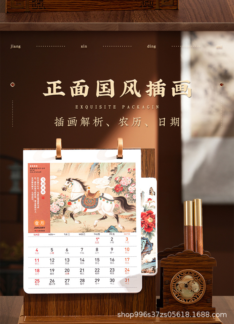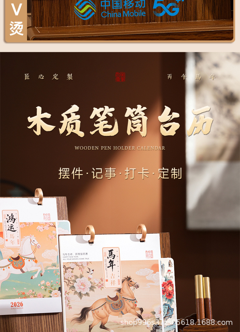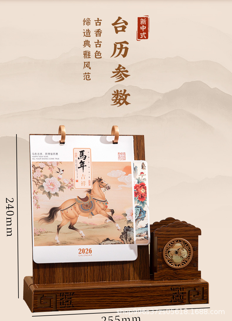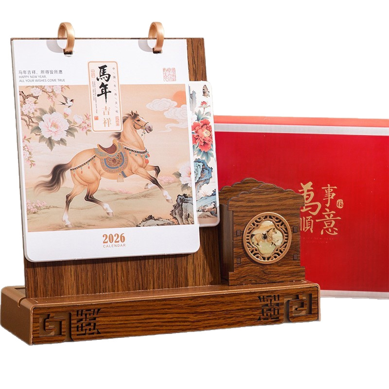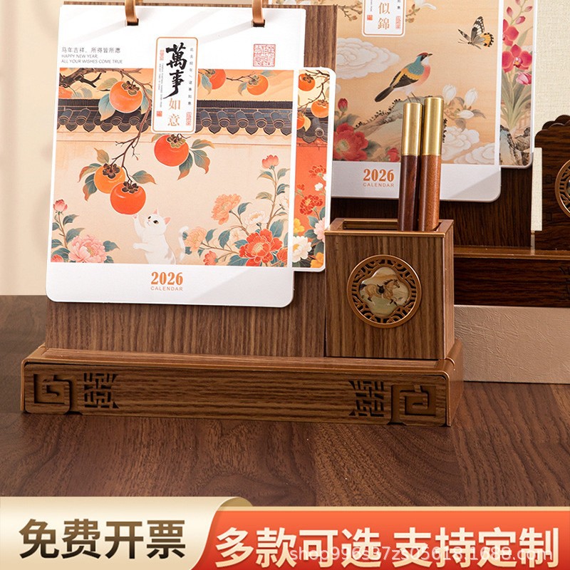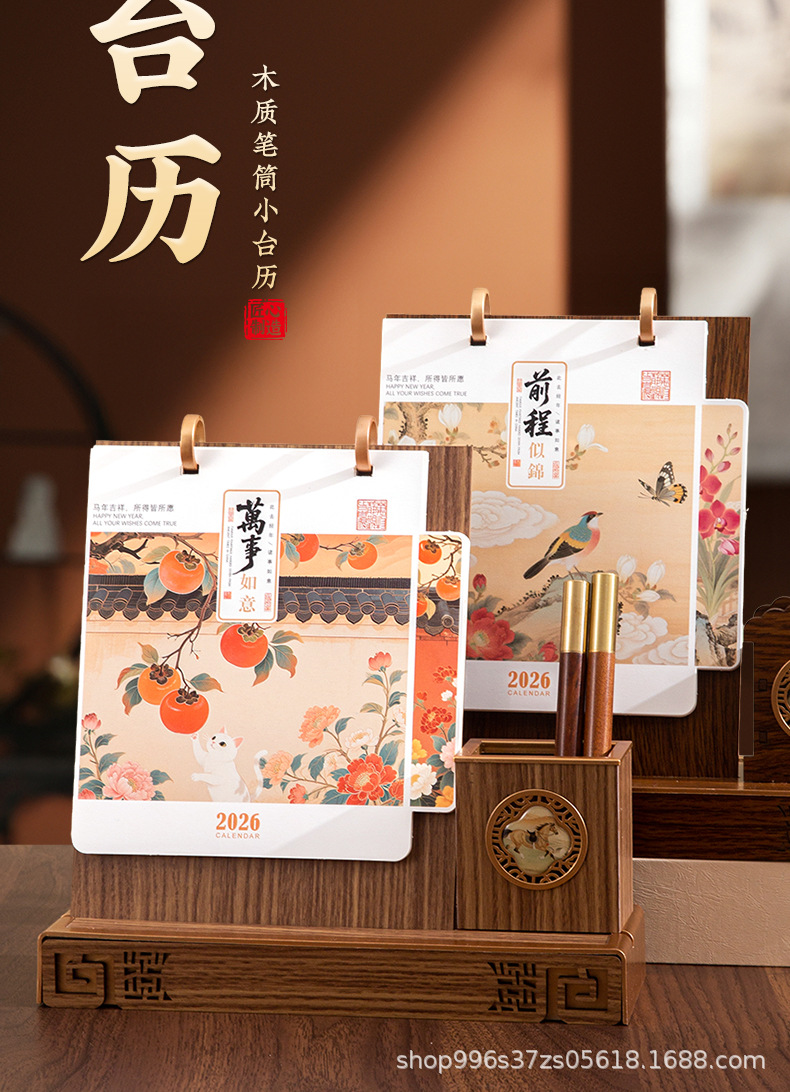 2026年新款台历木质创意马年笔筒中国风打卡办公月历企业印logo