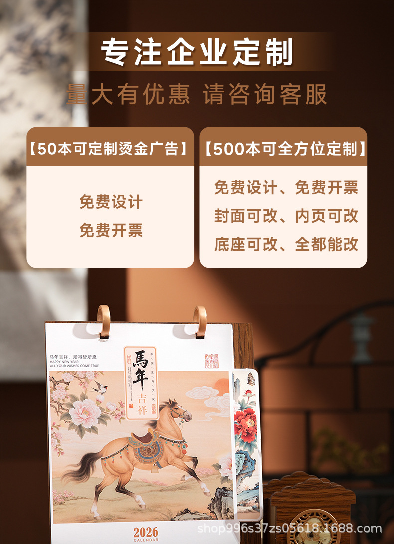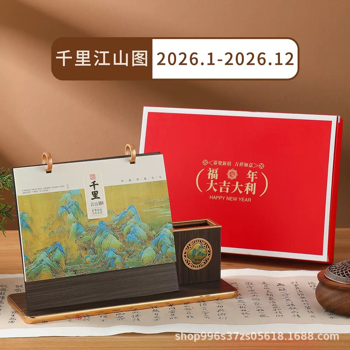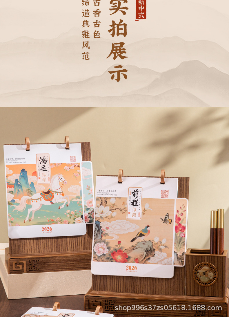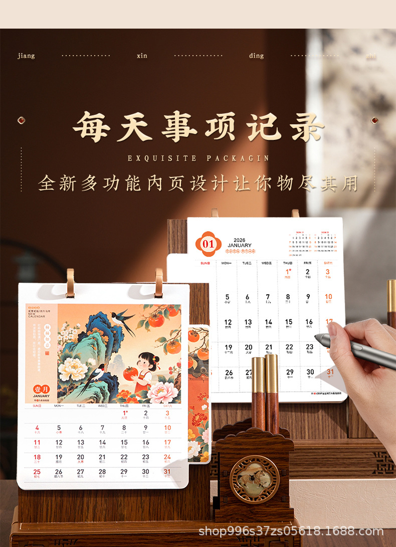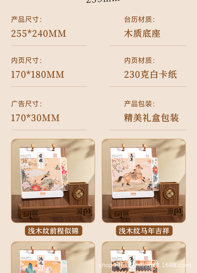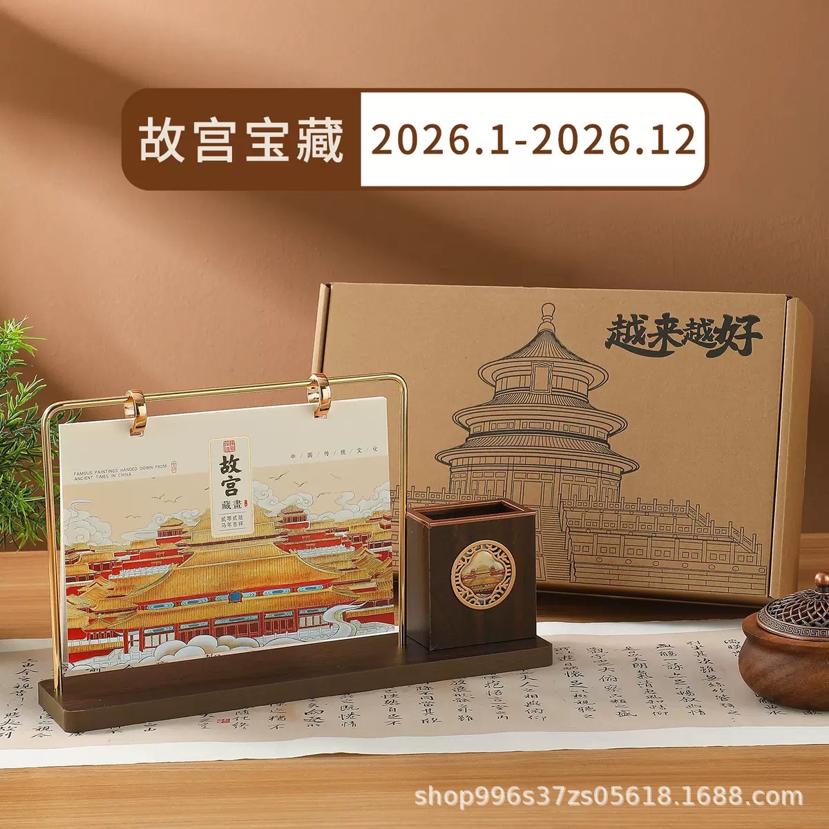 2026年新款台历木质创意马年笔筒中国风打卡办公月历企业印logo