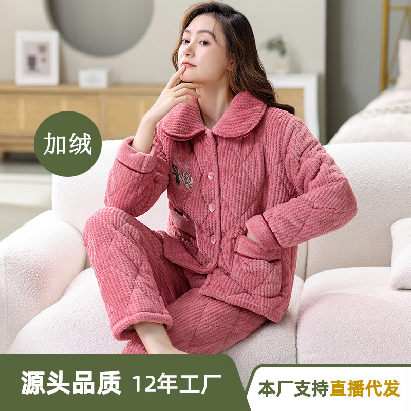 情侣睡衣男女士冬季加绒长袖加厚三层夹棉青年家居服开衫套装棉袄