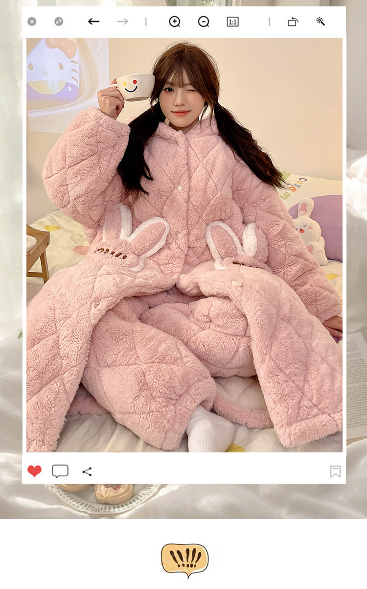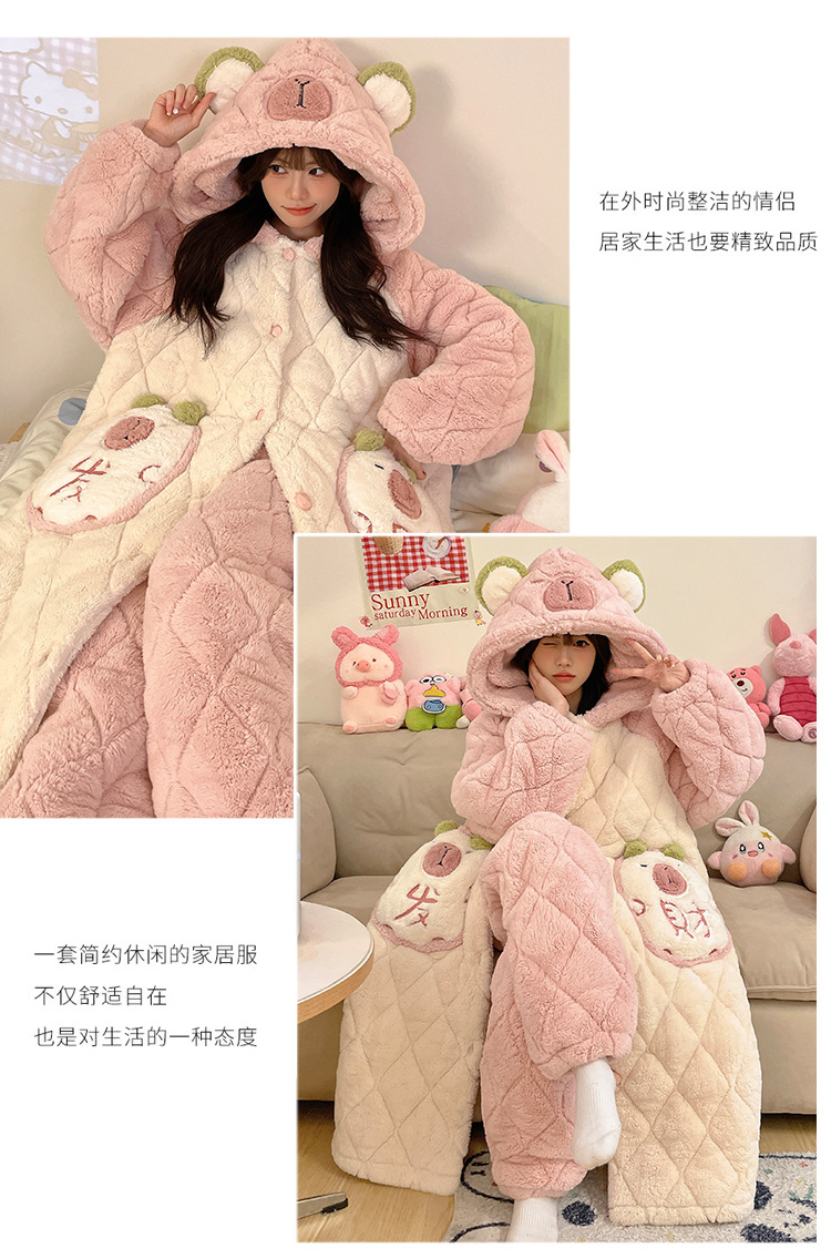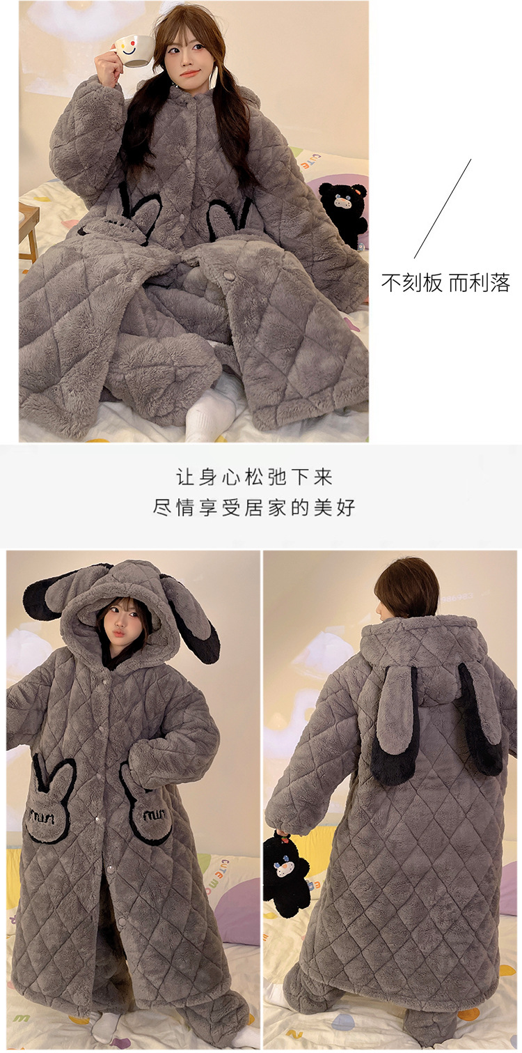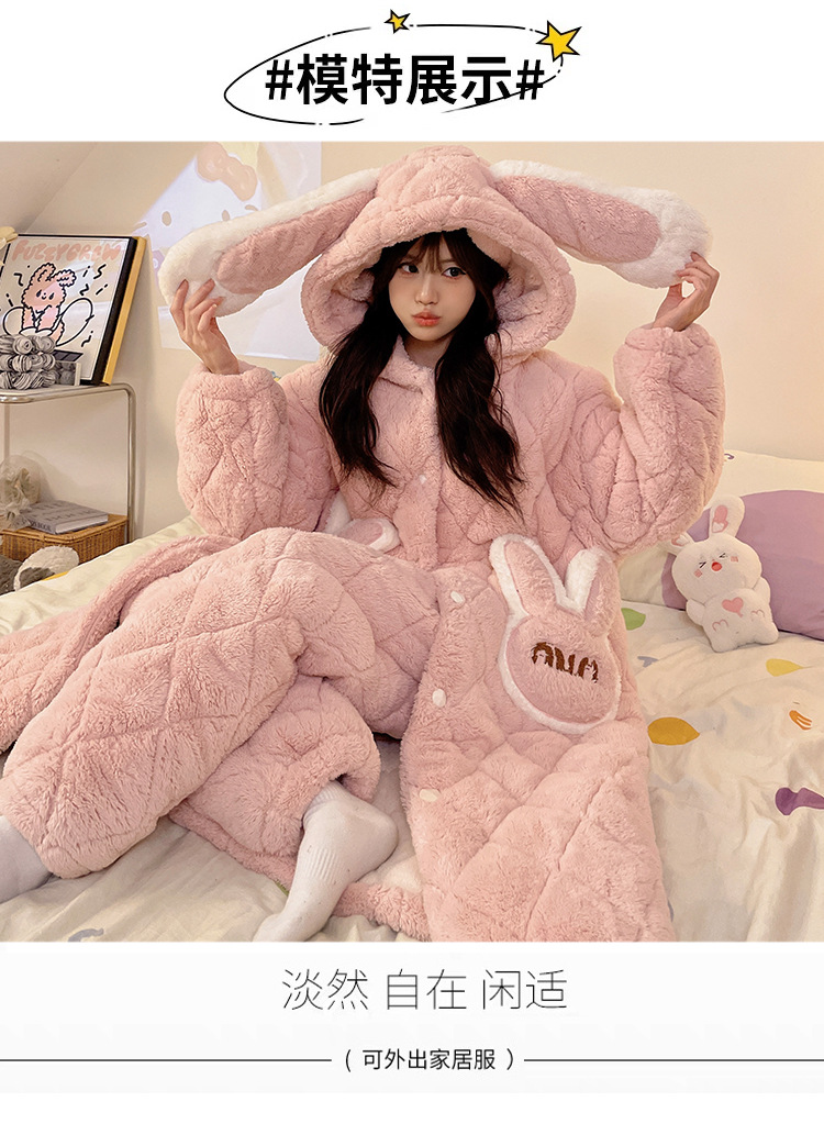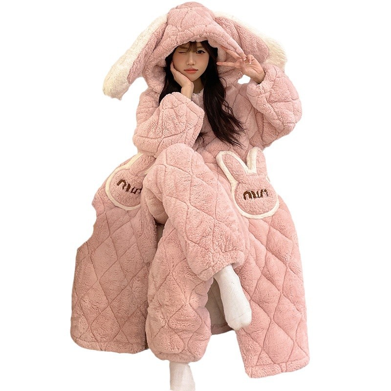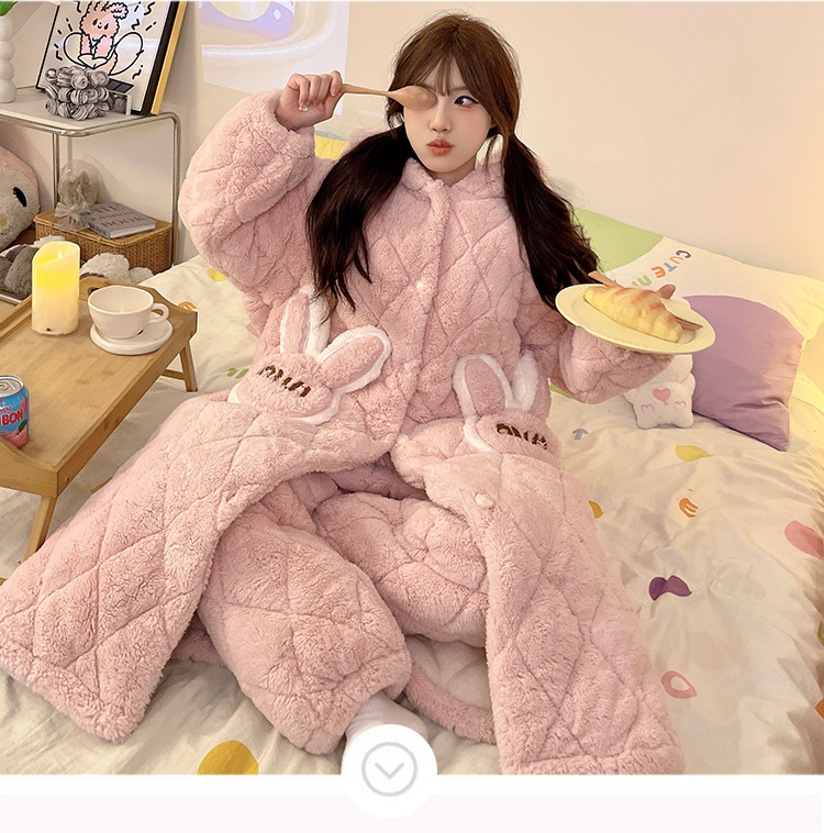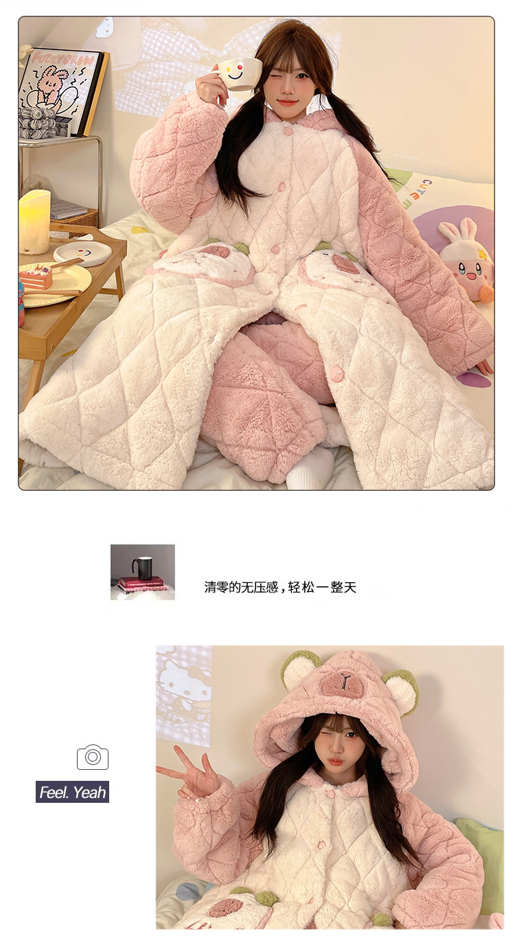 珊瑚绒睡衣女冬季三层夹棉加绒加厚连帽睡袍两件套加肥大码家居服