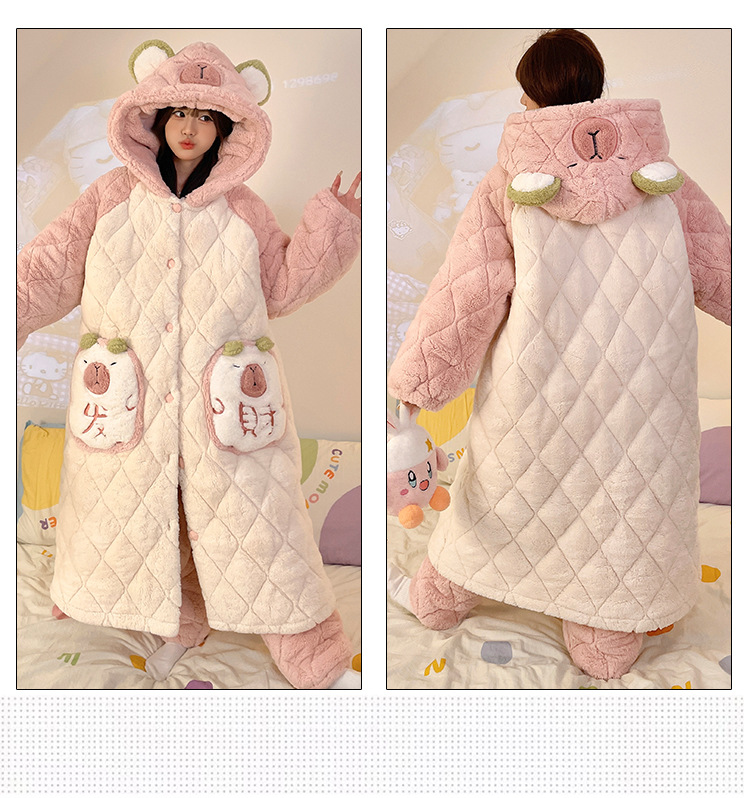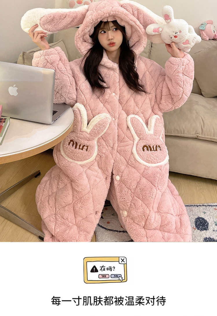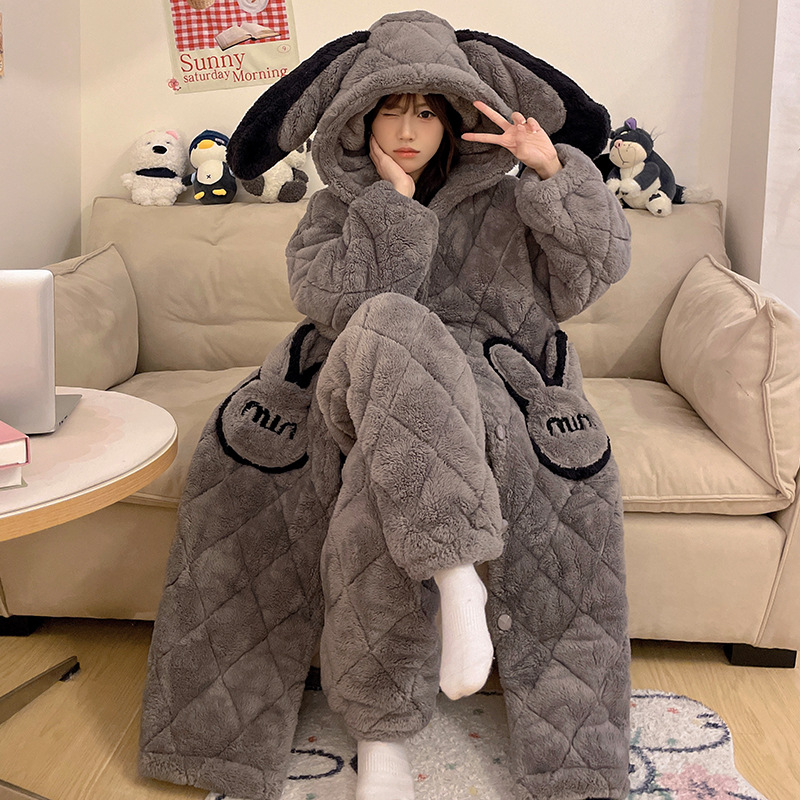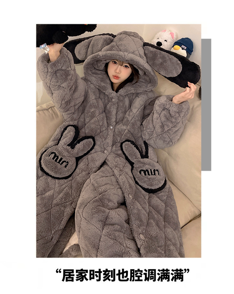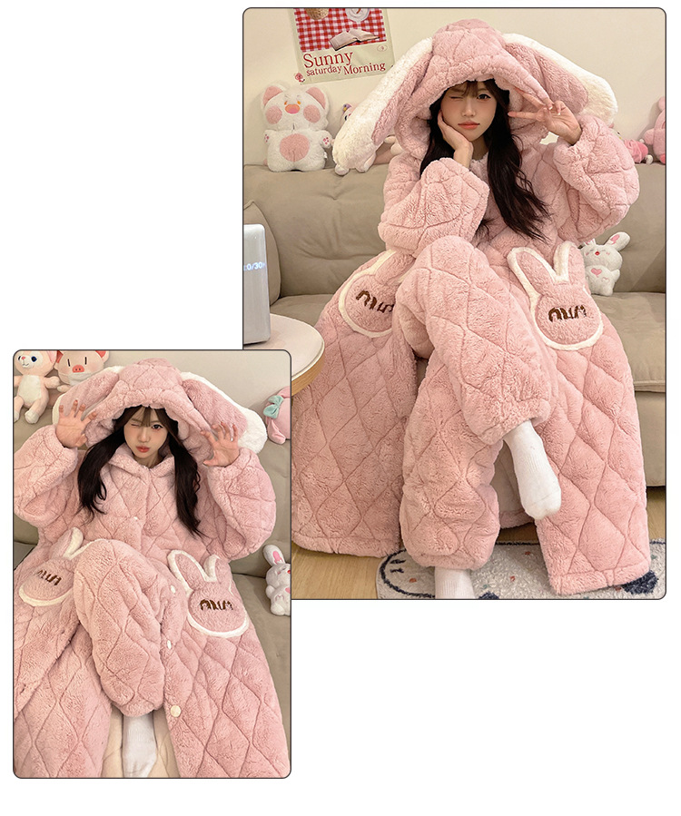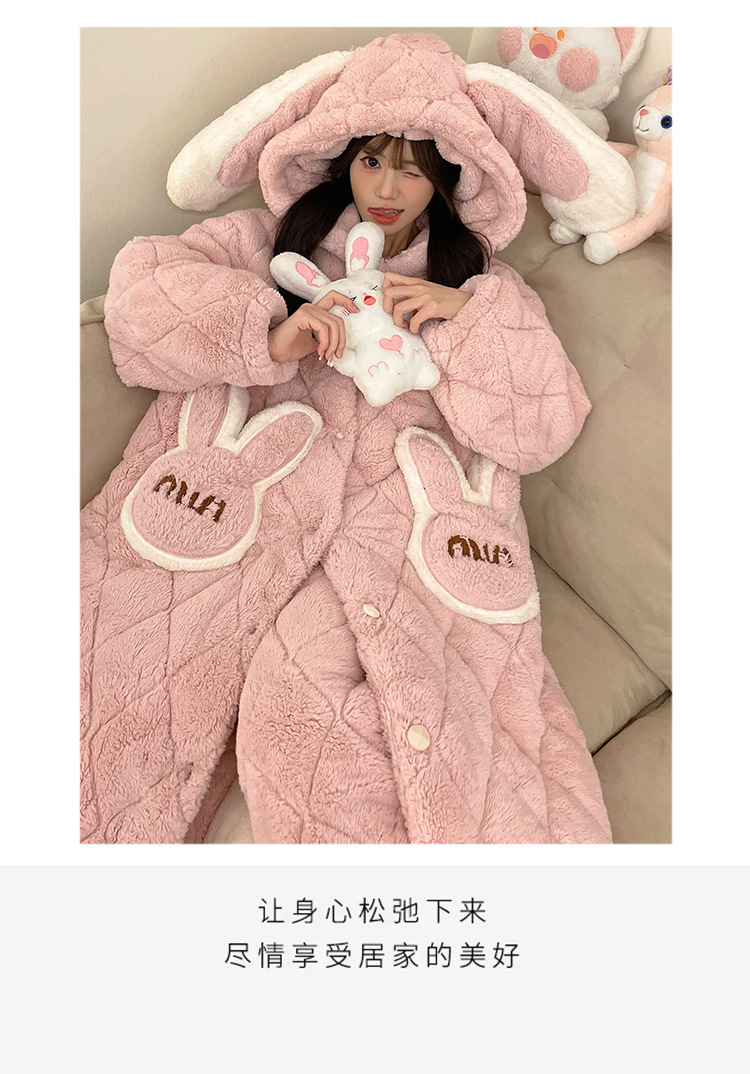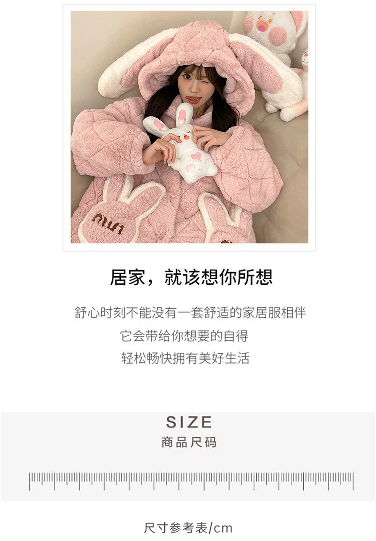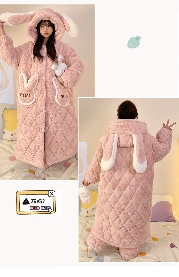 珊瑚绒睡衣女冬季三层夹棉加绒加厚连帽睡袍两件套加肥大码家居服