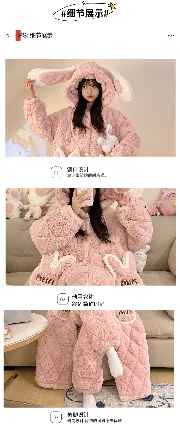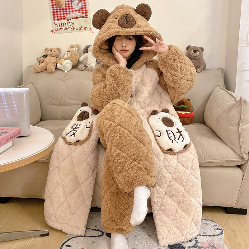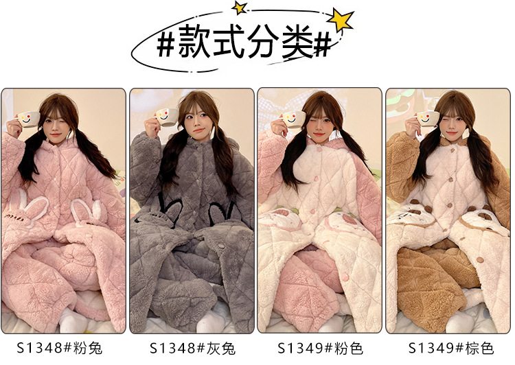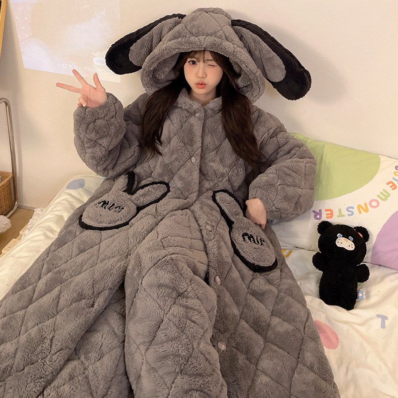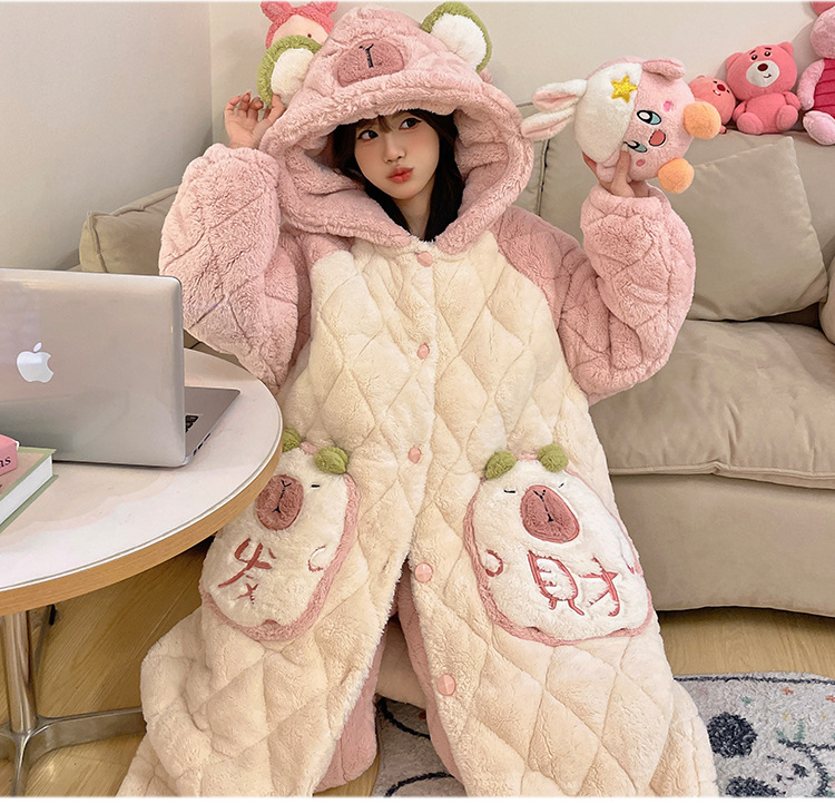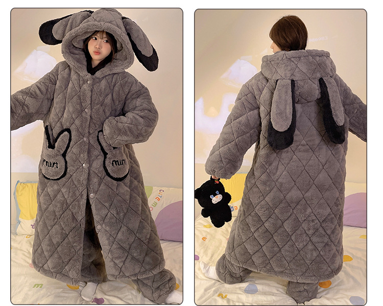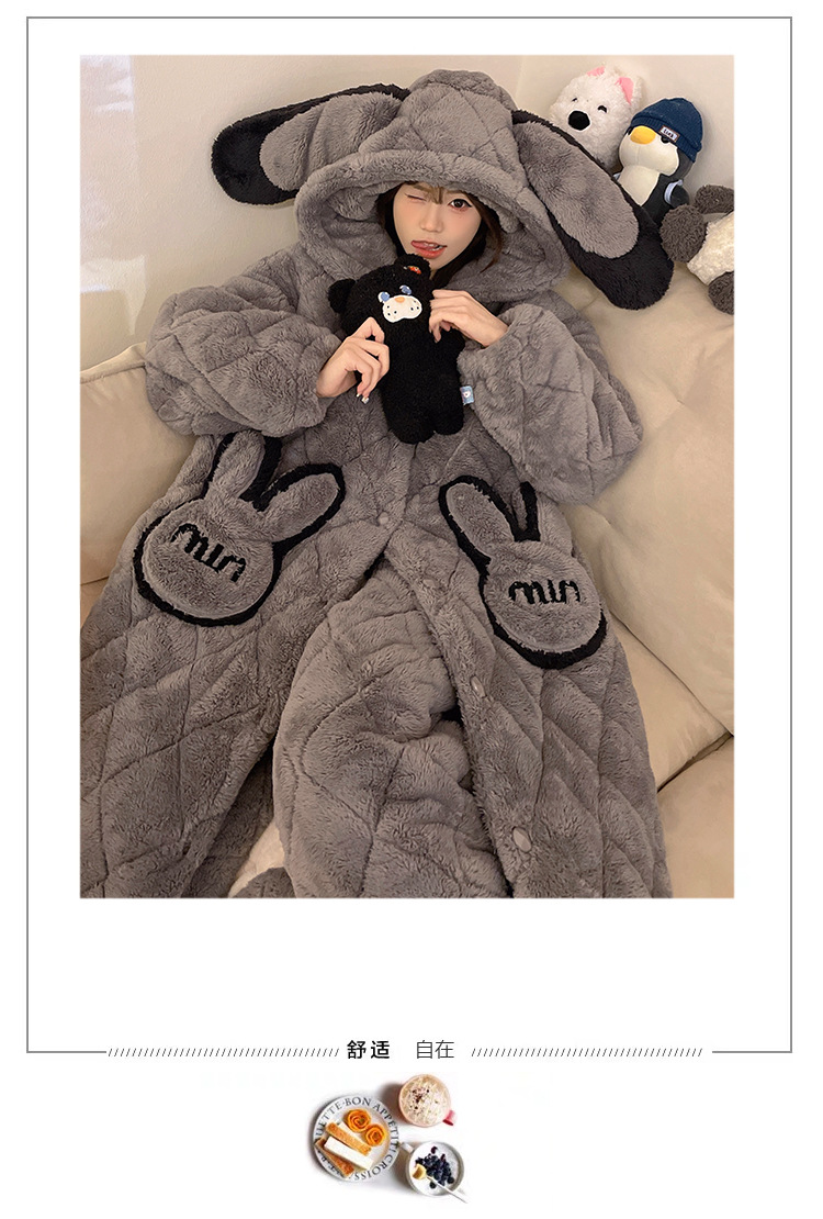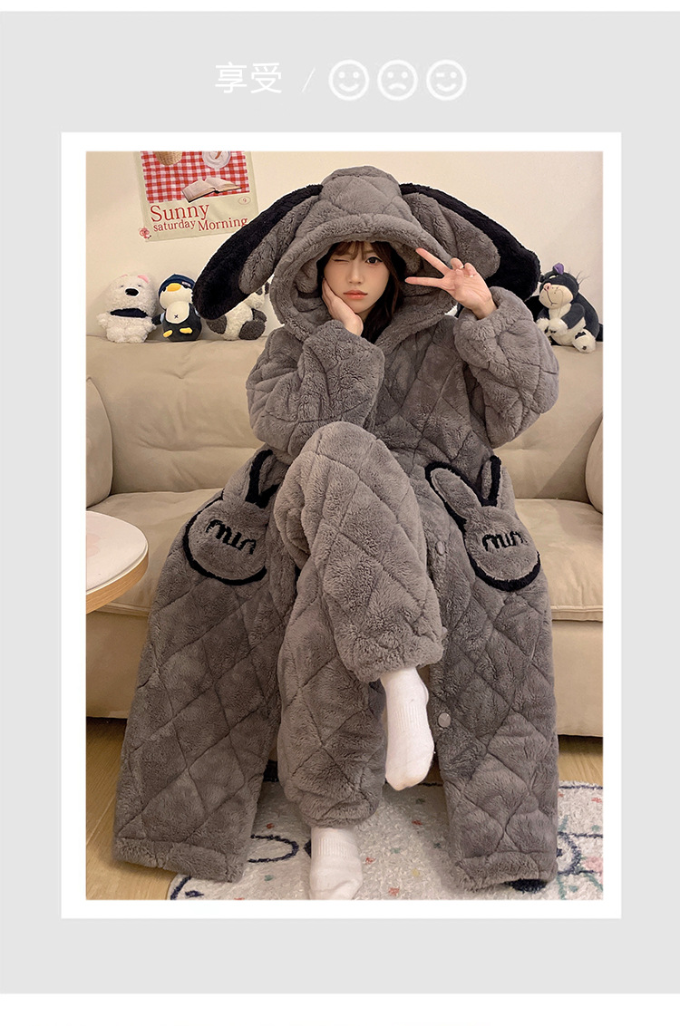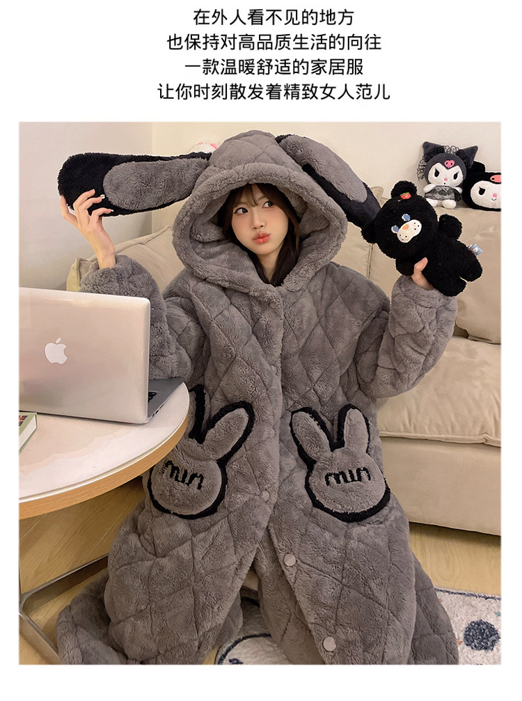 珊瑚绒睡衣女冬季三层夹棉加绒加厚连帽睡袍两件套加肥大码家居服