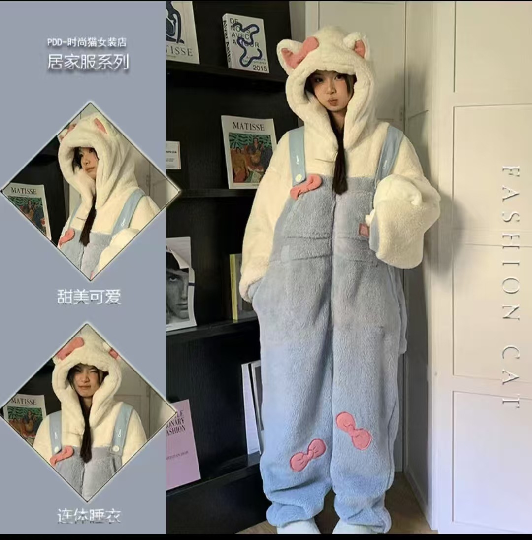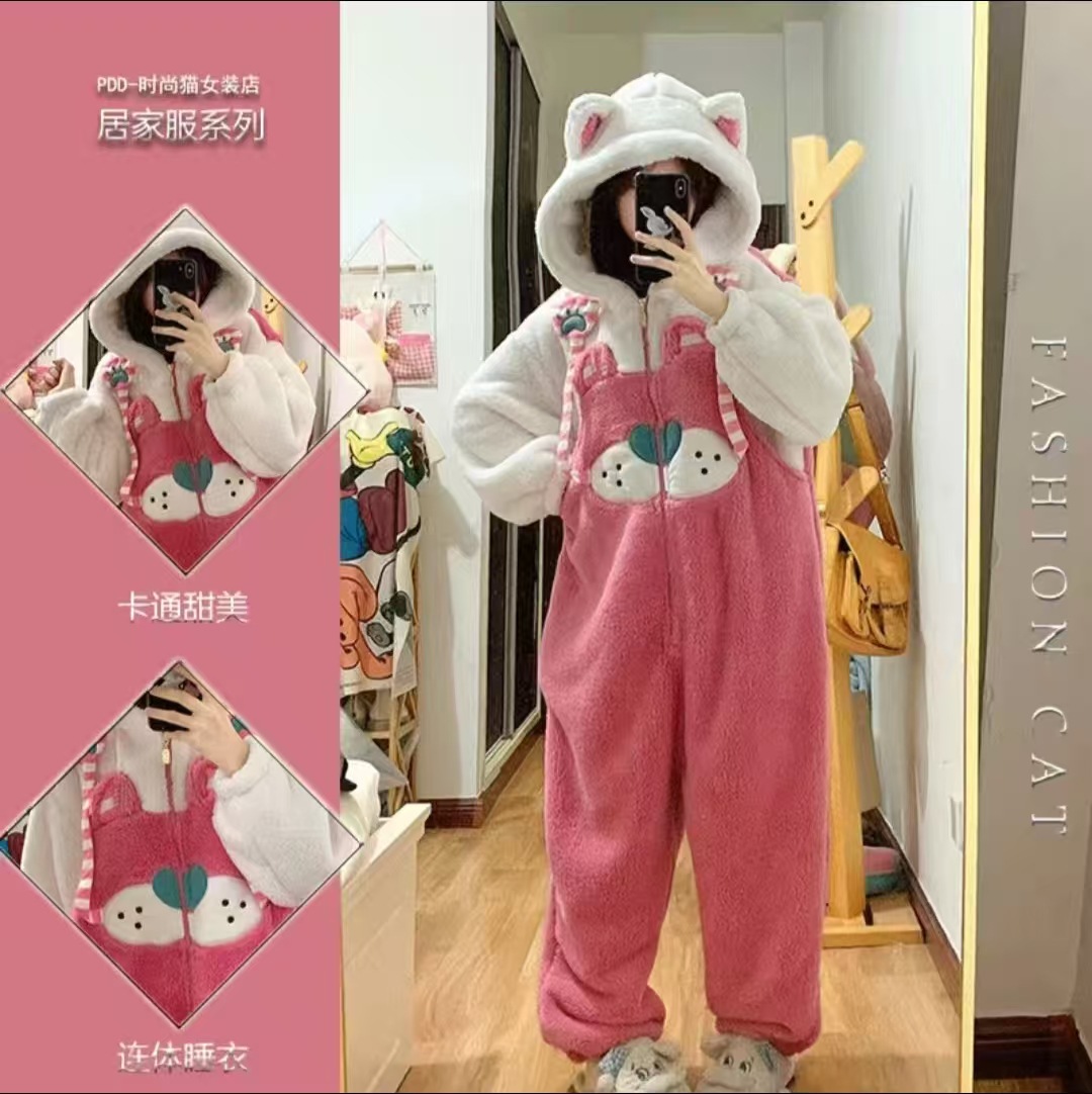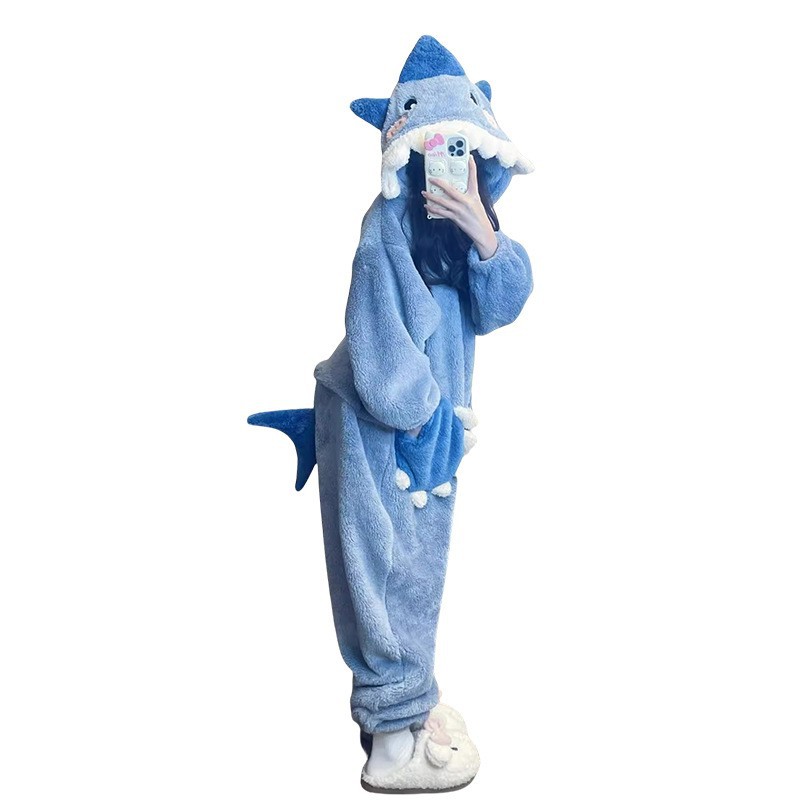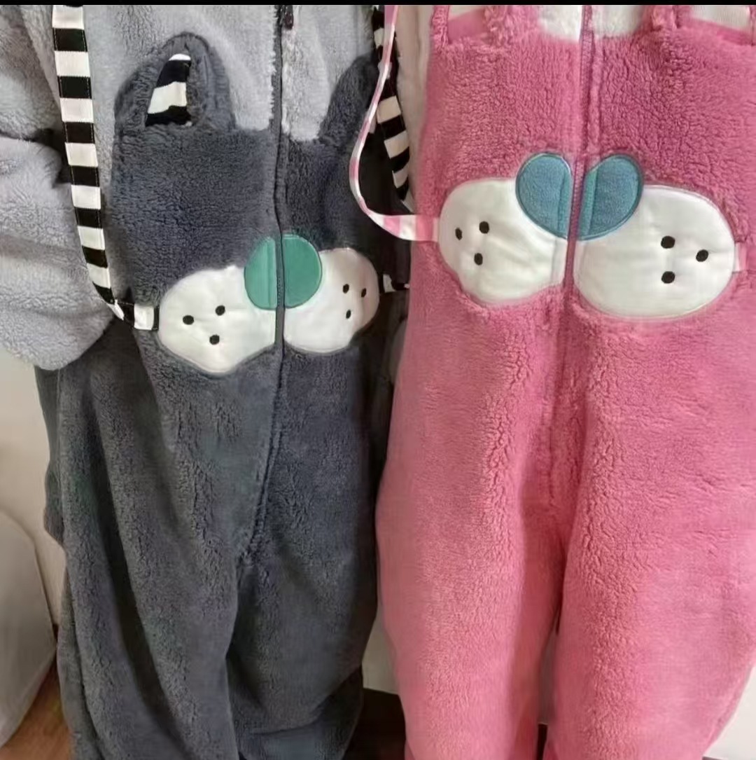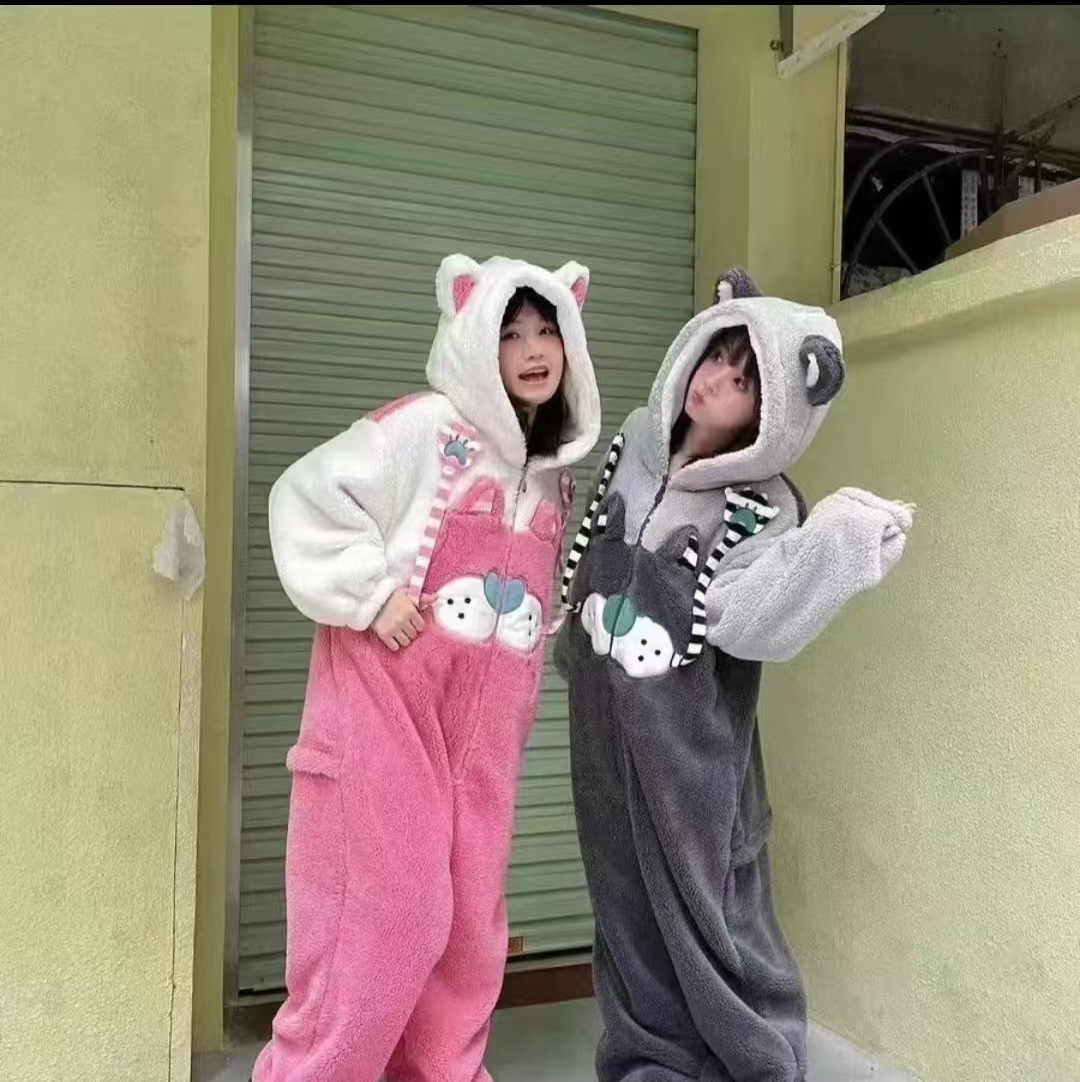 跨境版秋冬珊瑚绒甜美可爱背带熊鲨鱼米奇连帽加厚家居服男女睡衣