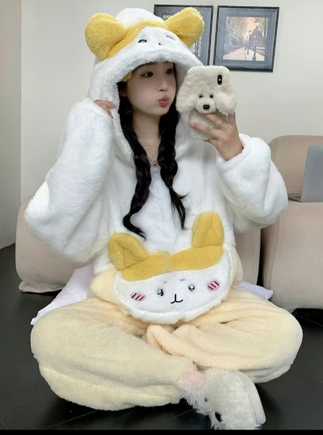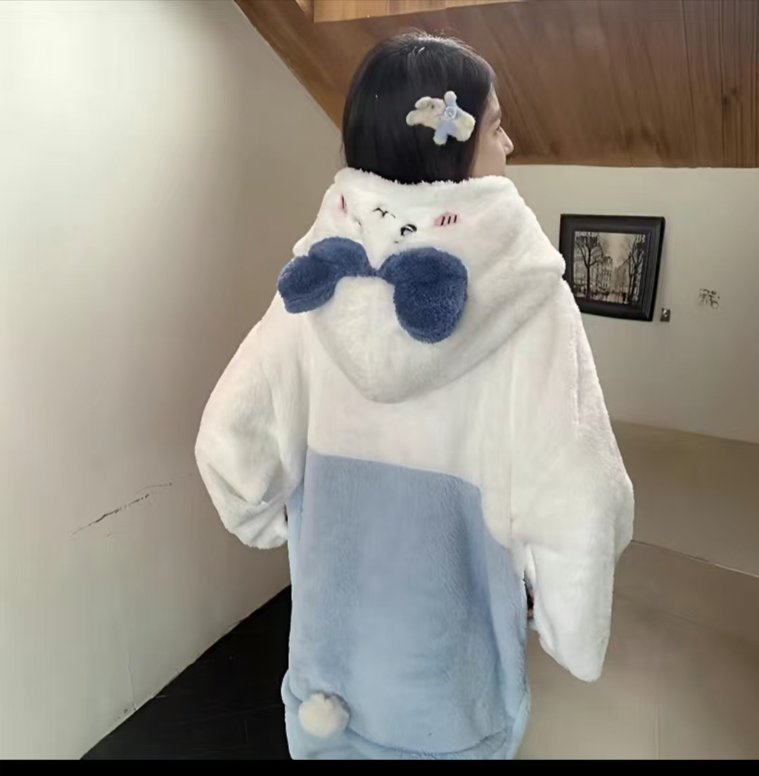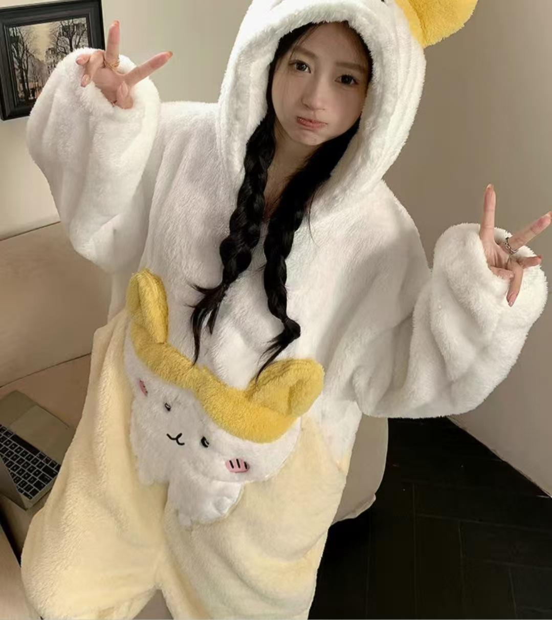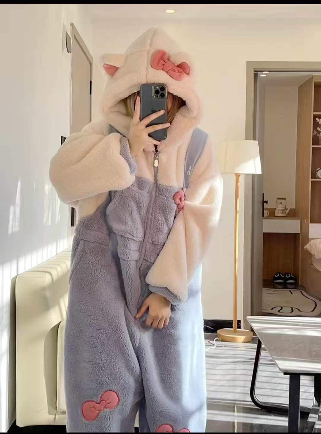 跨境版秋冬珊瑚绒甜美可爱背带熊鲨鱼米奇连帽加厚家居服男女睡衣