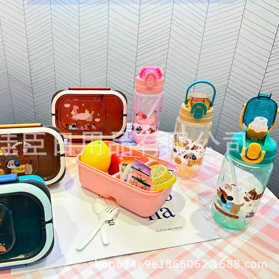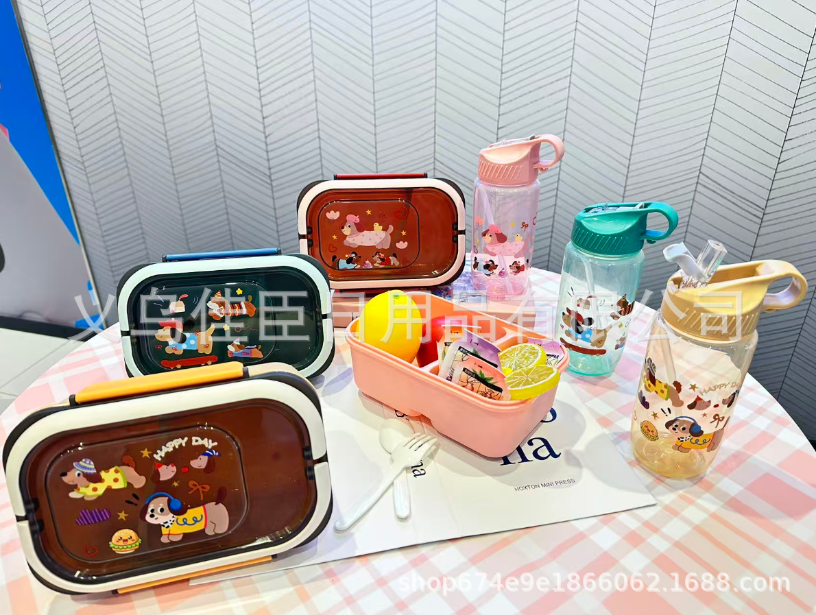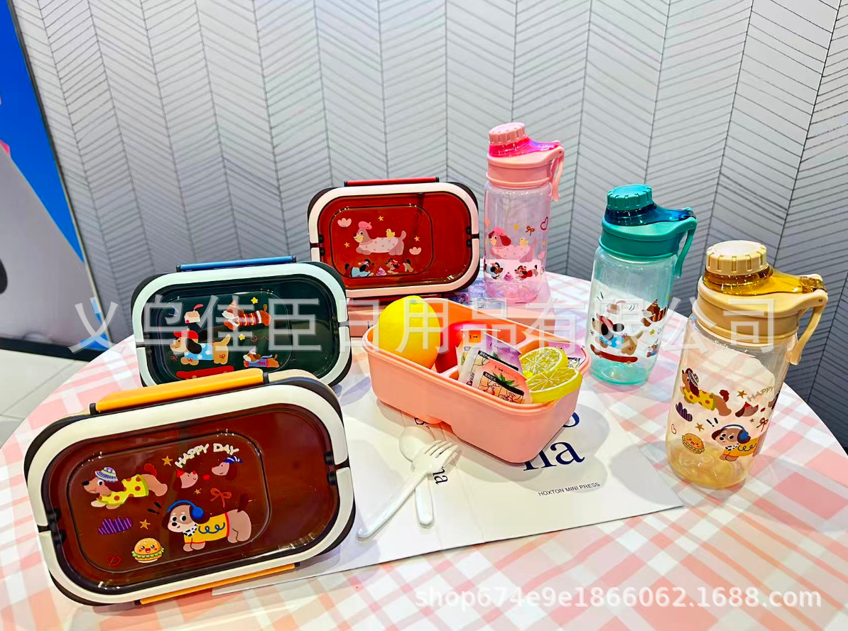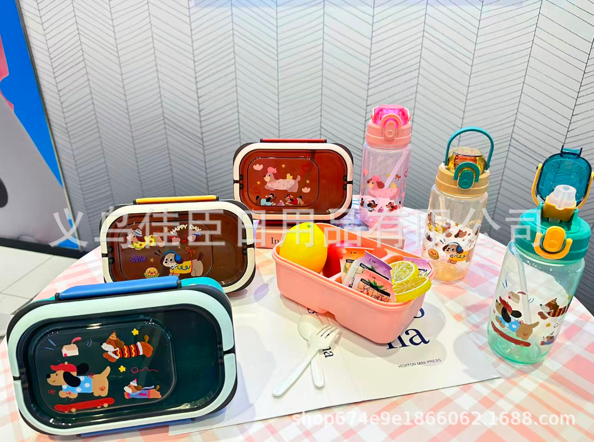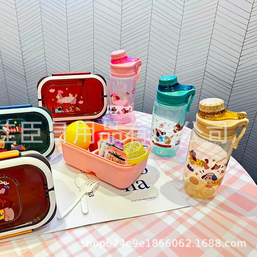 网红腊肠小狗水壶饭盒套装塑料饭盒学生儿童便当带餐具带饭午餐盒